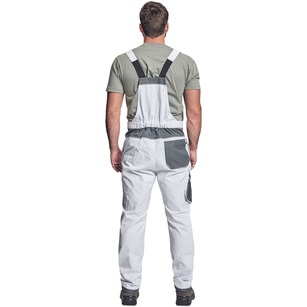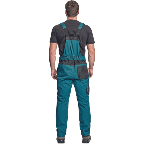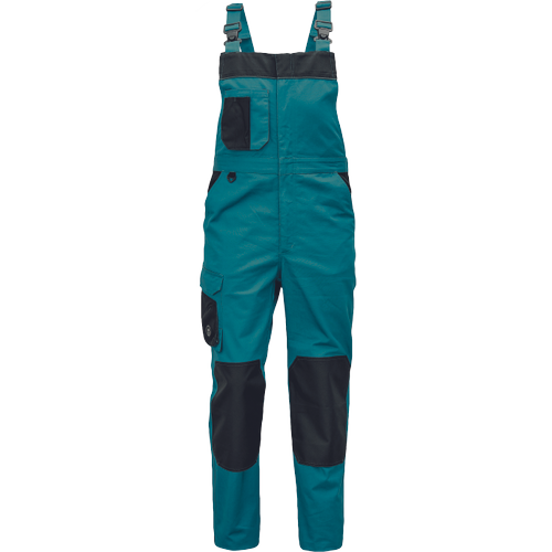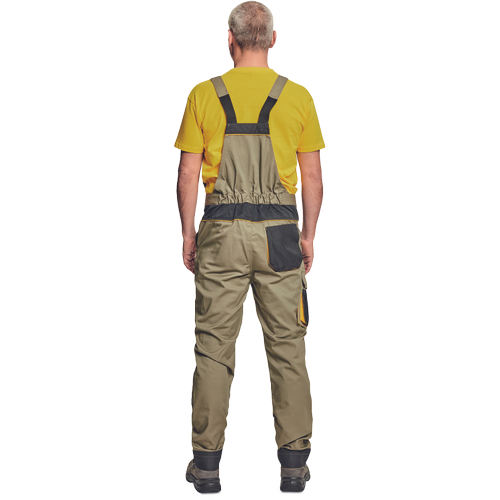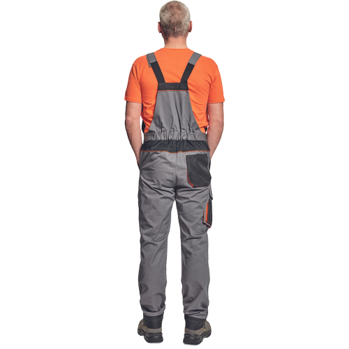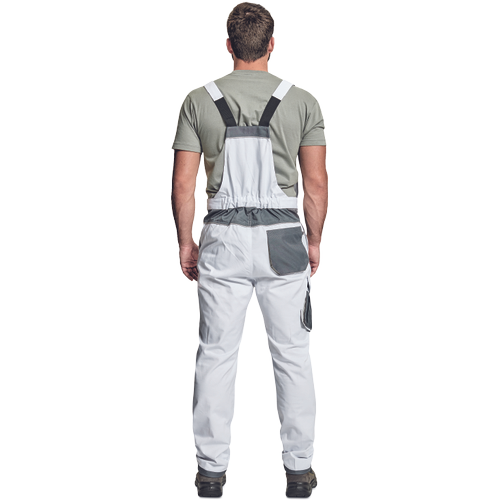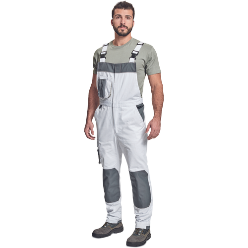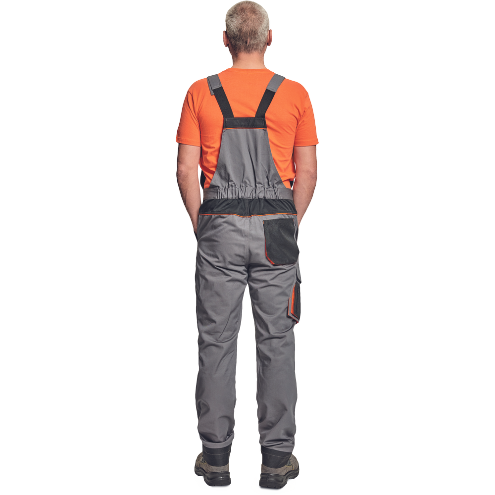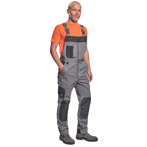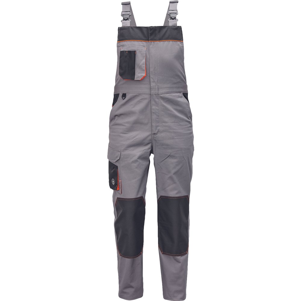 – moške delovne hlače z naprsnikom in elastičnim pasom – ojačani kolenski žepi Oxford 600D z vhodom za kolenske blazinice – 5 večnamenskih žepov – kontrastne obrobe – podaljšana dolžina nogavic
