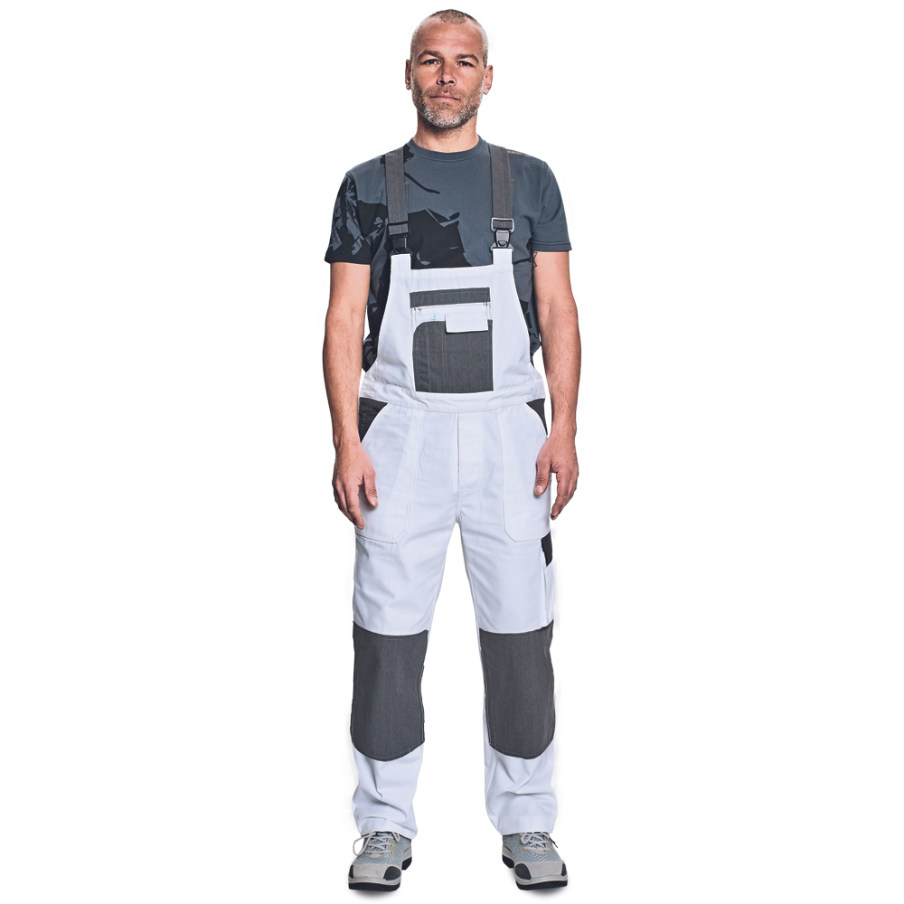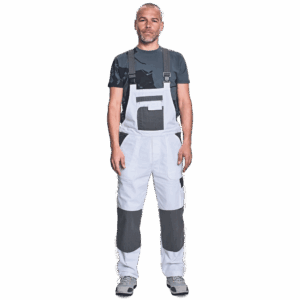 – moške delovne hlače z naprsnikom – 2 stranska žepa v slogu kavbojk na sprednjem delu – 1 stranski žep z zavihkom na velcro – 2 žepa za orodje na drugi nogi – 2 velika žepa z zavihkom na velcro na zadnjem delu – ojačani kolenski deli, primerni za vstavljanje kolenskih blazinic – 1 večnamenski prsni žep z zadrgo – gumbi na straneh – nastavljiva dolžina naramnic – elastičen pas – trojni šivi in trakovi za ojačitev – nastavljiva dolžina nog