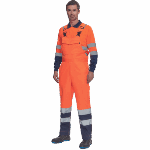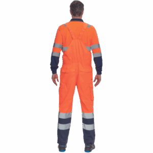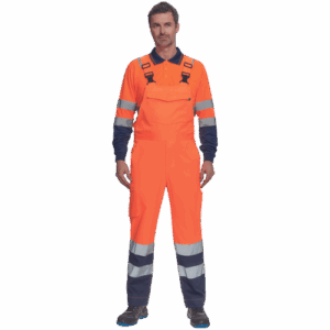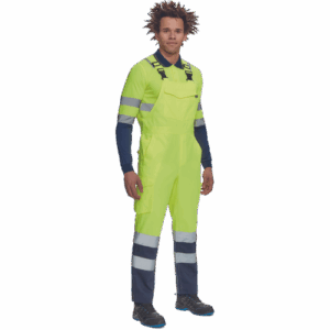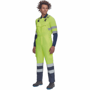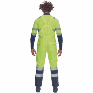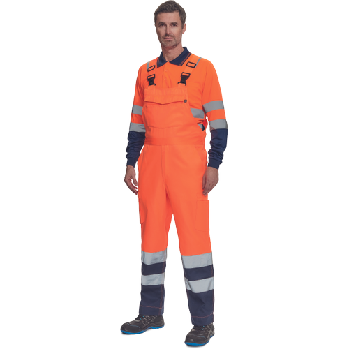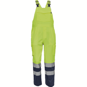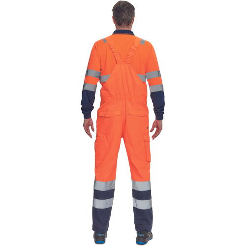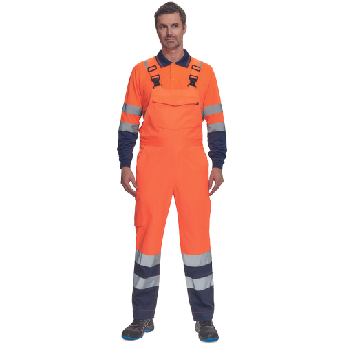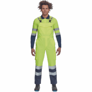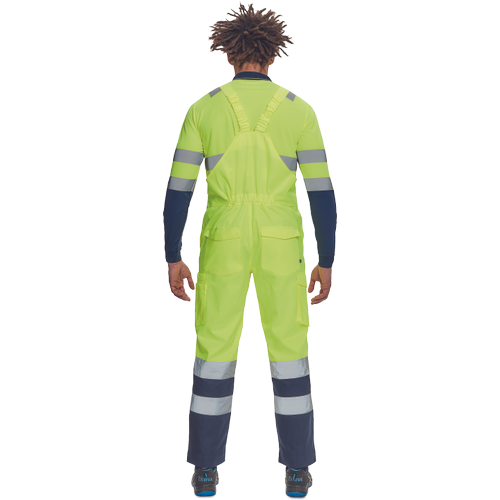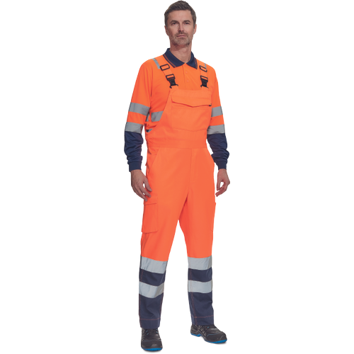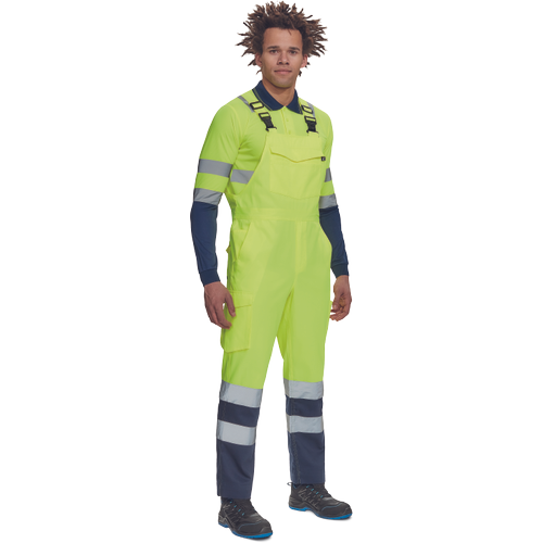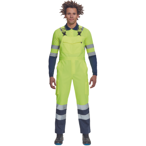 – moške delovne hlače HI-VIS z odsevnimi črtami – elastični del na zadnji strani – 2 stranska žepa, 1 žep za kovance – 2 večnamenska stranska žepa, 2 zadnja žepa – 1 velik večnamenski žep – elastični naramnice z lepljivo zaponko – podaljšana dolžina nog.