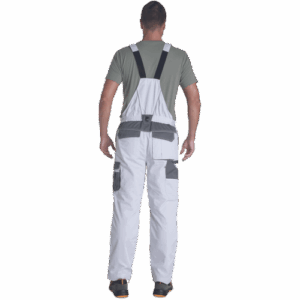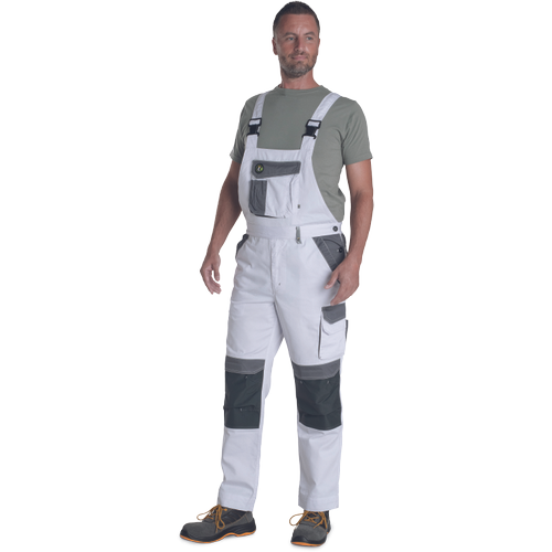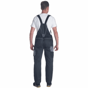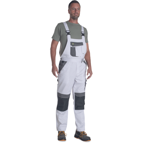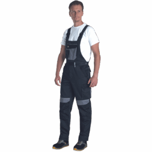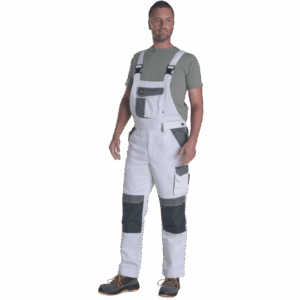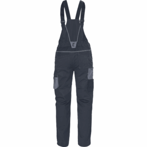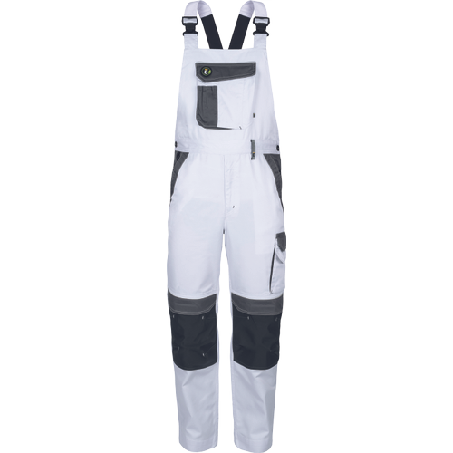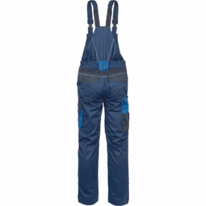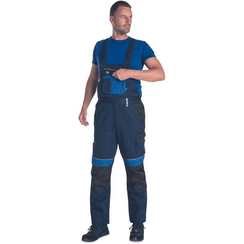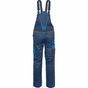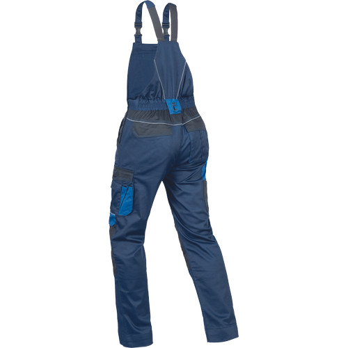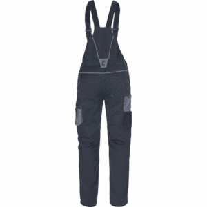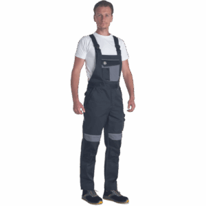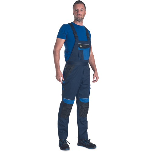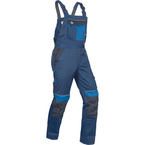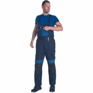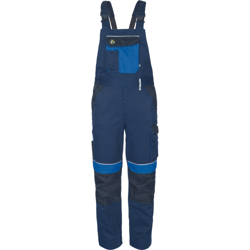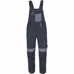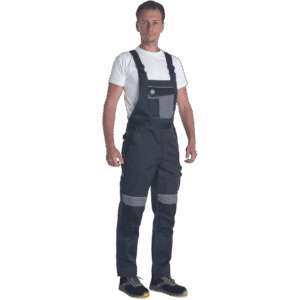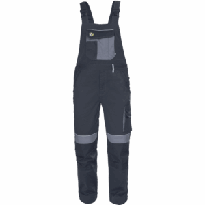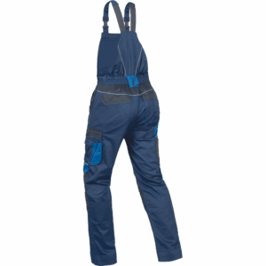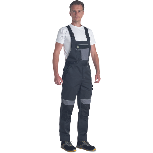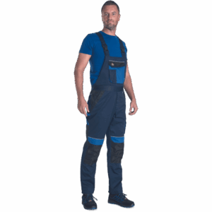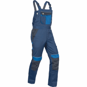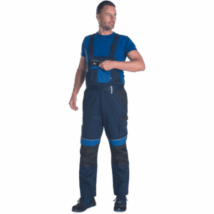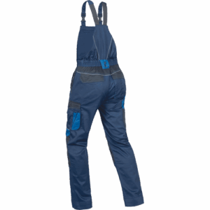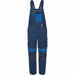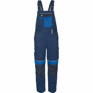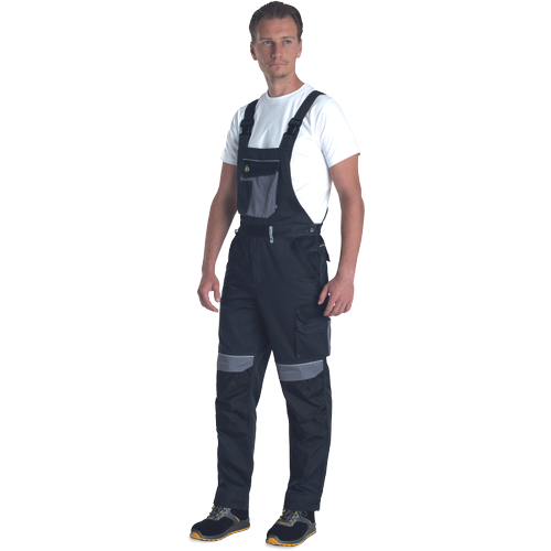 – moške delovne hlače z naprsnikom z elastičnim pasom – 2 stranska žepa – 1 žep na stegnu – 1 prsni žep z velcro zapiranjem – 2 zadnja žepa z velcro zapiranjem – ojačitev kolen z možnostjo vstavitve kolenskih blazinic – odsevni elementi – nastavljiva dolžina noge