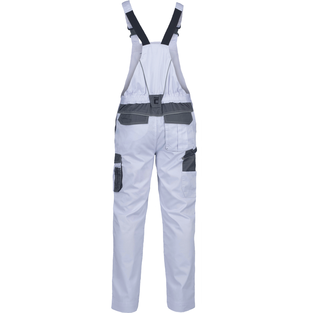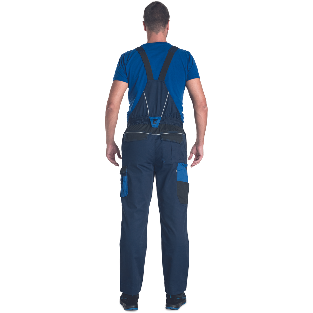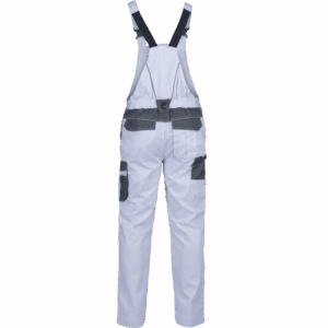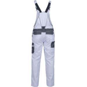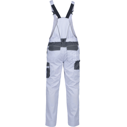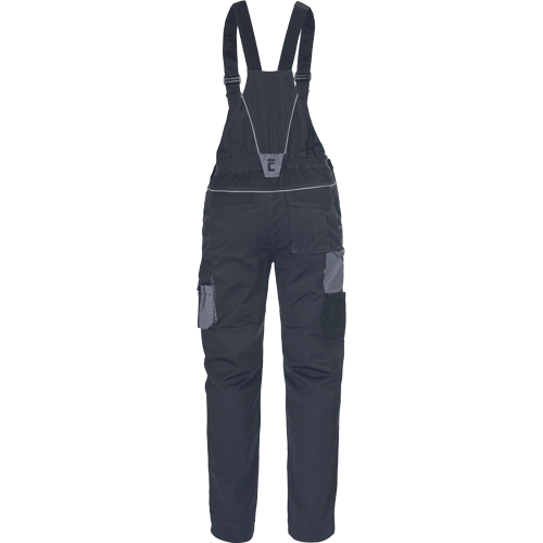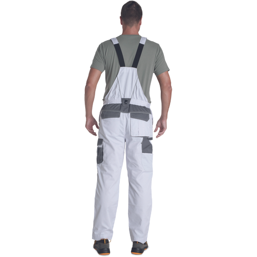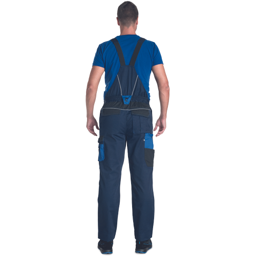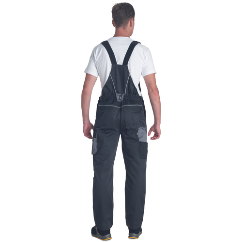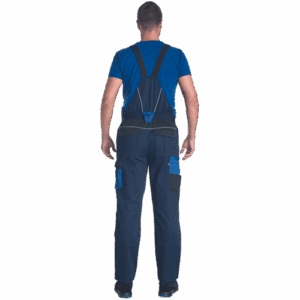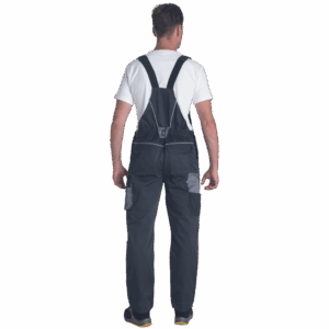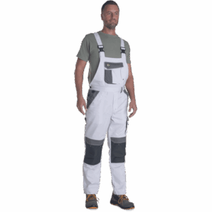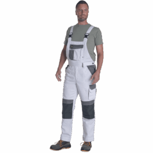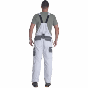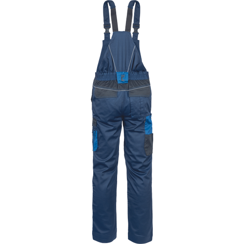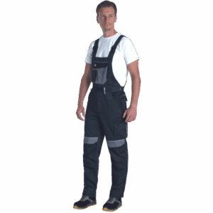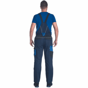 – moške delovne hlače z naprsnikom z elastičnim pasom – 2 stranska žepa – 1 žep na stegnu – 1 prsni žep z velcro zapiranjem – 2 zadnja žepa z velcro zapiranjem – ojačitev kolen z možnostjo vstavitve kolenskih blazinic – odsevni elementi – nastavljiva dolžina noge