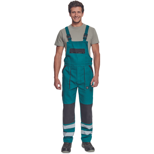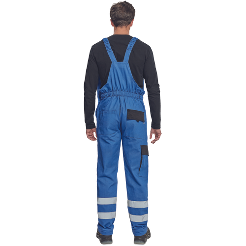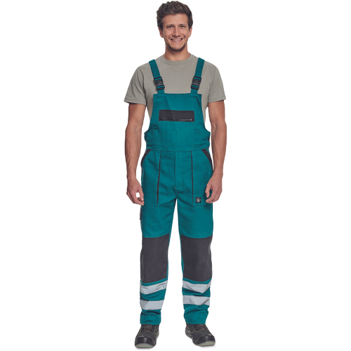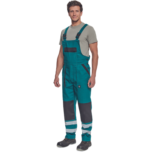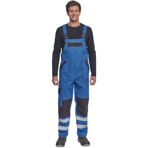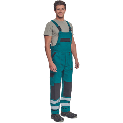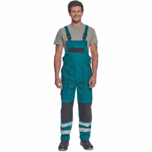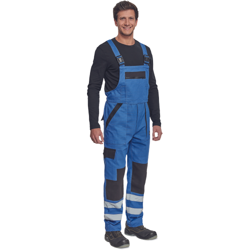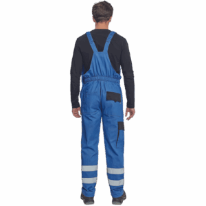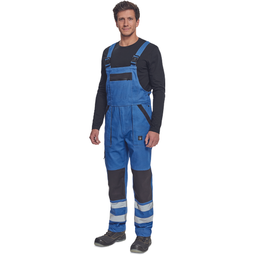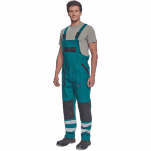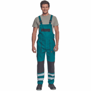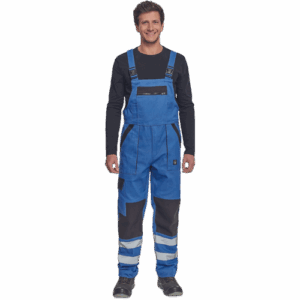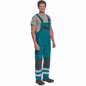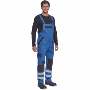 – moške delovne hlače z naprsnikom z elastičnim pasom – široki naramnice s plastičnimi zaponkami – 2 stranska žepa, 1 žep na stegnu – 1 velik prsni žep, 2 zadnja žepa – odsevne črte na spodnjih delih nog – ojačana kolena – podaljšana dolžina nog