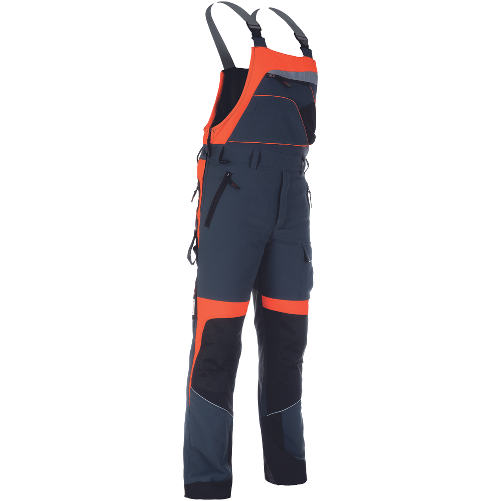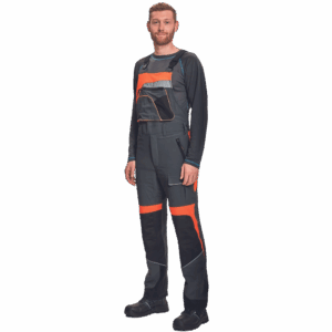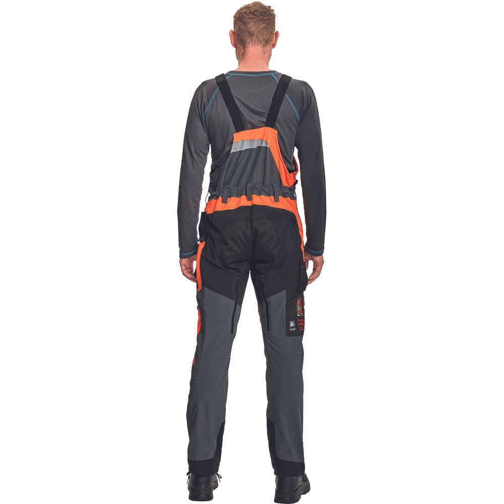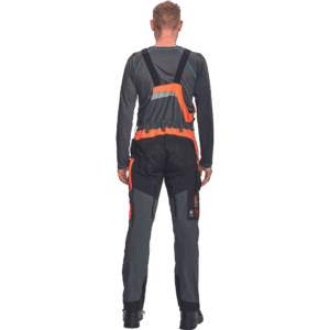 – hlače z naprsnikom iz edinstvene raztegljive tkanine zagotavljajo zračnost in vodoodpornost – sprednji spodnji del je iz trislojnega materiala z membrano, ki zagotavlja vodoodpornost – žep za ključ (za motorno žago) na desni strani hlač – vodoodporne zadrge – odsevni dodatki – majhna teža