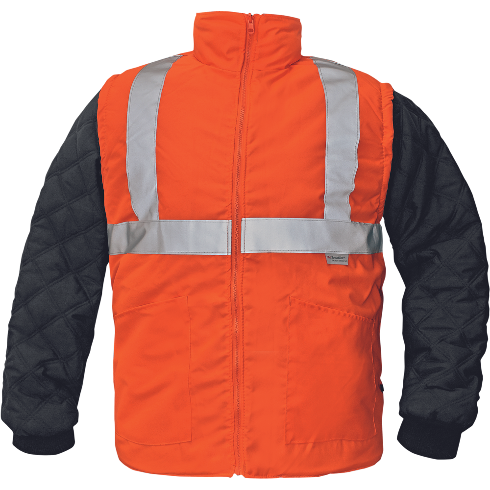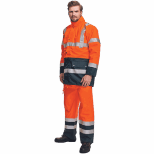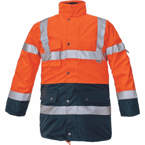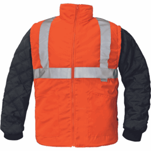 – moška nepremočljiva zimska jakna HI-VIS 4 v 1, zračna – odstranljiva, ločeno nosljiva zgornja vetrovka s kapuco v ovratniku, lepljeni šivi – odsevne črte 3M čez ramena in okoli prsi, bokov in rokavov – 2 velika sprednja žepa, 1 majhen prsni žep – notranja jakna z odstranljivimi rokavi in pletenimi manšetami, lahko se uporablja kot jopič HI-VIS