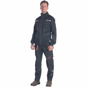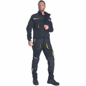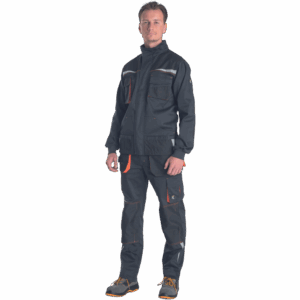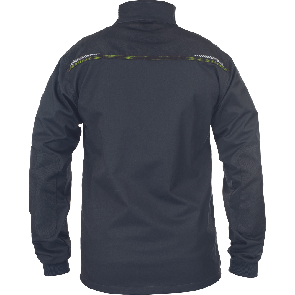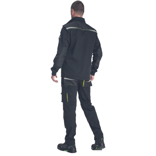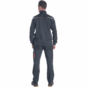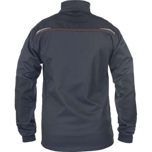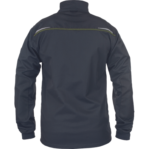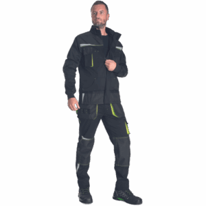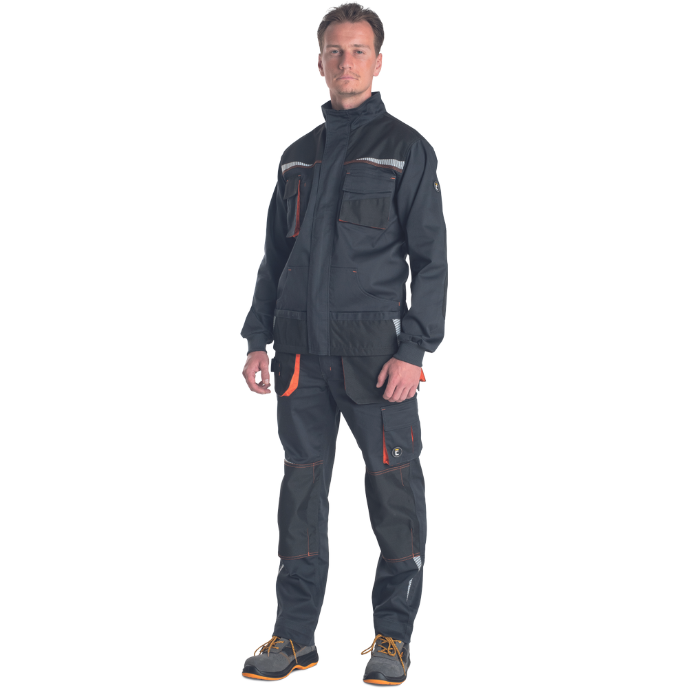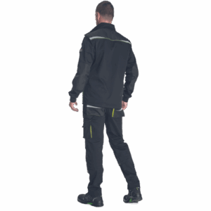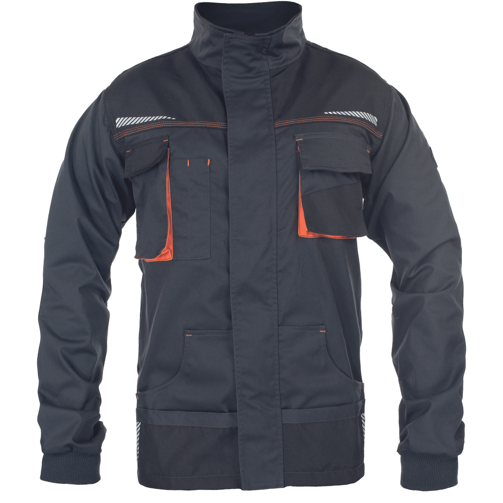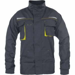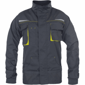 – Moška delovna jakna iz zelo trpežne raztegljive tkanine – sprednje zapiranje na zadrgo z zaščitnim plaščem – 2 stranska žepa – 2 prsna žepa, vključno z žepom za mobilni telefon – ojačani deli ramen in komolcev iz materiala Oxford 600D – potiskani odsevni elementi – pletene elastične manšete na rokavih