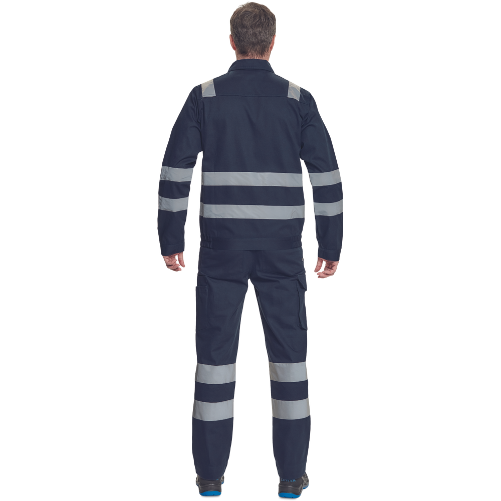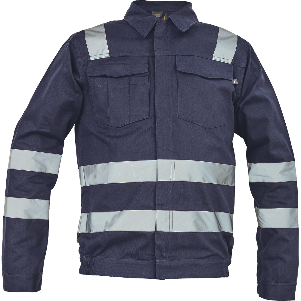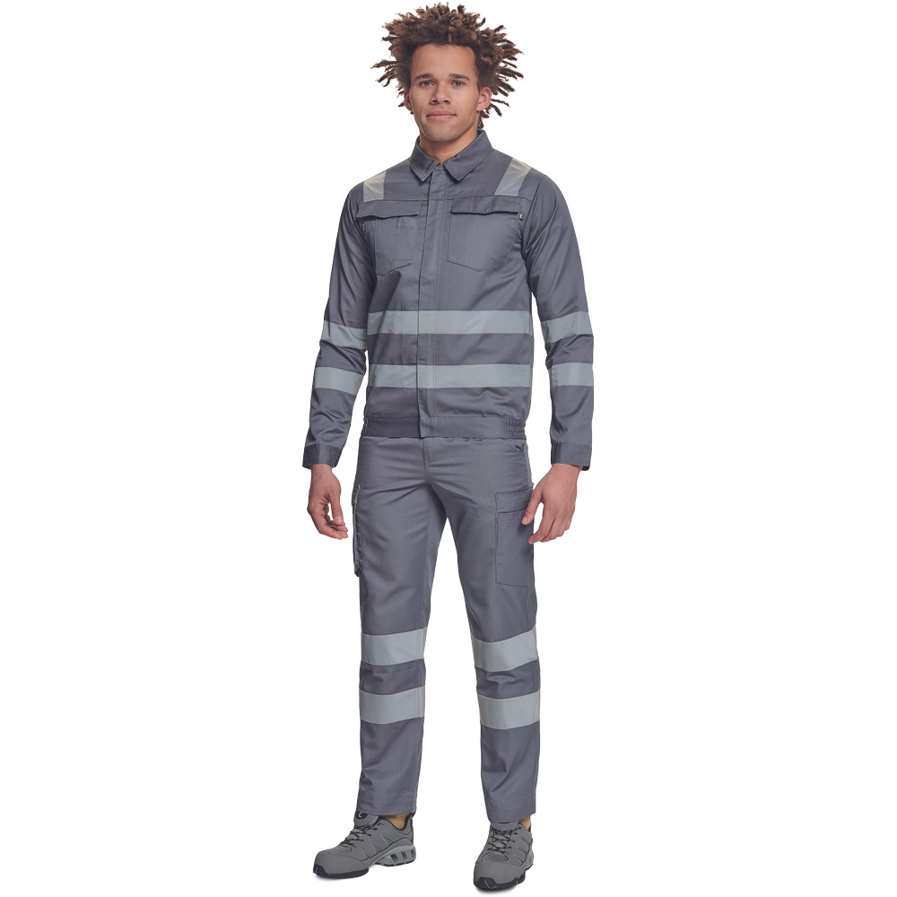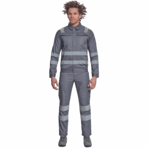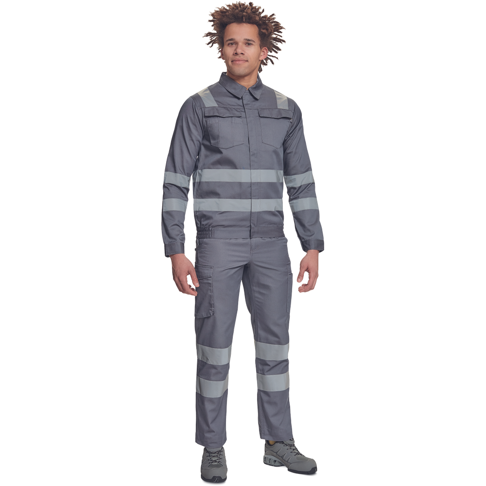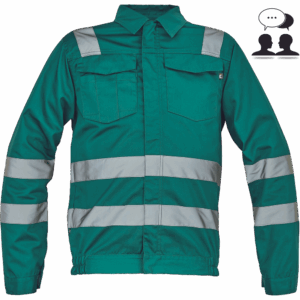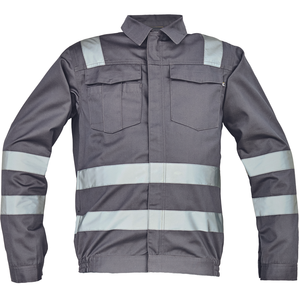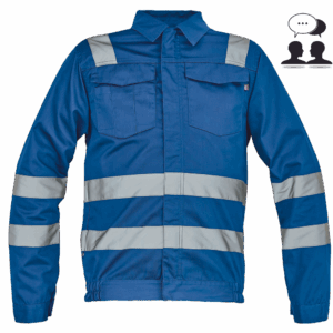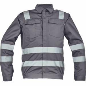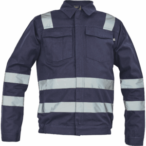 – moška lahka delovna jakna z odsevnimi črtami na ramenih, rokavih in spodnjem delu – zapiranje na zadrgo, prekrito z velcro zaponko – 2 velika prsna žepa z zavihkom – elastičen spodnji del na straneh – manšeta na rokavu z velcro zaponko