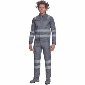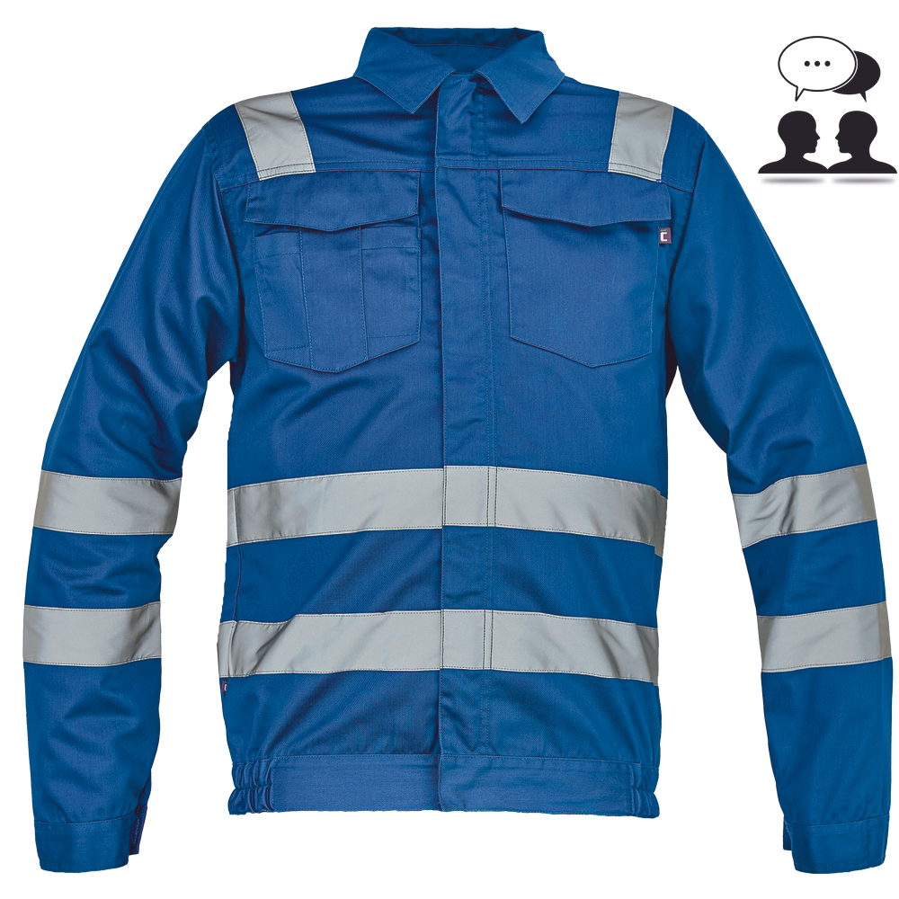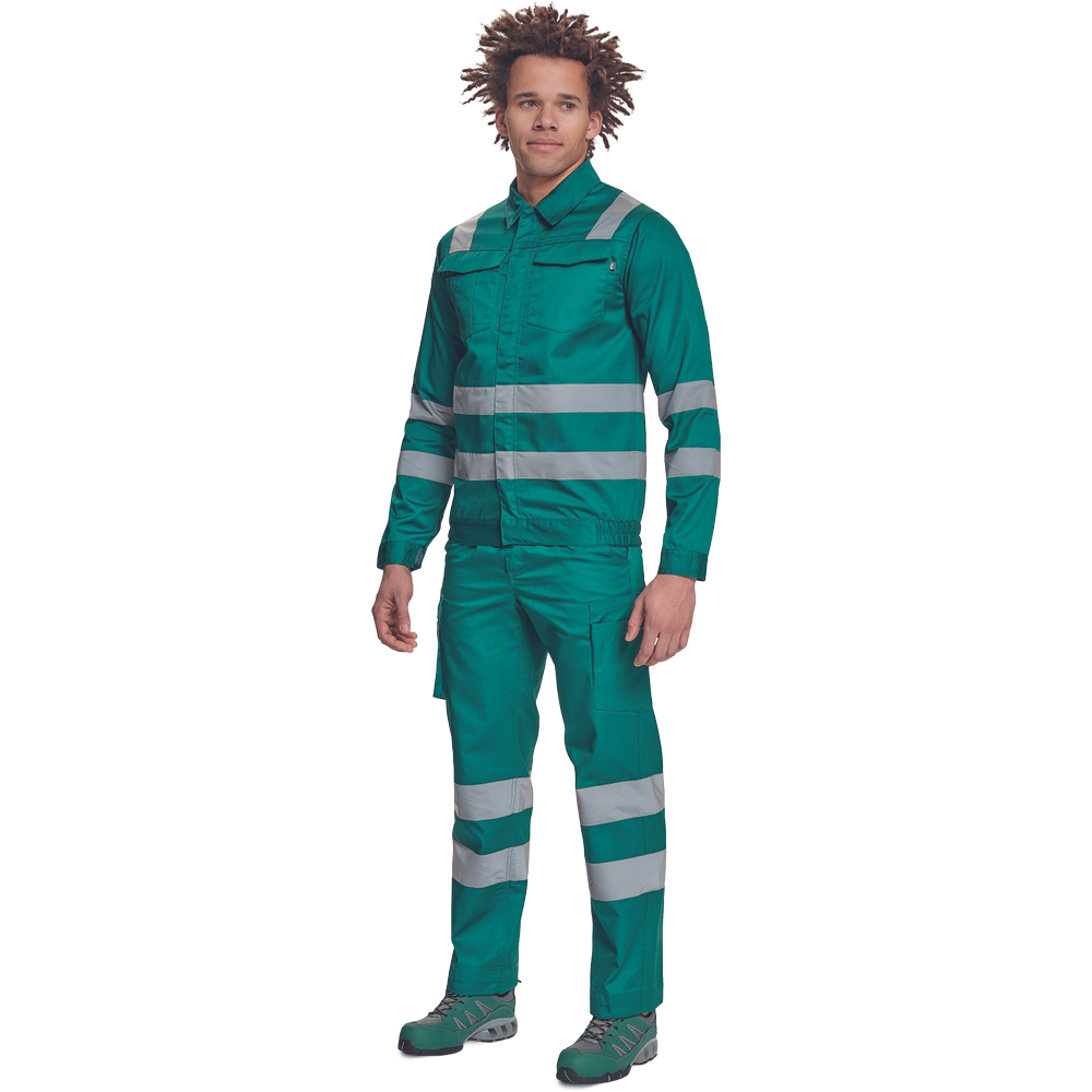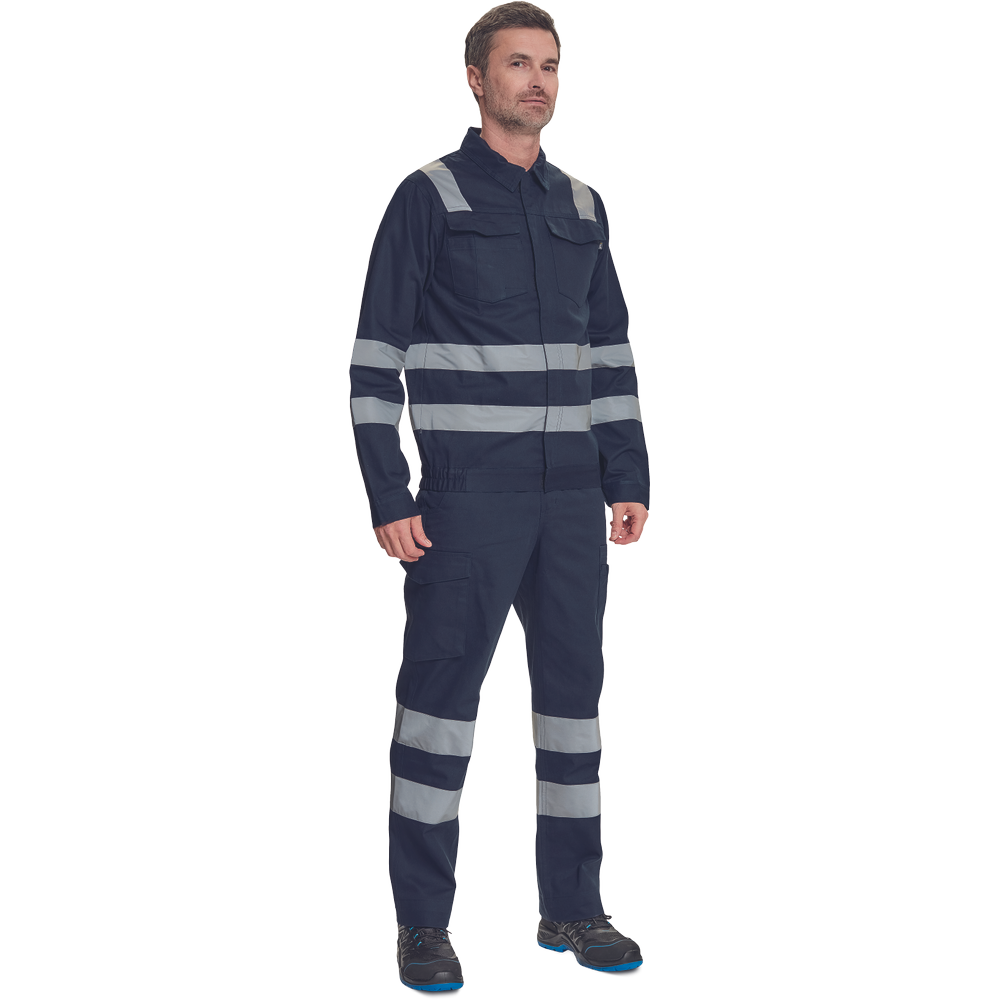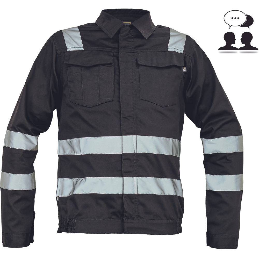 – moška lahka delovna jakna z odsevnimi črtami na ramenih, rokavih in spodnjem delu – zapiranje na zadrgo, prekrito z velcro zaponko – 2 velika prsna žepa z zavihkom – elastičen spodnji del na straneh – manšeta na rokavu z velcro zaponko
