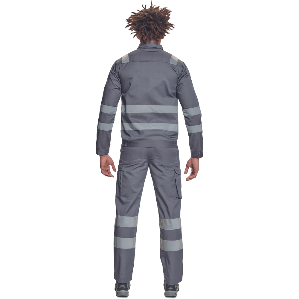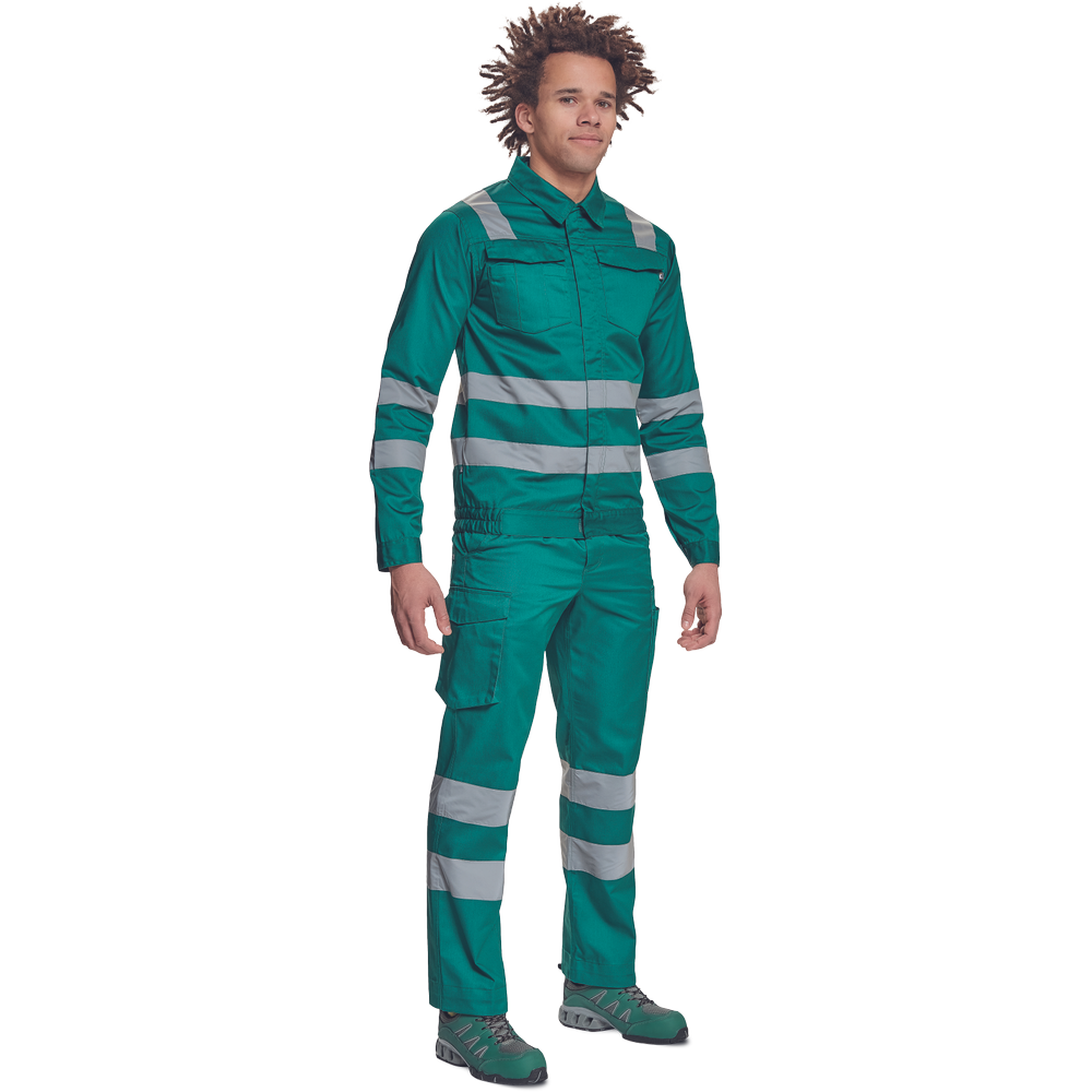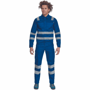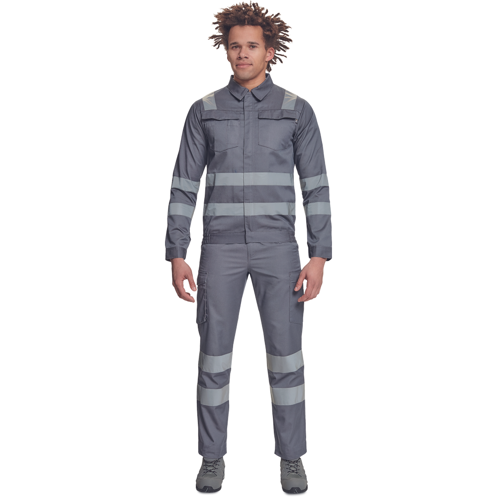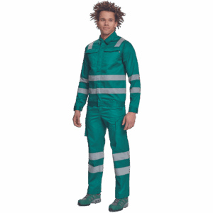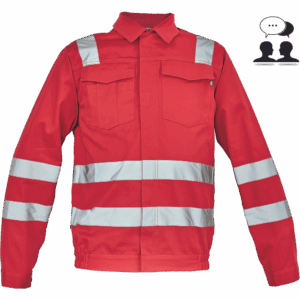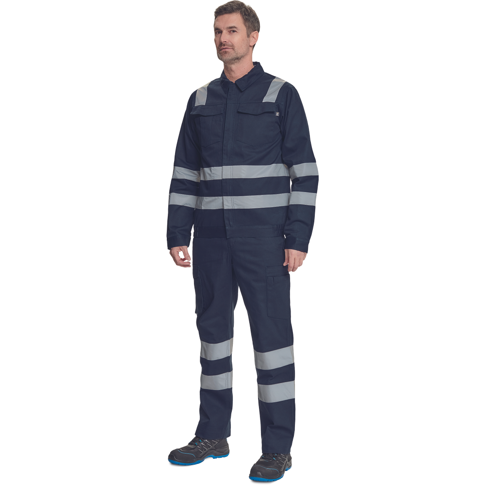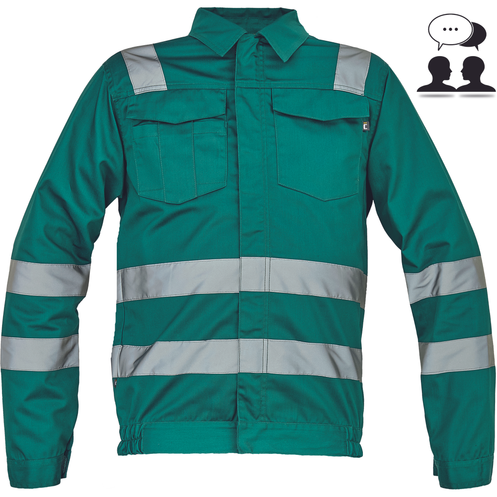 – moška lahka delovna jakna z odsevnimi črtami na ramenih, rokavih in spodnjem delu – zapiranje na zadrgo, prekrito z velcro zaponko – 2 velika prsna žepa z zavihkom – elastičen spodnji del na straneh – manšeta na rokavu z velcro zaponko
