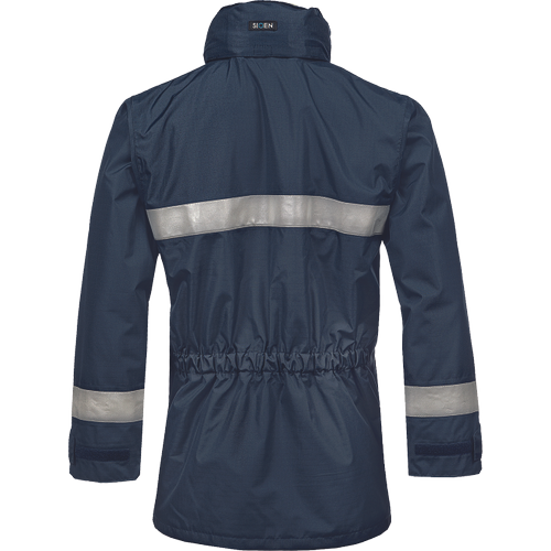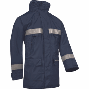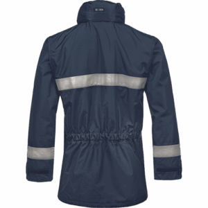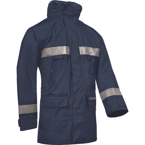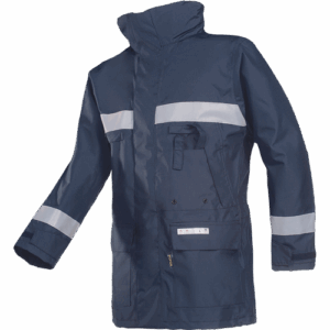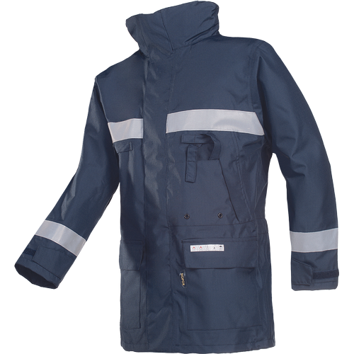 – negorljiva, antistatična dežna jakna – raven ovratnik z zložljivo kapuco – zapiranje na zadrgo pod zavihkom – 2 vstavljena prsna žepa – 2 našita žepa z zavihki – 1 žep za telefon, 1 žep Napoleon – 1 notranji žep na zadrgo – negorljivi odsevni trakovi – možnost vezenja na hrbtu