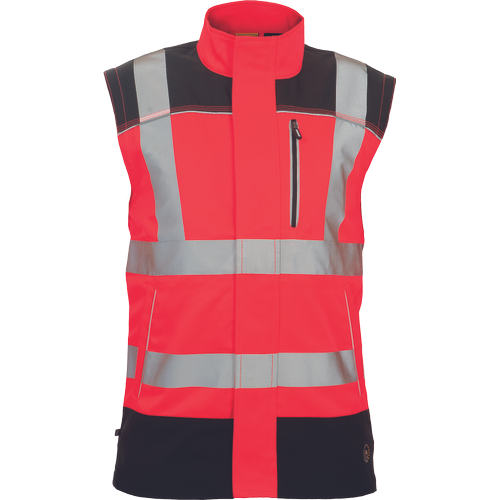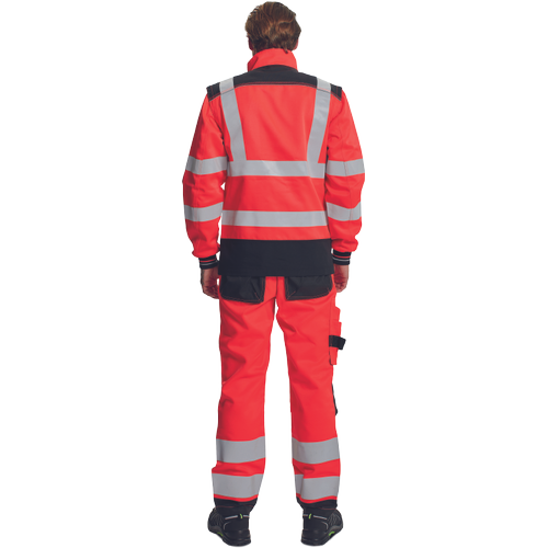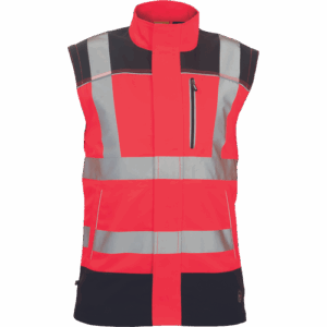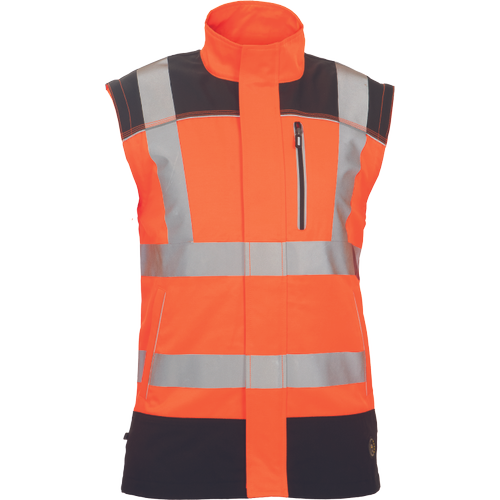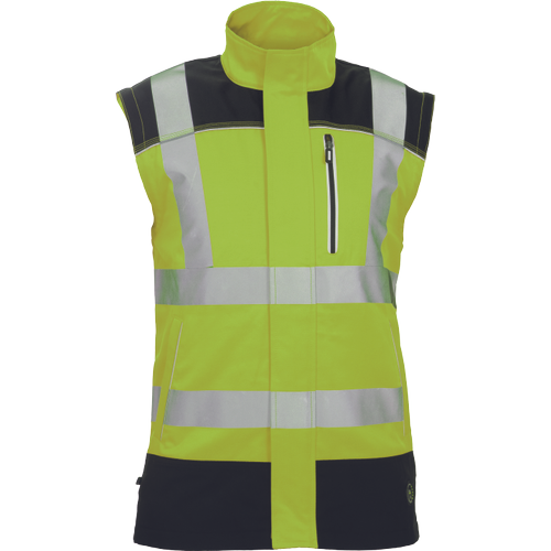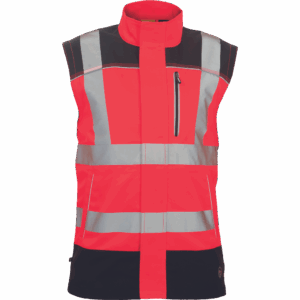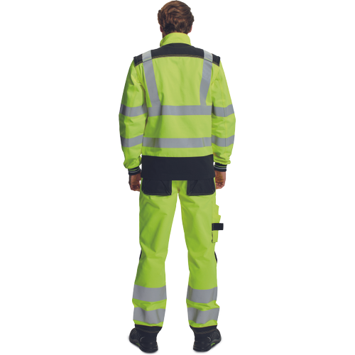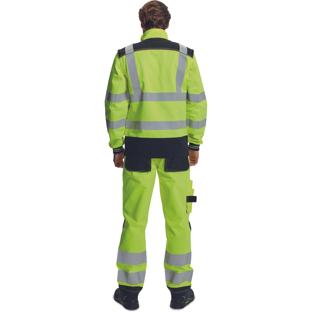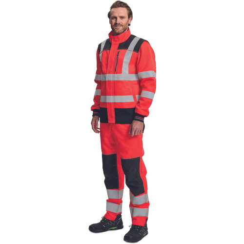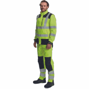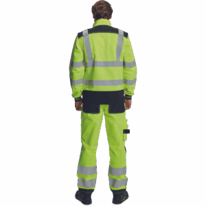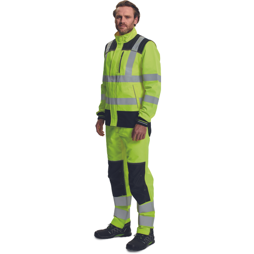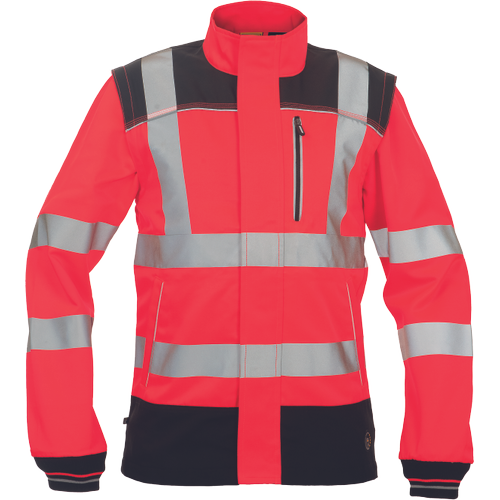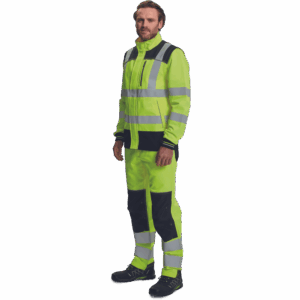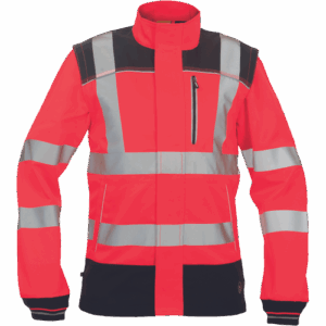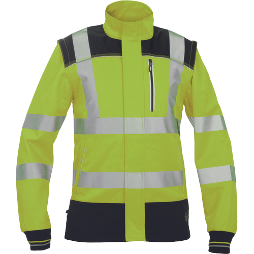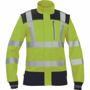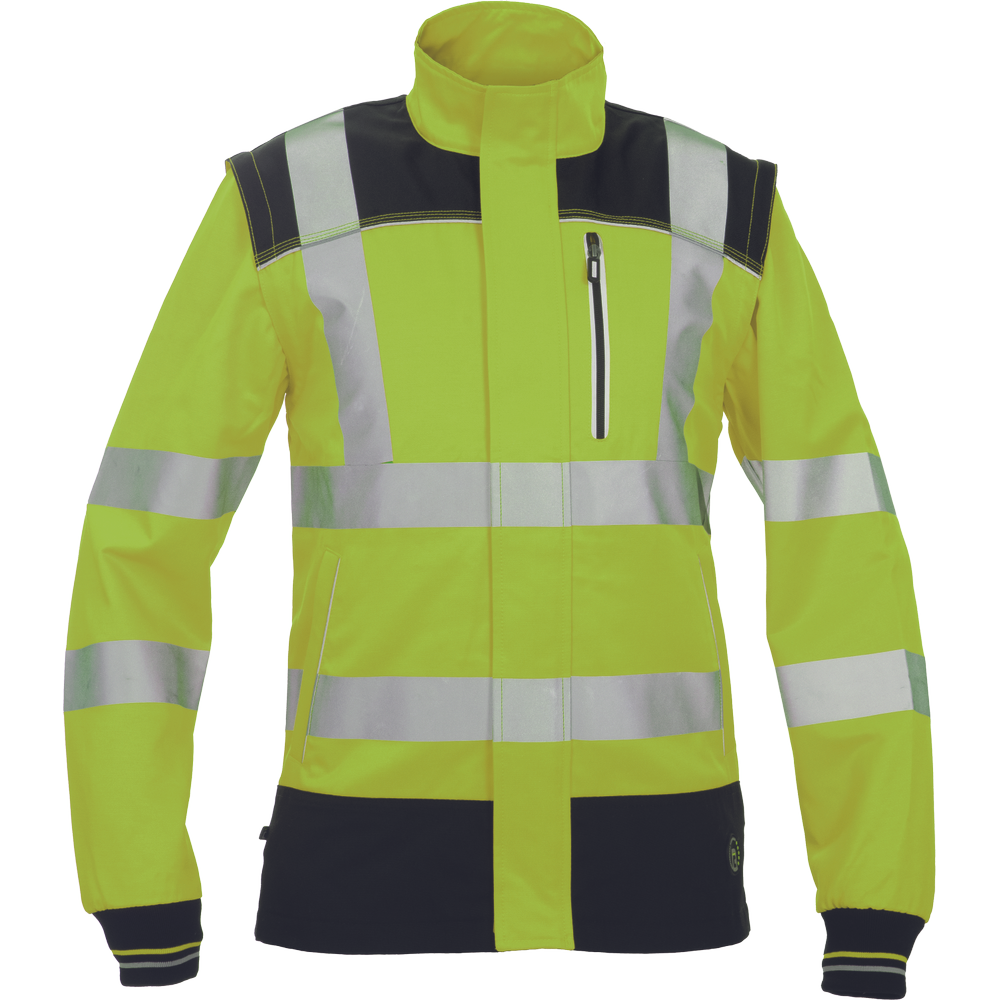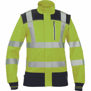 – moška delovna jakna HI-VIS s snemljivimi rokavi – zapiranje na zadrgo z velcro zavihkom – ojačani deli ramen Oxford 600D – 2 stranska žepa – 1 prsni žep – potiskane 5 cm odsevne črte – odsevne cevi – elastične manšete rokavov