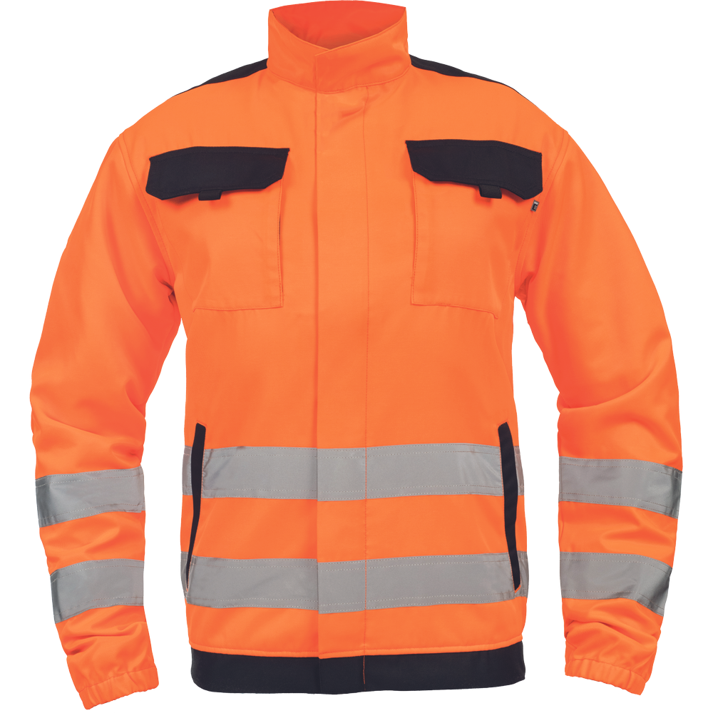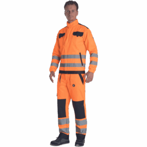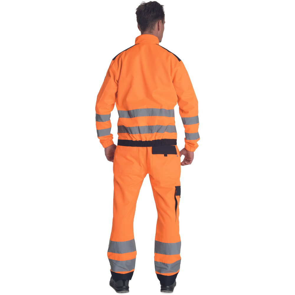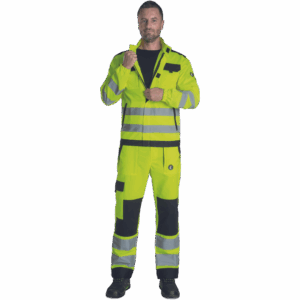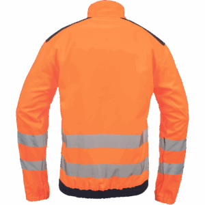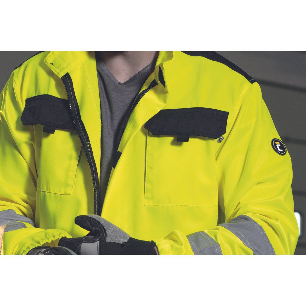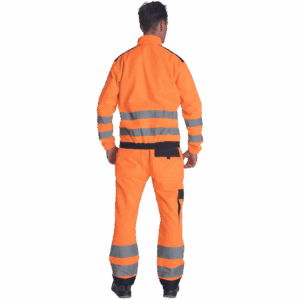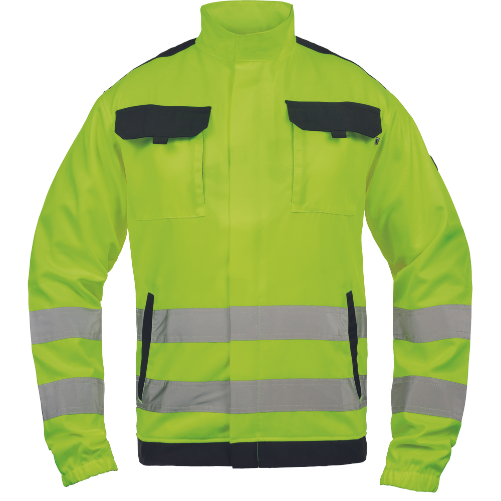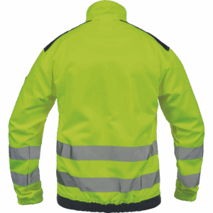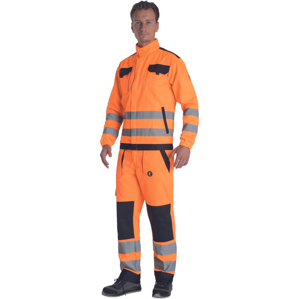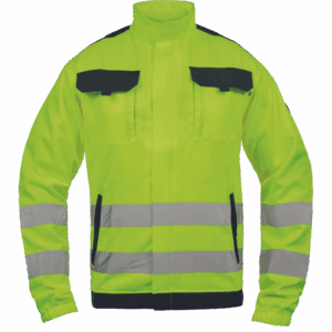 – unisex delovna jakna HI-VIS z zadrgo, prekrito z naramnicami – 2 stranska žepa – 2 prsna žepa z velcro zavihkom – 2 všiti 5 cm široki odsevni črti ob straneh in na spodnjem delu rokavov – ojačani deli ramen – elastične manšete rokavov in pas