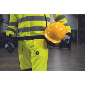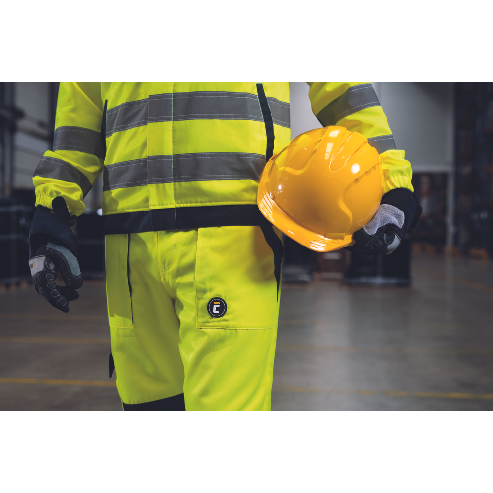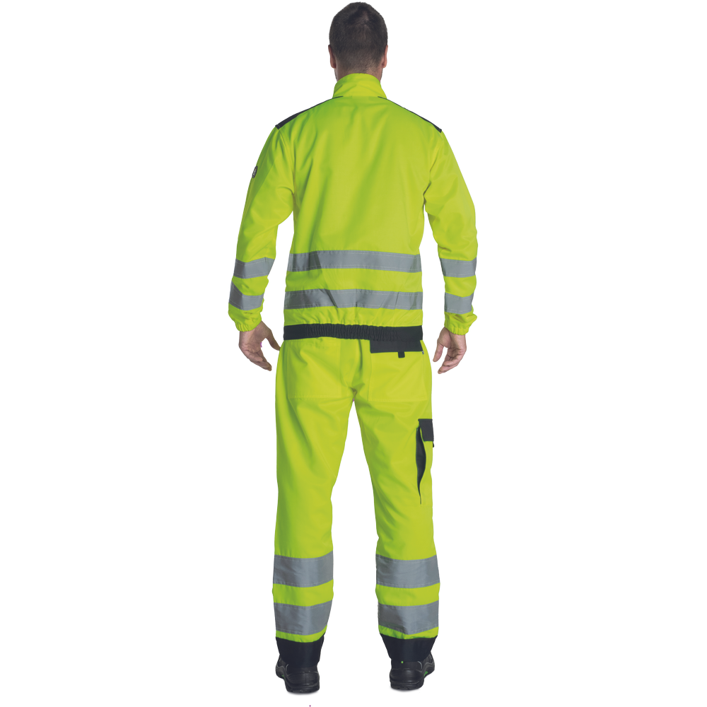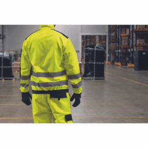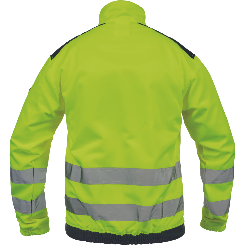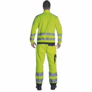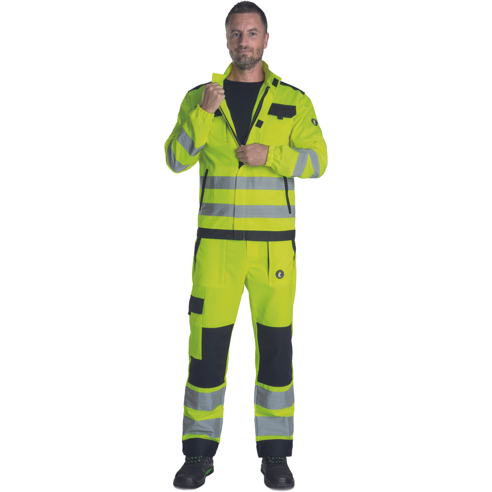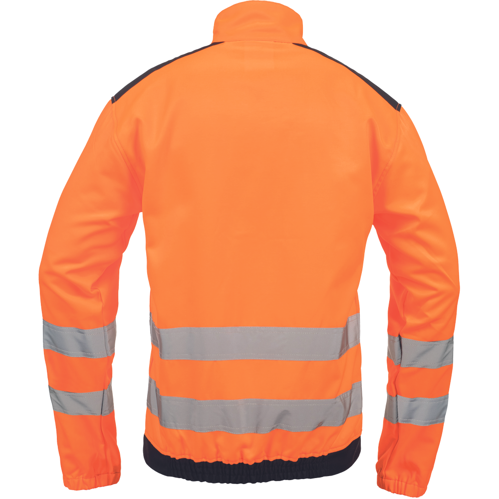 – unisex delovna jakna HI-VIS z zadrgo, prekrito z naramnicami – 2 stranska žepa – 2 prsna žepa z velcro zavihkom – 2 všiti 5 cm široki odsevni črti ob straneh in na spodnjem delu rokavov – ojačani deli ramen – elastične manšete rokavov in pas