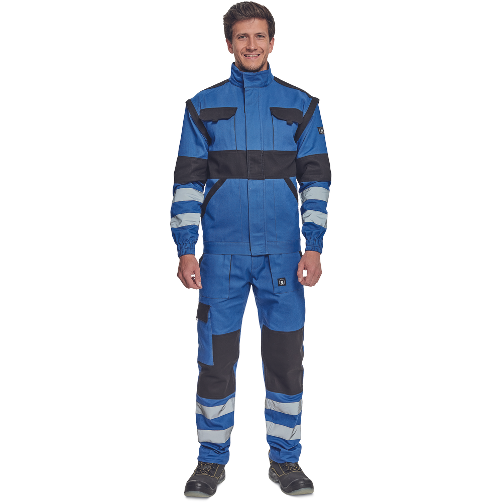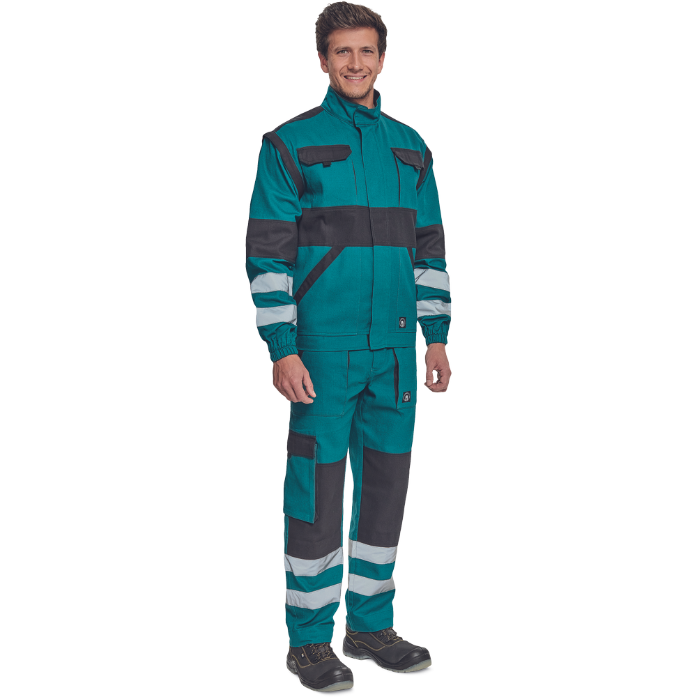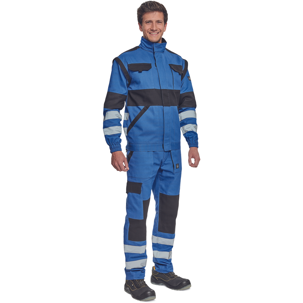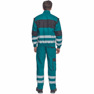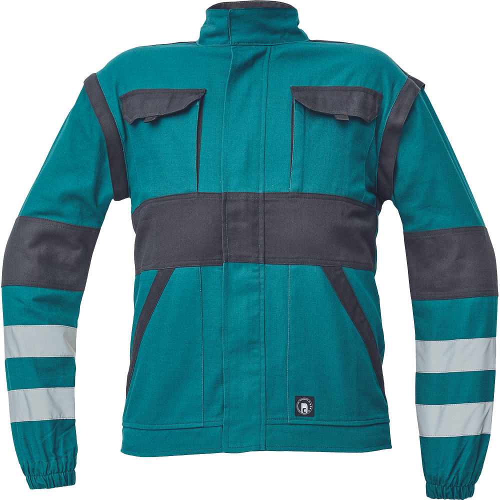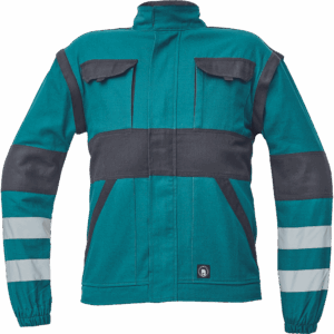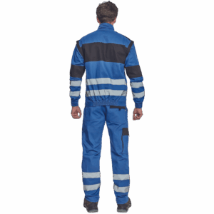 – moška delovna jakna z zadrgo in prevleko za plašč – snemljivi rokavi – 2 sprednja žepa – 2 prsna žepa – ojačitve na poudarjenih delih ramen in komolcev – odsevne črte okoli rokavov in na spodnjem delu hrbtne strani – elastične manšete in spodnji rob pasu