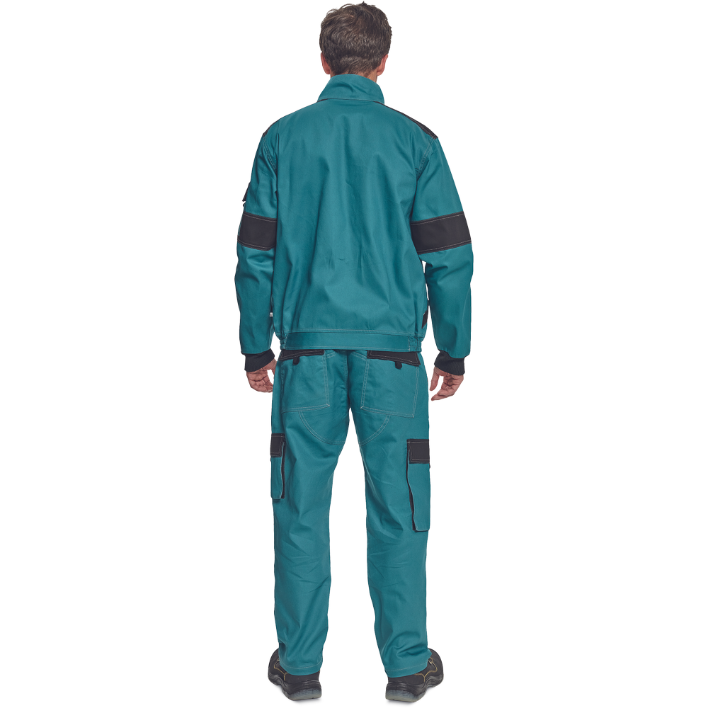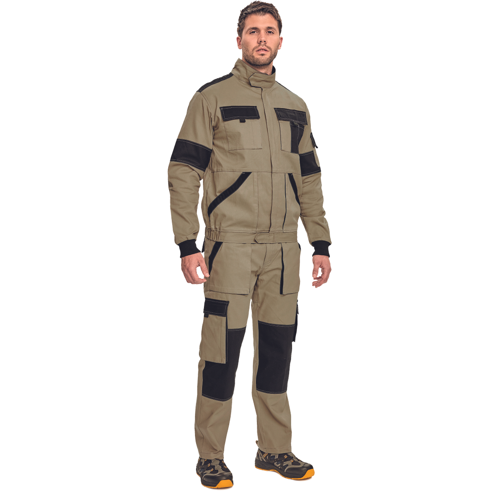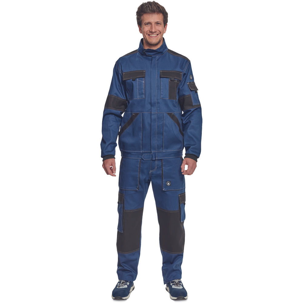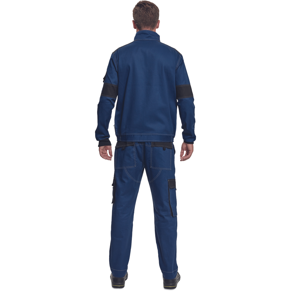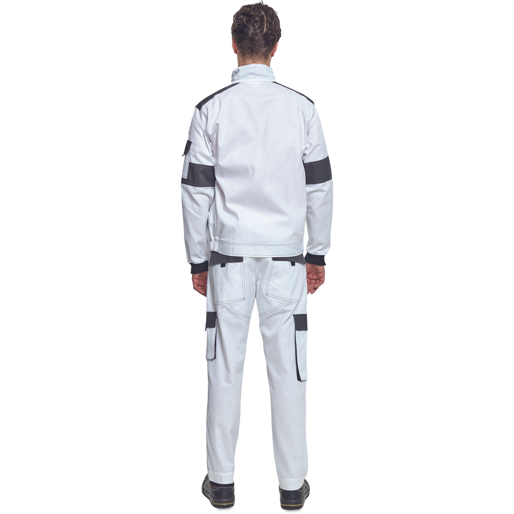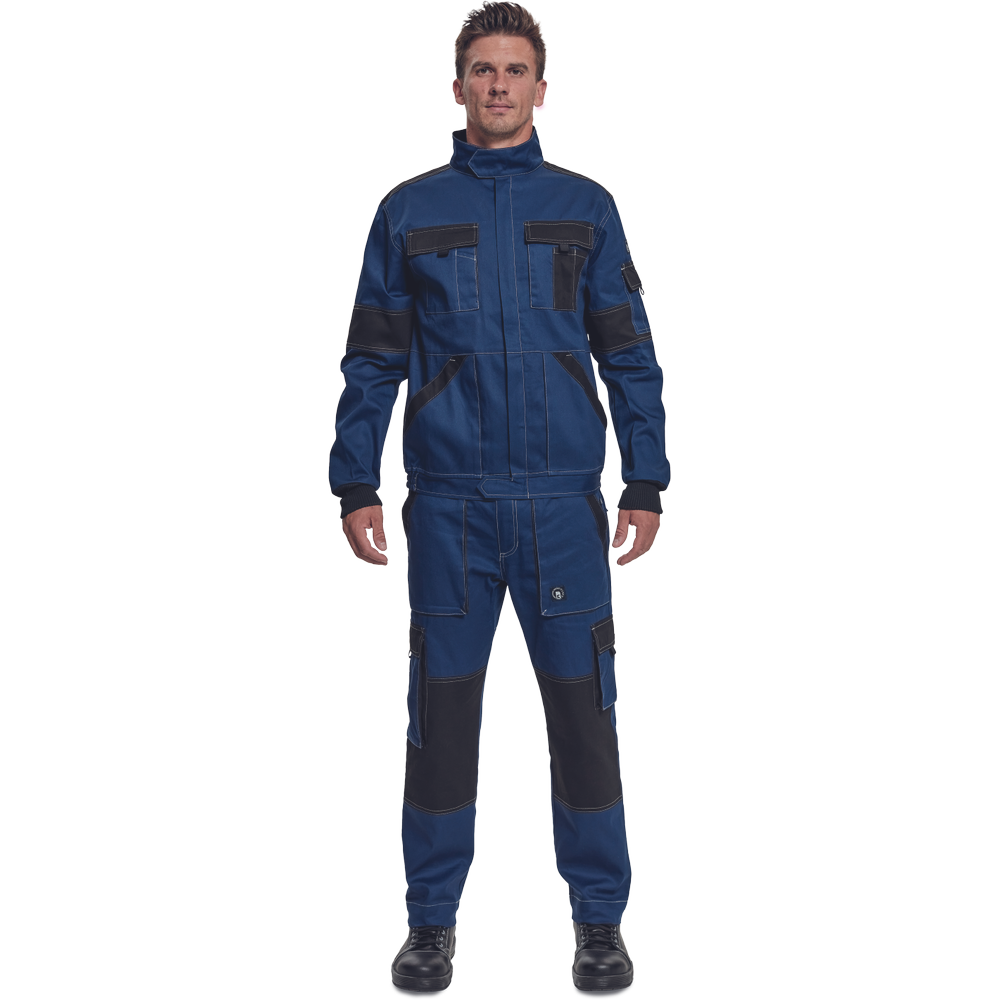 – moška lahka delovna jakna z zadrgo in pokrovom za plašč – 2 sprednja žepa – 2 dvojna prsna žepa s poklopci – 1 majhen žep na levem rokavu – ojačitev na poudarjenih delih ramen in komolcev – elastične manšete in spodnji rob pasu