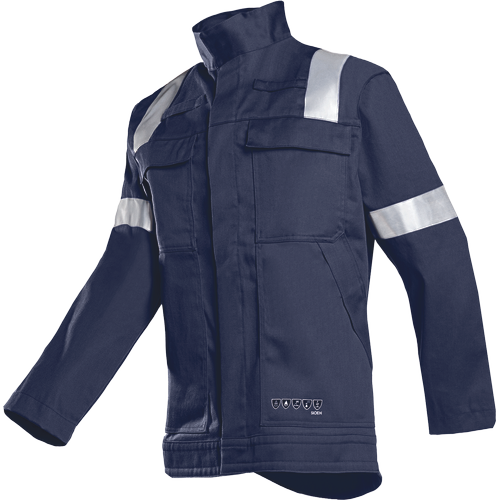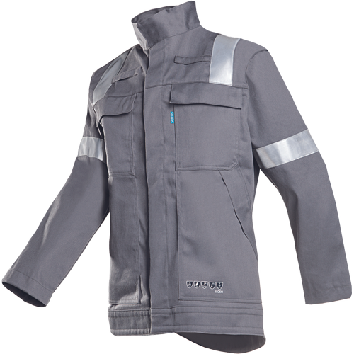 – moška jakna z zaščito ARC – negorljiva in antistatična – zapiranje s skritimi pritiskači pod zavihkom – 2 prsna žepa s pritiskači, skrita pod zavihkom – 2 stranska žepa s pritiskači, skrita pod zavihkom – 1 notranji žep – negorljive dvojno lepljene odsevne črte okoli zgornjih rokavov in čez ramena – rokavi se zapirajo s pritiskači – primerna za varjenje