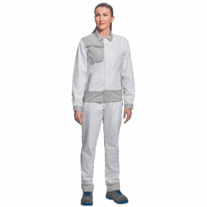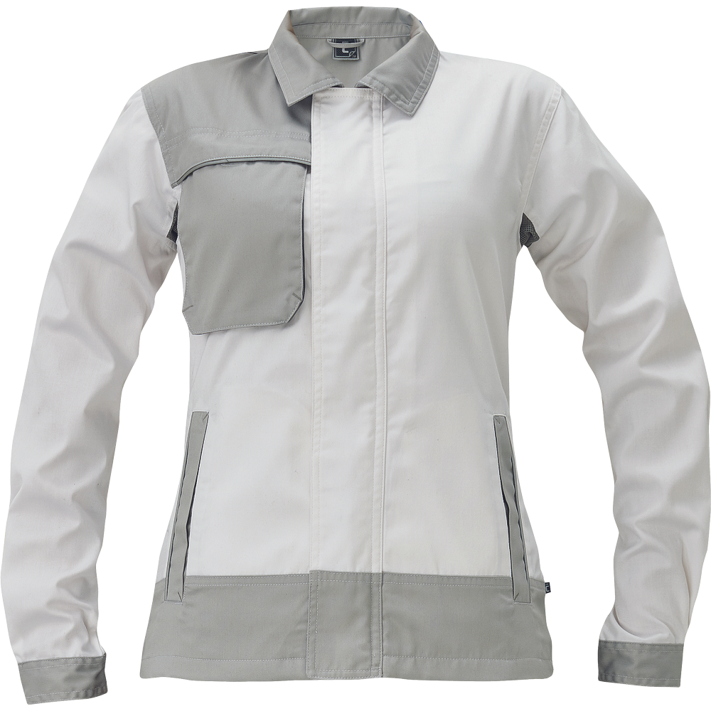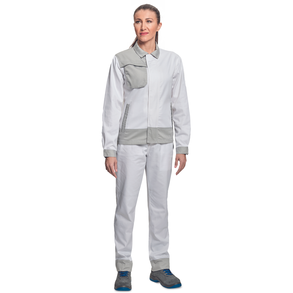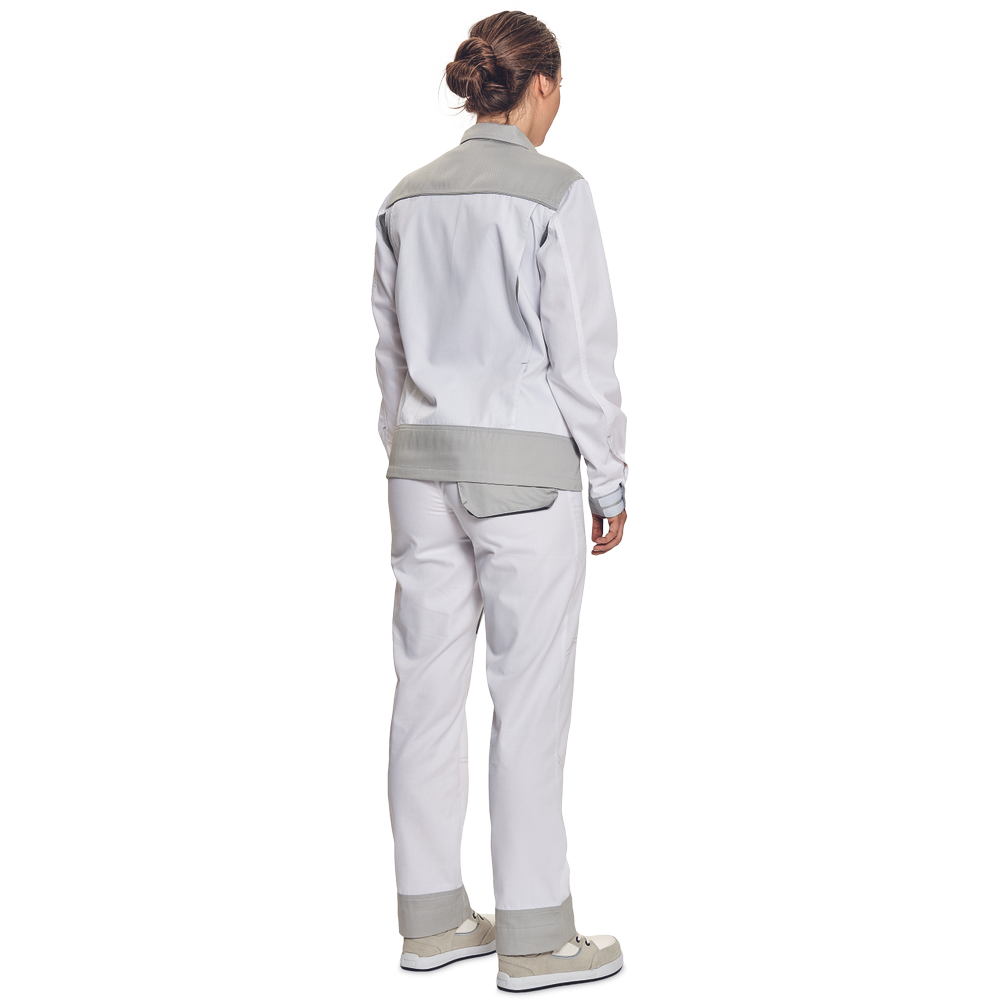 – lahka ženska delovna jakna, certificirana za industrijsko pranje – diha zaradi uporabe mrežastih delov – popolnoma pokrita zadrga in zapiranje rokavov – dostop za identifikacijski čip v notranjosti – okrasne cevi v kontrastni barvi