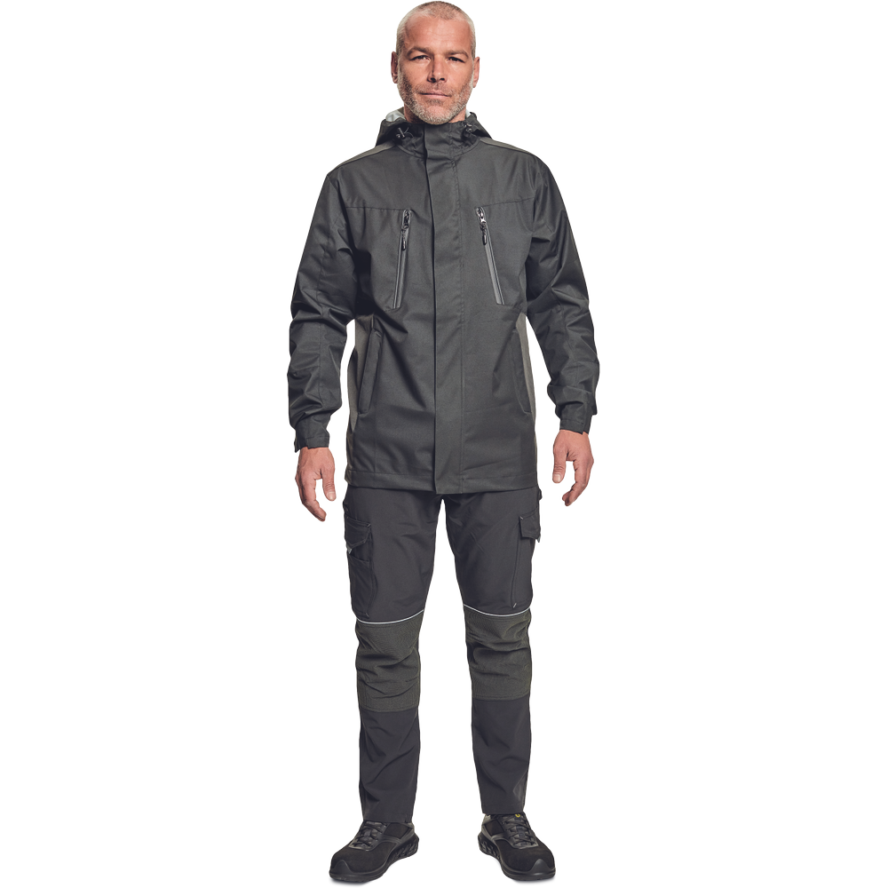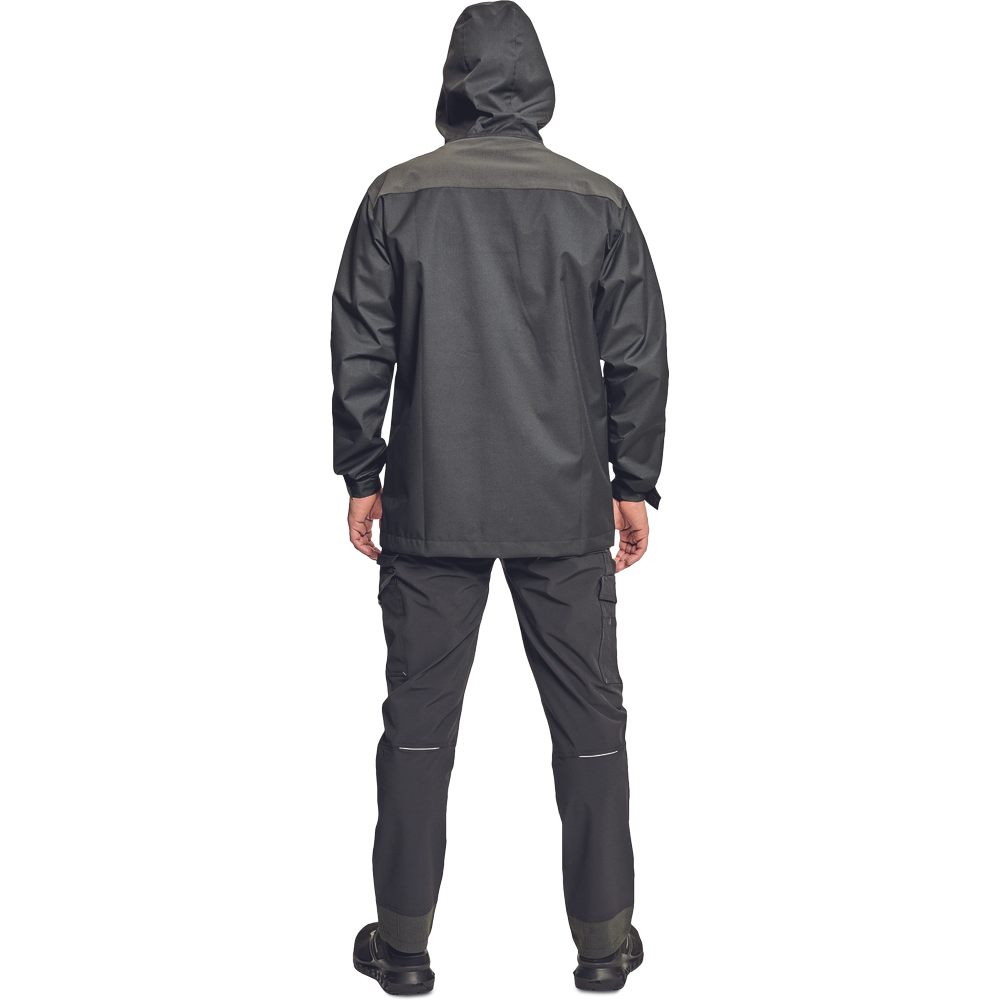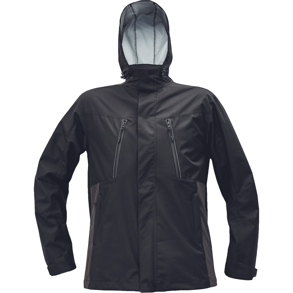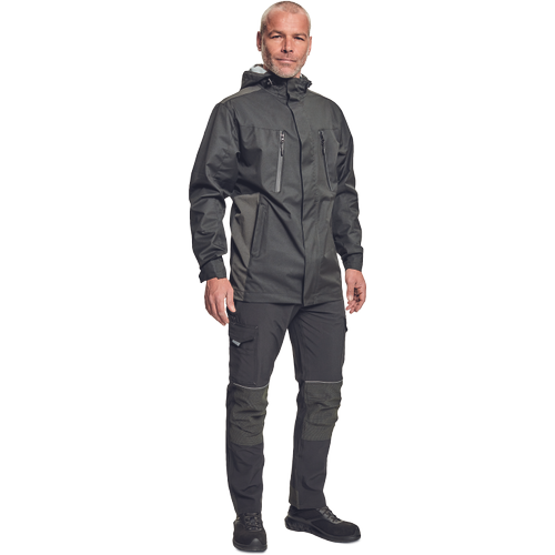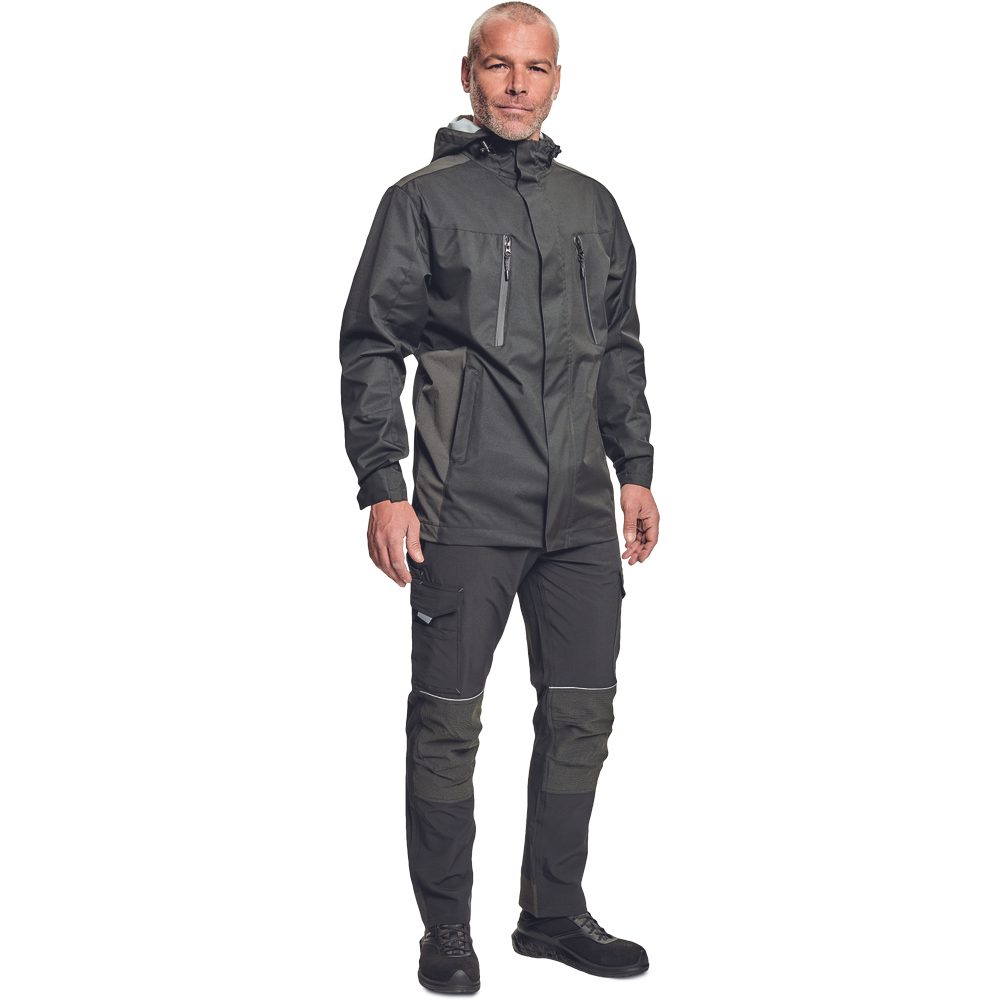– lahka moška zunanja jakna s kapuco – nepremočljiva in zračna – 4 žepi na zadrgo – nastavljivi rokavi z velcro – nastavljiva kapuca z vrvico – odsevne cevi ton v tonu