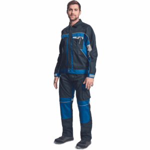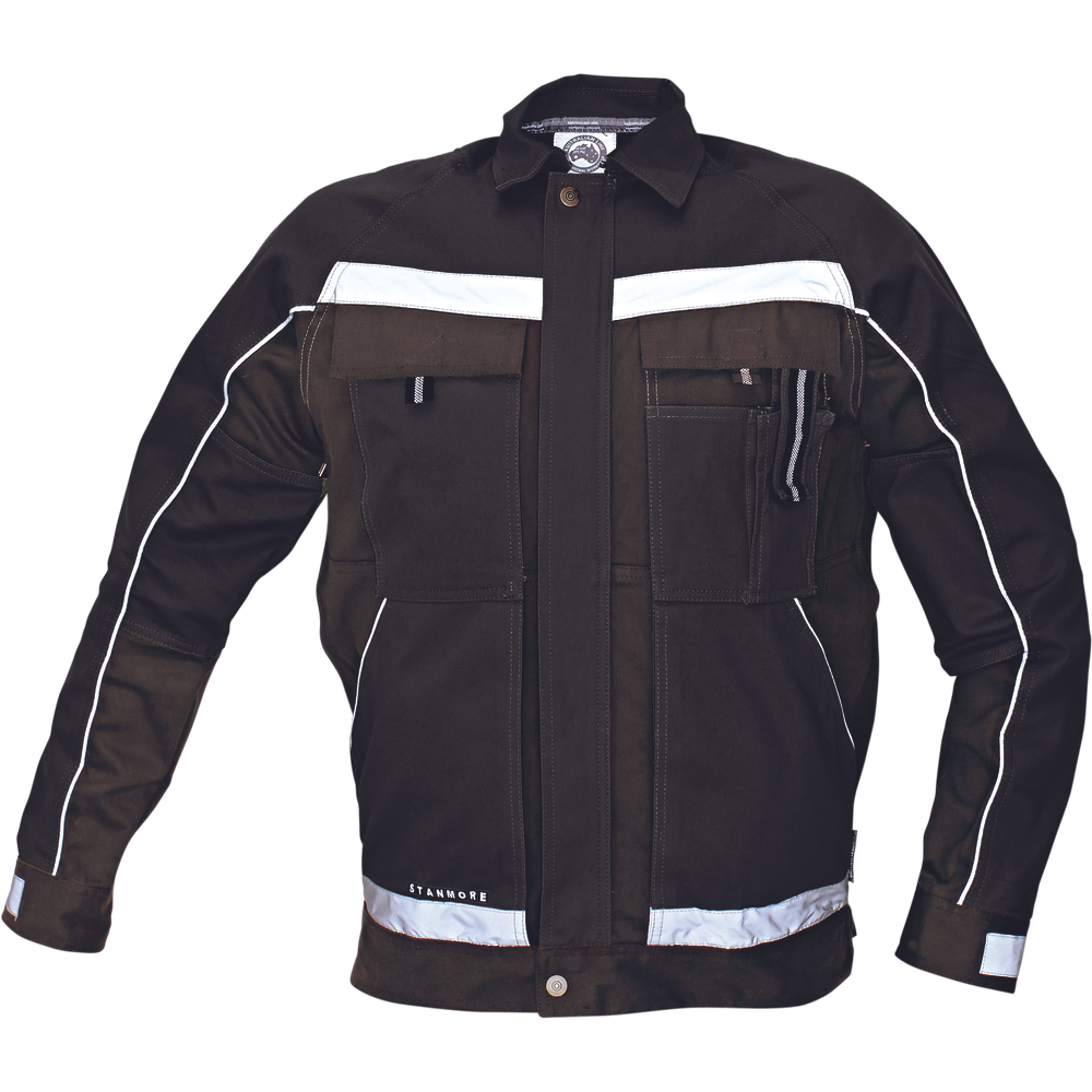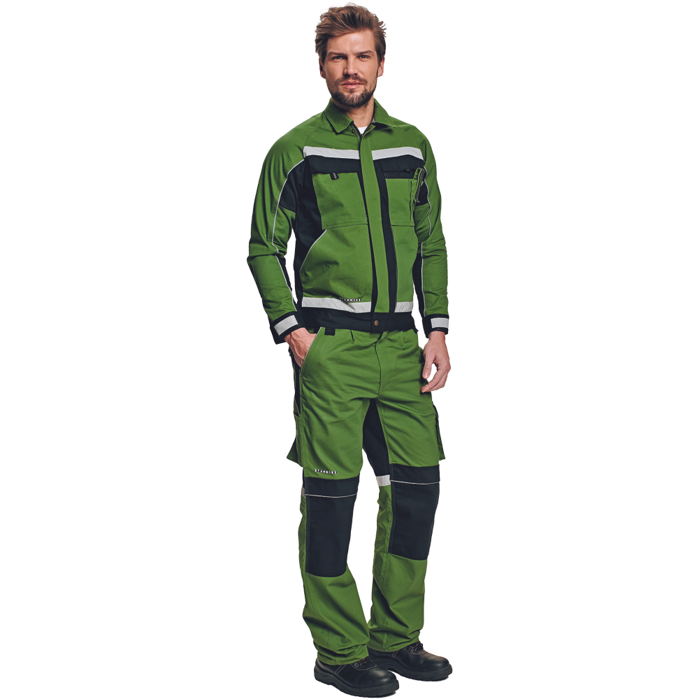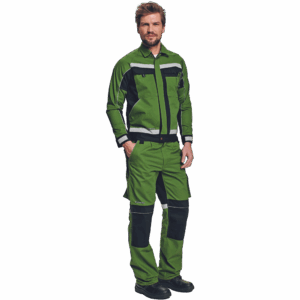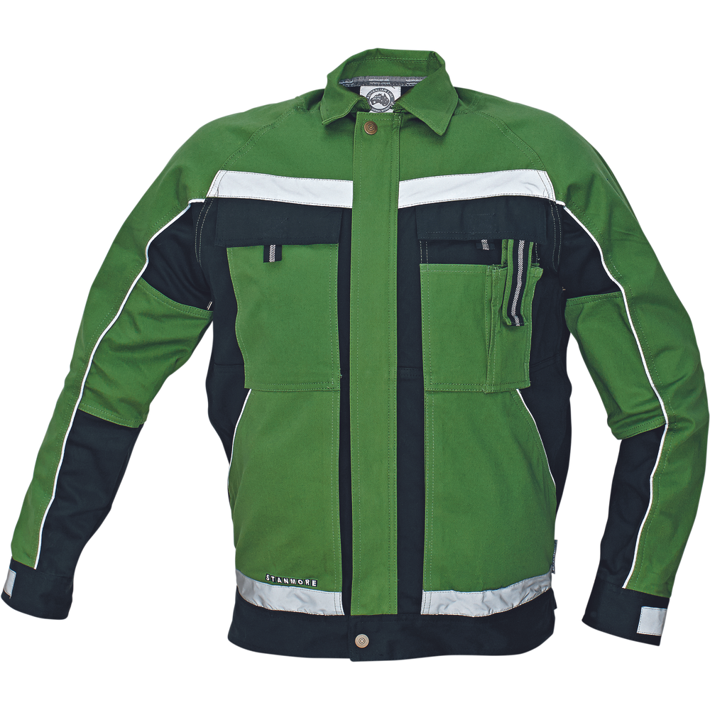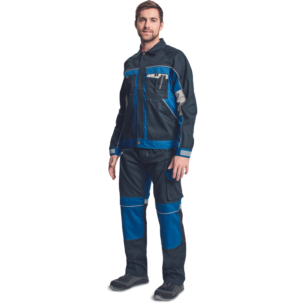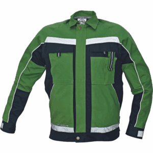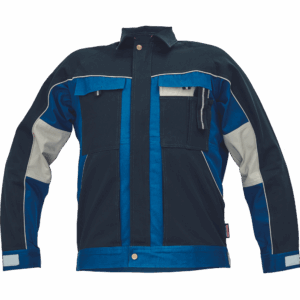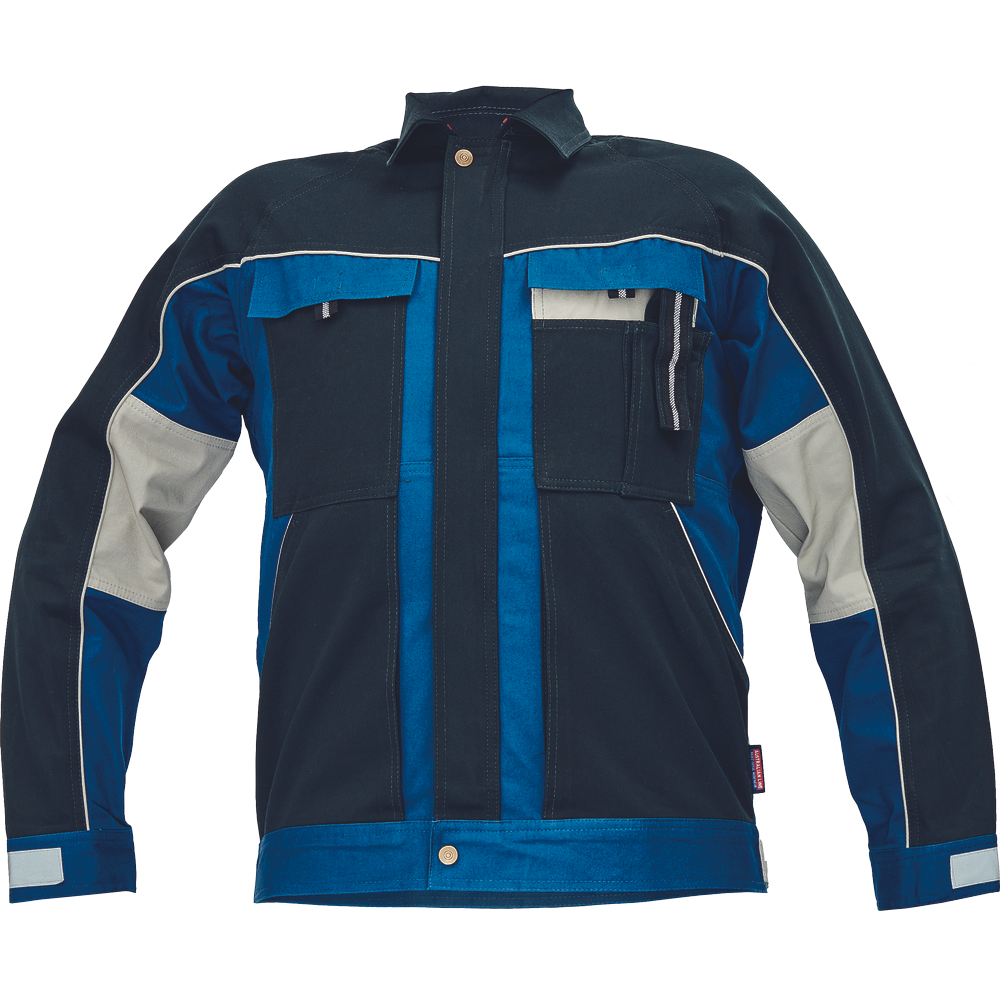 – visoko vzdržljiva moška delovna jakna z zadrgo, prekrito s kovinskim zapiralom – 2 velika sprednja žepa – 2 prsna žepa z velcro zavihki – nastavitev širine rokavov in spodnjega roba s popperjem – odsevni elementi