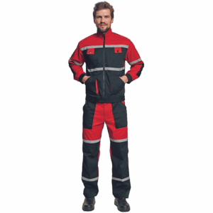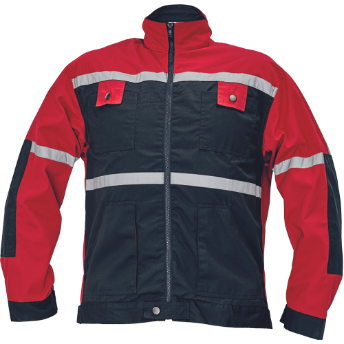 – moška delovna jakna s pokončnim ovratnikom in zapiranjem na zadrgo – impregnacija, odporna na olje in vodo – 2 sprednja žepa – 2 prsna žepa z zapiranjem na popper – ojačeni komolci – odsevne črte – nastavitev pasu z zategovalnim pasom na popper