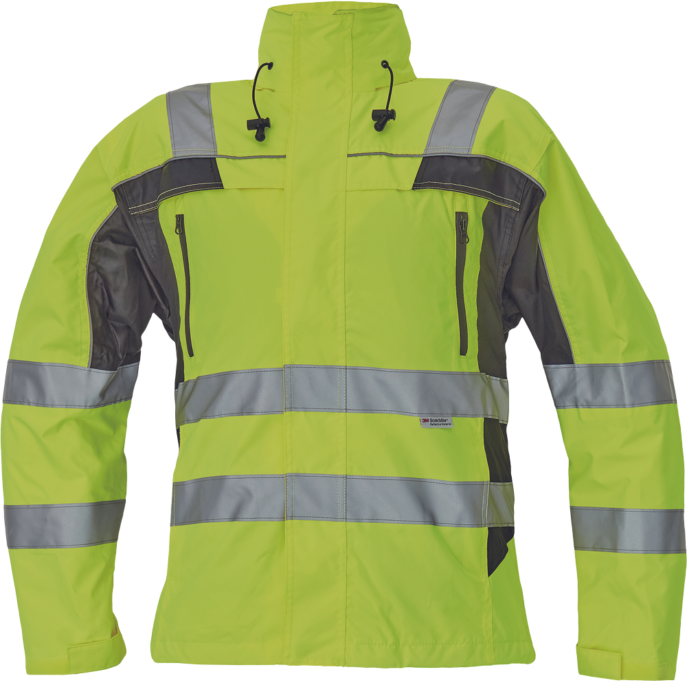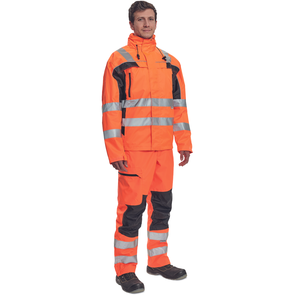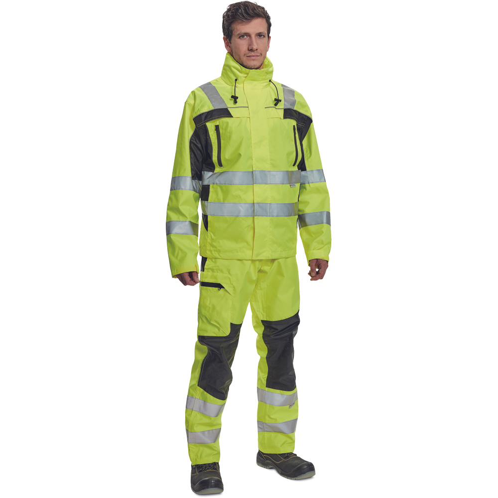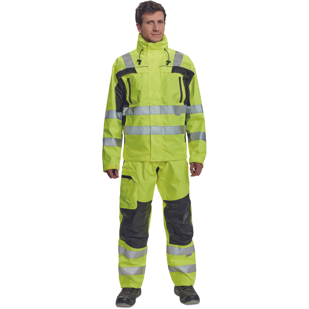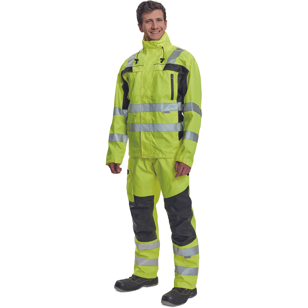 – moška nepremočljiva jakna HI-VIS z integrirano kapuco v ovratniku in podlogi – odsevne črte na bokih in rokavih – zatesnjeni šivi, vodoodpornost in prepustnost za paro – 2 stranska žepa, 2 prsna žepa – nastavitev robov rokavov na velcro
