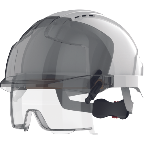 Varnostna čelada EVO® VISTAlens® z integriranimi očali – bela/dimna je nova generacija, bogata z lastnostmi, ki temelji na preizkušeni tehnologiji zaščite glave Evolution®, ki vključuje popolnoma izvlečno integrirano zaščito oči z optičnim razredom 1 in odpornostjo proti udarcem B; očala so zamenljiva, kar uporabnikom omogoča zamenjavo vrhunske zaščite z obraznim ščitnikom VISTAshield®, da imajo po potrebi na voljo pravo zaščito; čelada ima zaskočni pas Revolution® Flex in je zasnovana za zmanjšanje pritiska za popolno prileganje in udobje skozi ves dan.