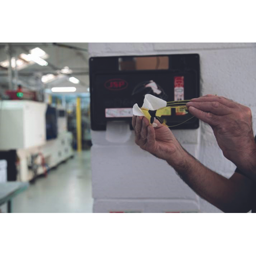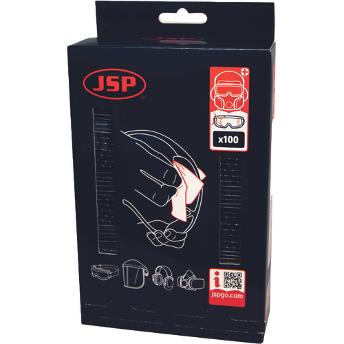 škatla s 100 predhodno navlaženimi robčki za osebno varovalno opremo; stenska ali prostostoječa škatla za enostavno dostavo, ki vsebuje 100 vrečk z robčki za čiščenje leč brez alkohola; robčki so primerni tudi za druge dele osebne varovalne opreme JSP, vključno s polmaskami in ščitniki za ušesa