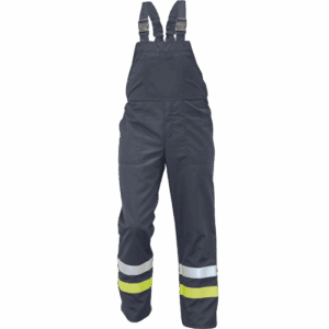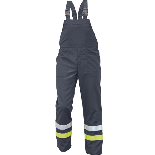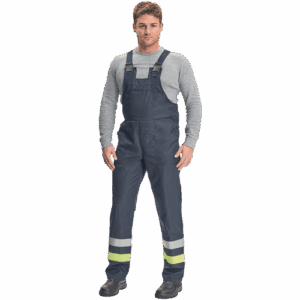 – antistatične zaščitne moške hlače z naprsnikom zagotavljajo zaščito pred vročino, plamenom in električnim lokom – zagotavljajo ustrezno zaščito pred toplotnim učinkom električnega loka, ki nastane pri enofaznem kratkem stiku (7000 A) v nizkonapetostnem omrežju (največ: 400 V, izmenična napetost 50 Hz) – izdelane iz antistatičnega materiala (elektrostatična disipacija), ki omogoča uporabo v eksplozivnih okoljih in v bližini vnetljivih materialov – primerne za delavce, izpostavljene vročini in plamenu – hlače z naprsnikom zagotavljajo zaščito pred učinki neposrednega plamena za 4 sekunde. in za 7 s pred učinki vročine z močjo 20 kW/m2 – material je sam odporen na vročino in plamen, zato pralni cikel nanj ne vpliva – našit žep na prsnem delu – našit žep pod pasom – sprednji del od stegna do pasu iz dvojne plasti tkanine – 1-1 linija srebrne barve – HV rumeni odsevni trak na nogah