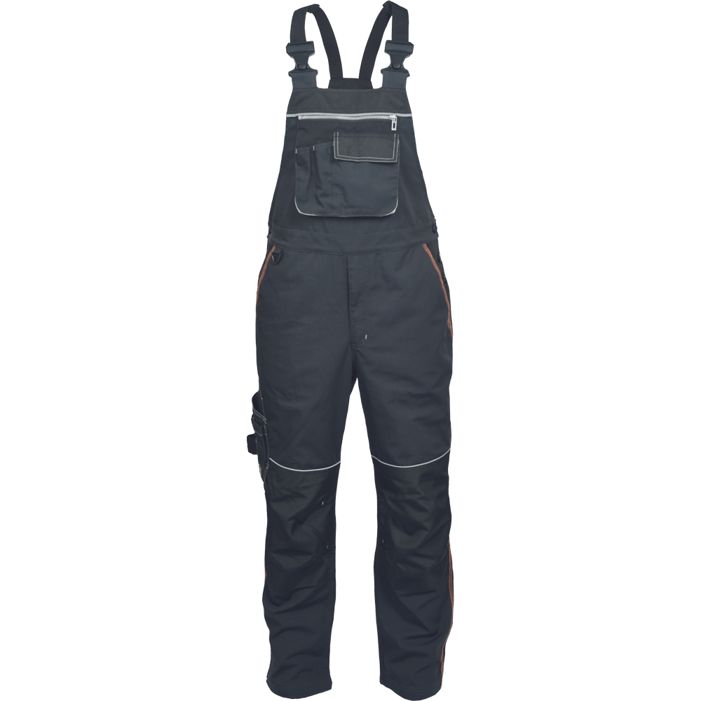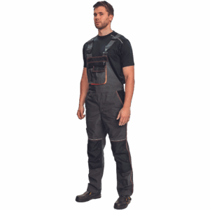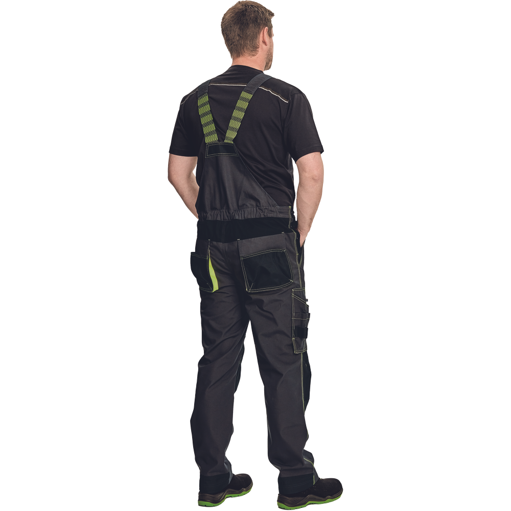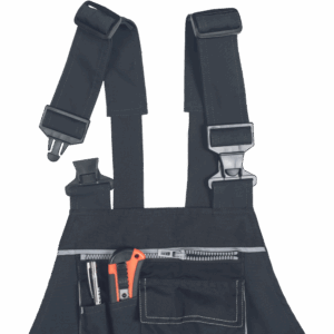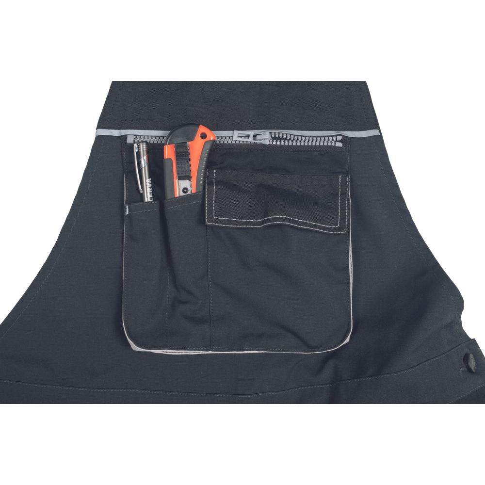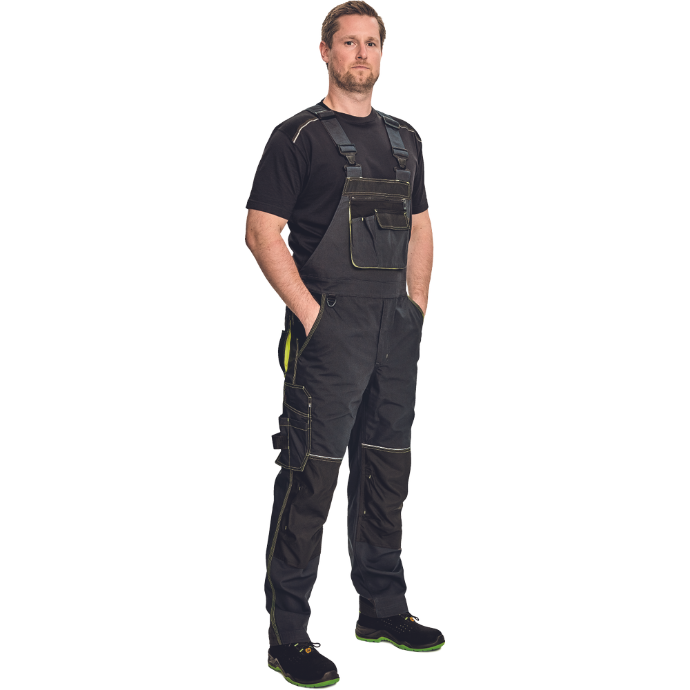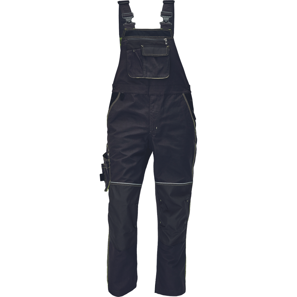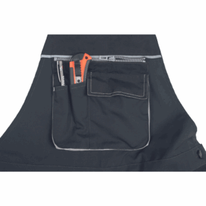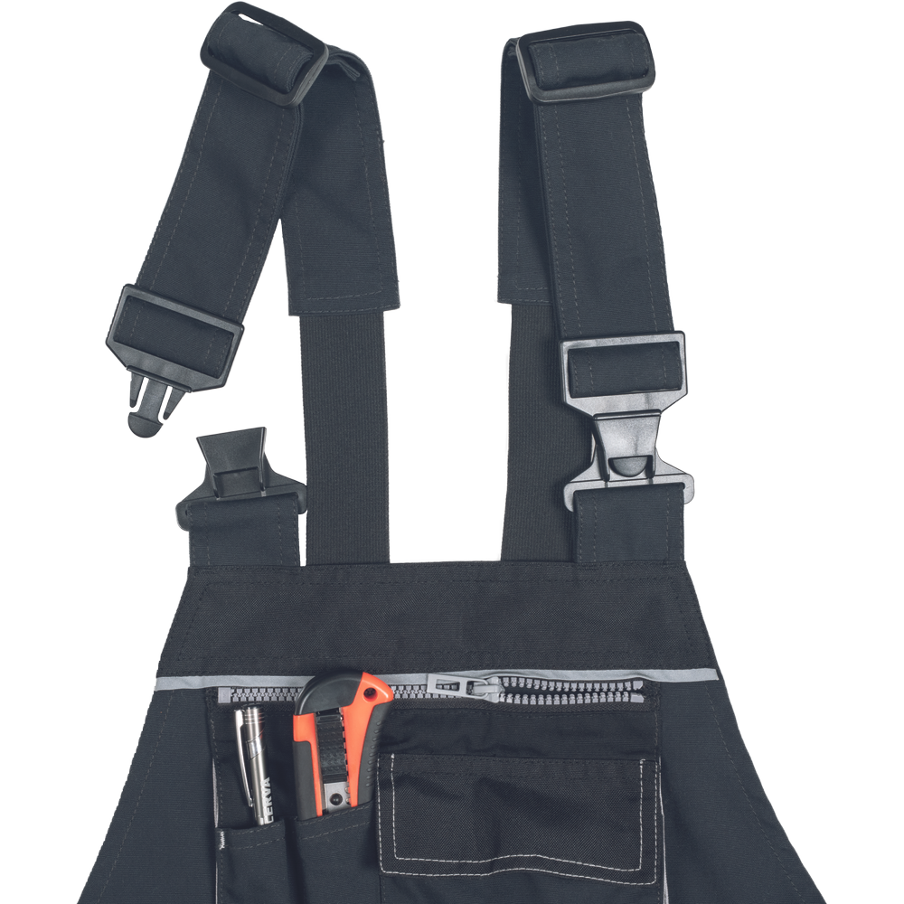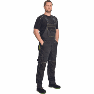 – Visokokakovostne moške delovne hlače z naprsnikom, elastičnimi naramnicami in pasom – 6 funkcionalnih žepov – ojačani deli kolen 600D Oxford za vstavljanje kolenskih blazinic – podaljšana dolžina nog – okrasni šivi in kontrastni detajli v barvi HI-VIS – odsevni robovi