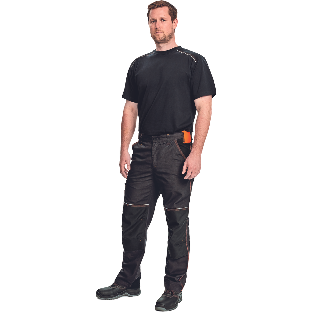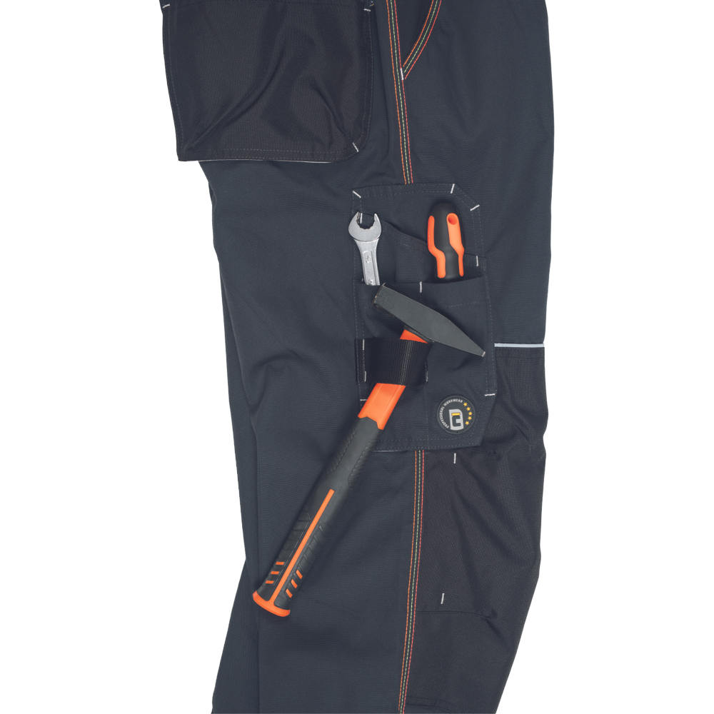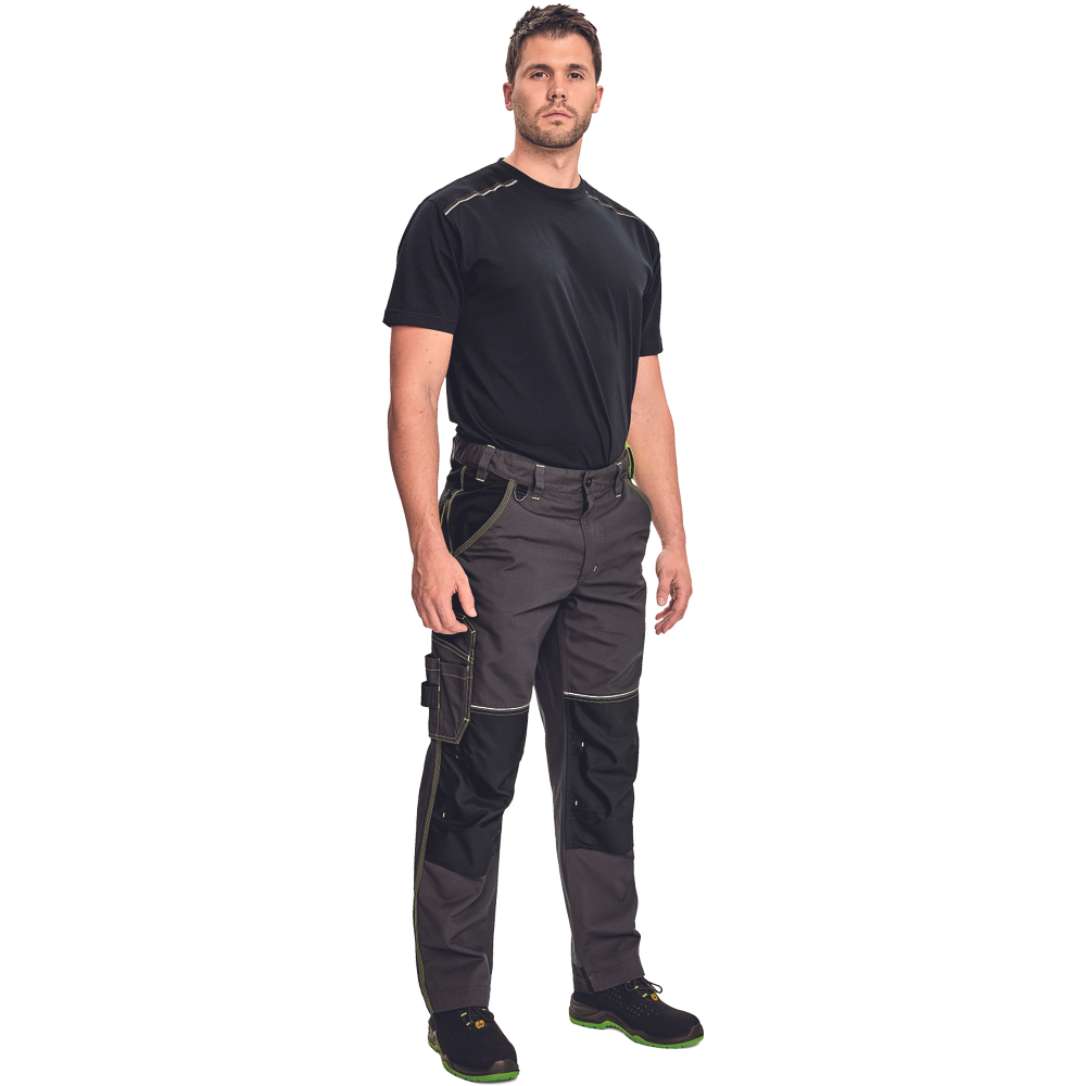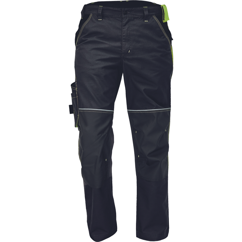 – Visokokakovostne moške delovne hlače z elastičnim pasom – 5 funkcionalnih žepov – ojačani kolenski deli iz oksforda 600D za vstavljanje kolenskih blazinic – podaljšana dolžina nog – okrasni šivi in kontrastni detajli v barvi HI-VIS – odsevni robovi