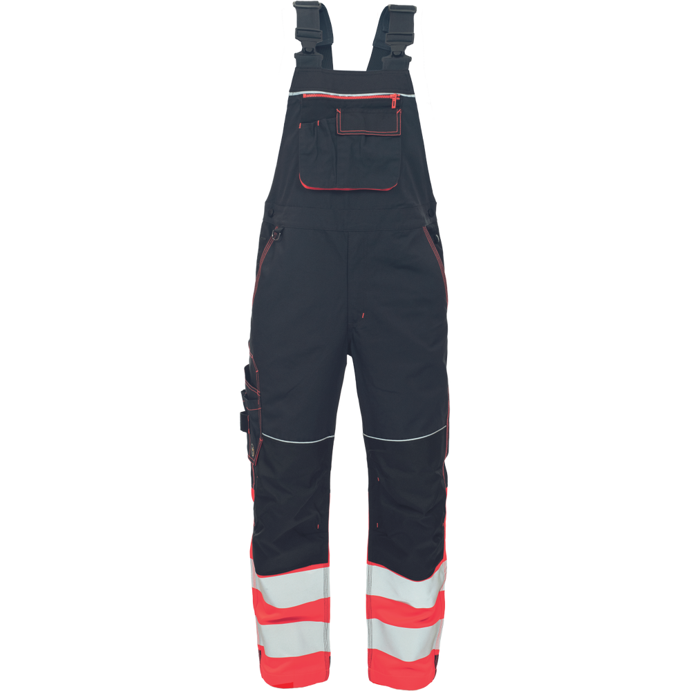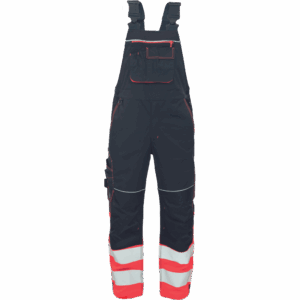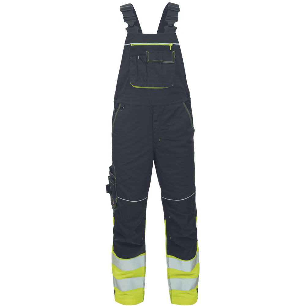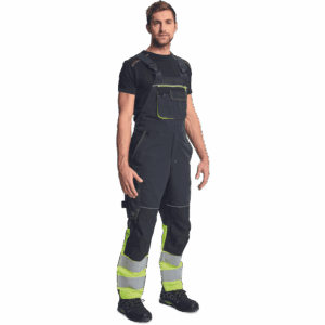 – moške delovne hlače z naprsnikom v kombinaciji s tkanino HI-VIS na spodnjem delu nog – 2 odsevna 7,5 cm tiskana trakova – elastični naramnice in pas – 6 funkcionalnih žepov, 600D Oxford ojačani kolenski deli za vstavljanje kolenskih blazinic – podaljšana dolžina nog – okrasni šivi in kontrastni detajli v barvi HI-VIS