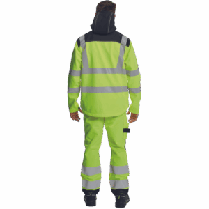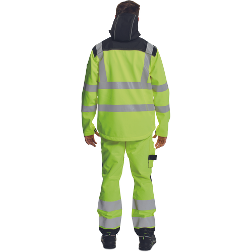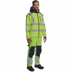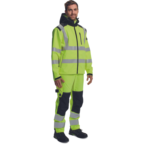 – HI-VIS softshell jakna s kapuco – PU membrana zagotavlja vodoodpornost in zračnost – ojačana ramena in komolci – 1 prsni žep z zadrgo, 2 stranska žepa – 2 notranja žepa – sedlo in žepi obrobljeni z odsevnimi trakovi – tiskane 5 cm odsevne črte – prilagodljiv spodnji del in rokavi