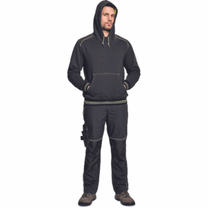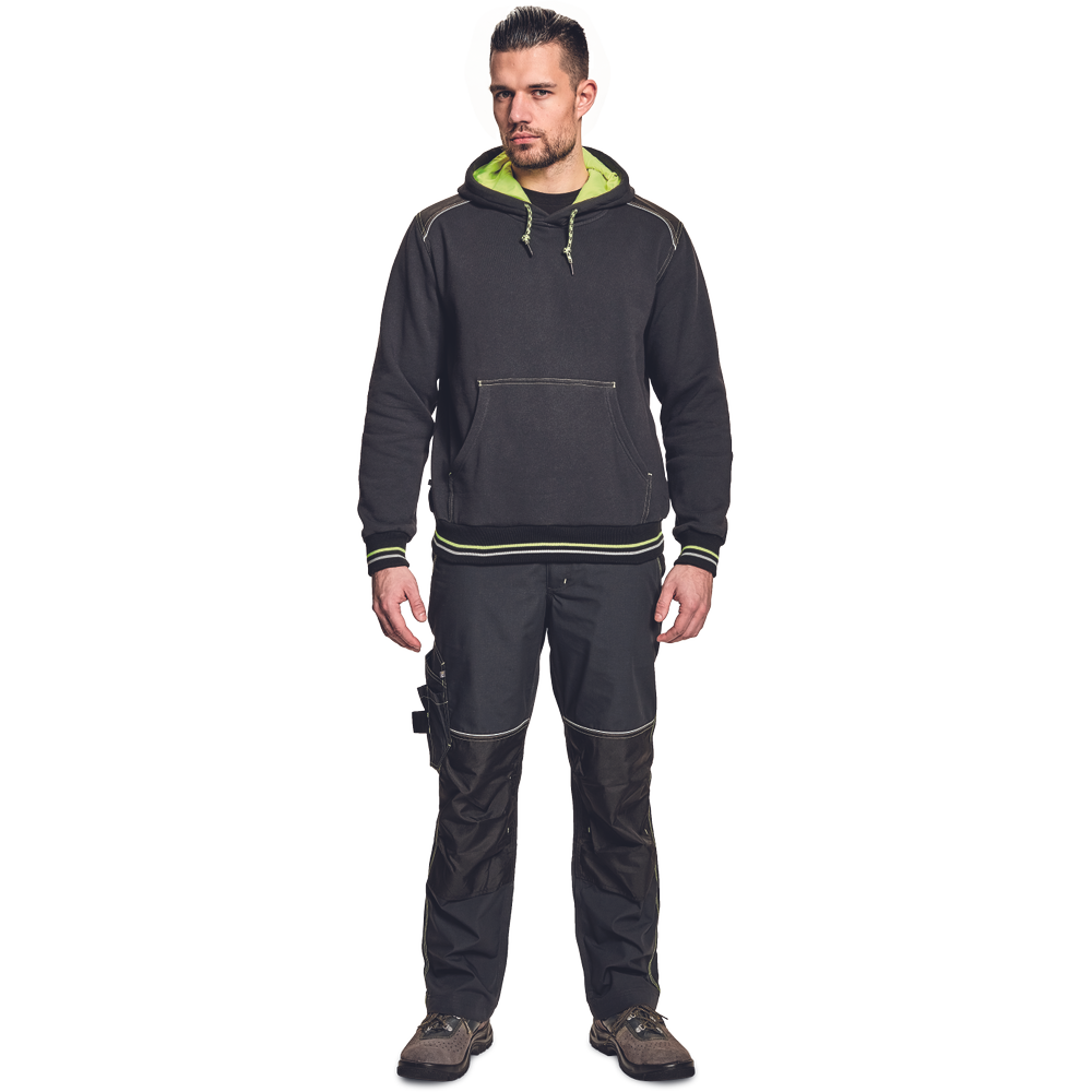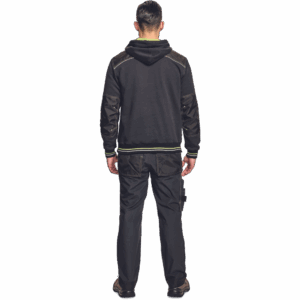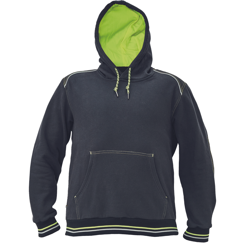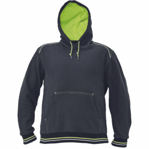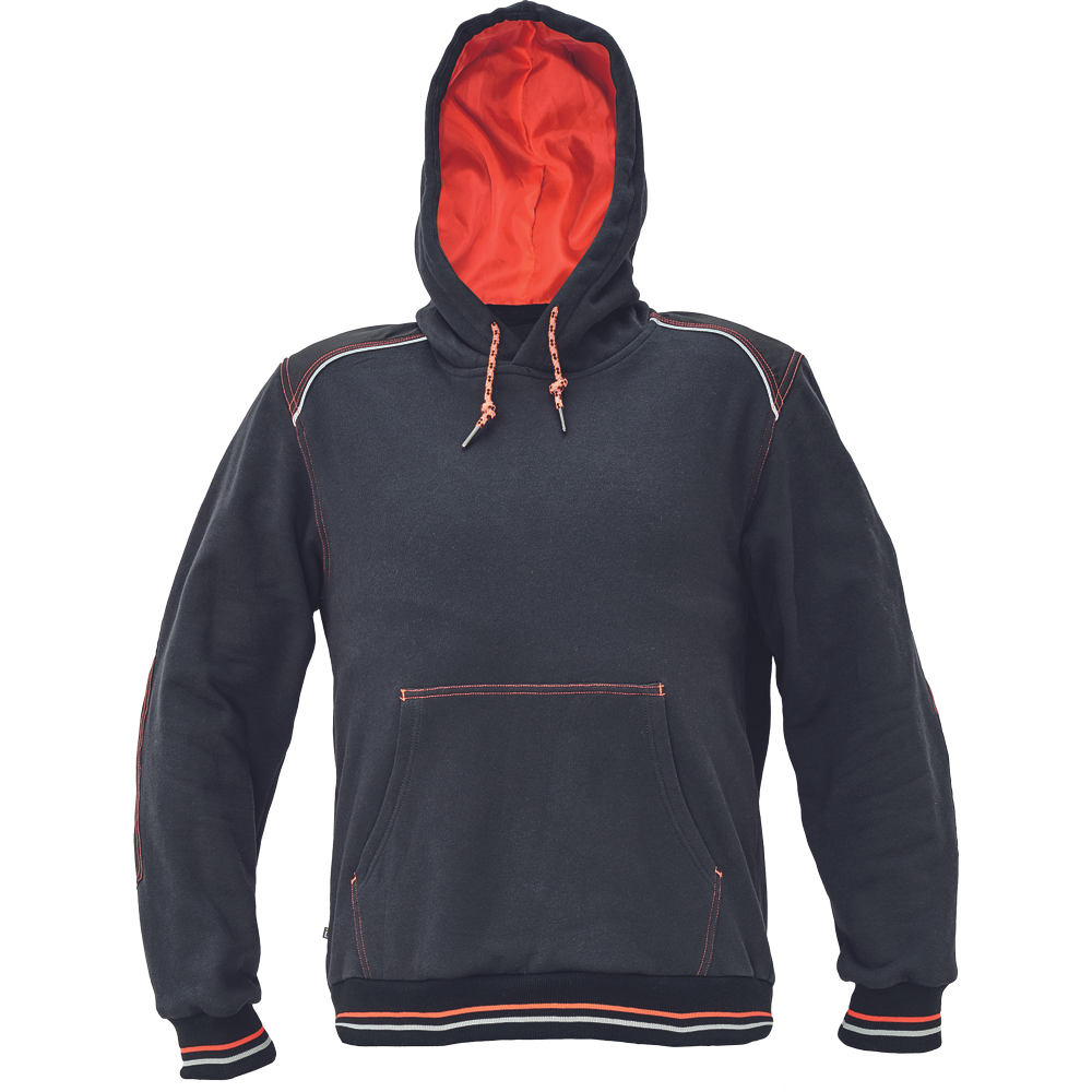 – kapuca s kengurujskim žepom iz mešanice bombaža in poliestra, v notranjosti iz francoskega frotirja – ojačani ramenski in komolčni deli – sedežni in stranski žepi, obrobljeni z odsevnimi trakovi – dvoslojna kapuca s podlogo HI-VIS – barva okrasnih šivov – elastični robovi na rokavih in dnu