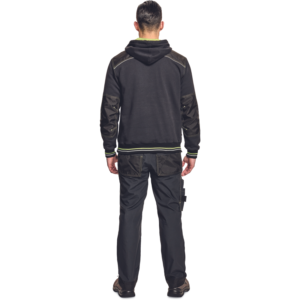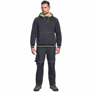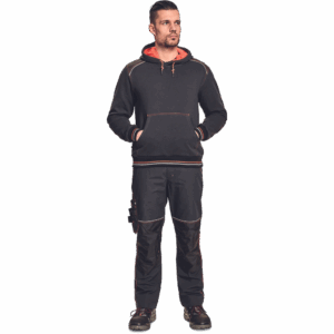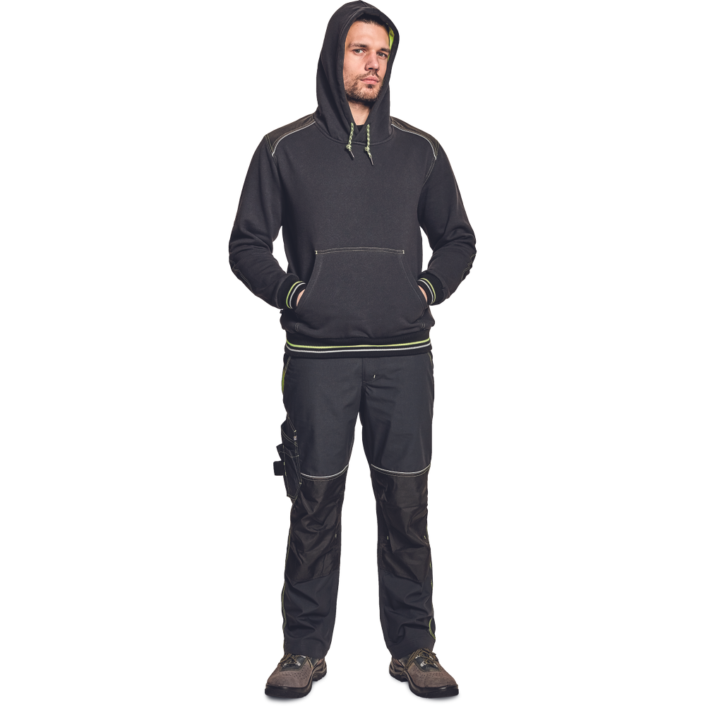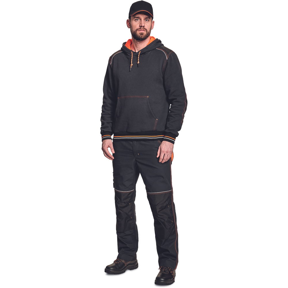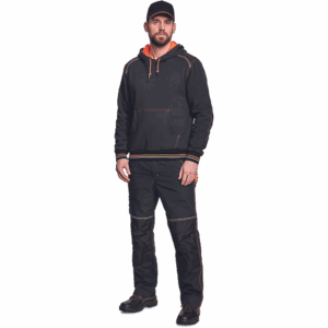 – kapuca s kengurujskim žepom iz mešanice bombaža in poliestra, v notranjosti iz francoskega frotirja – ojačani ramenski in komolčni deli – sedežni in stranski žepi, obrobljeni z odsevnimi trakovi – dvoslojna kapuca s podlogo HI-VIS – barva okrasnih šivov – elastični robovi na rokavih in dnu