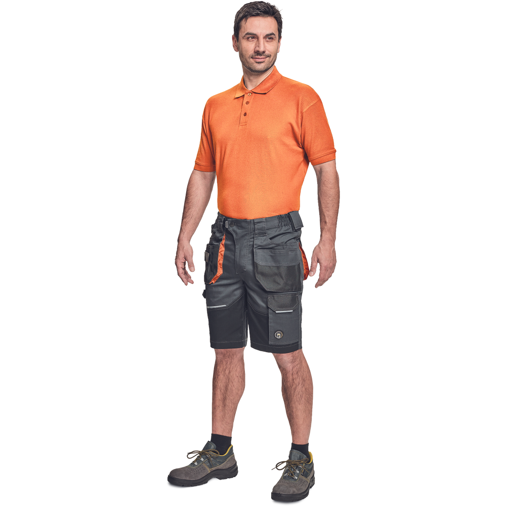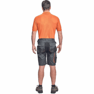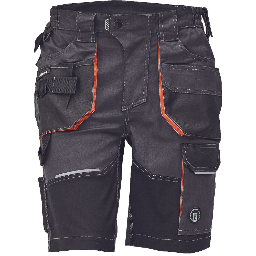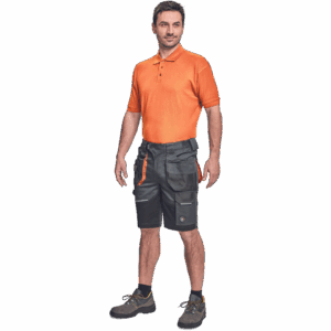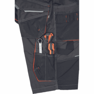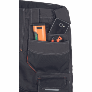 – moške delovne hlače z elastičnim pasom in večnamenskimi žepi – ojačitev stegenskega dela Oxford 600D – trpežni trojni šivi na nogah in v mednožju – odsevni detajli.