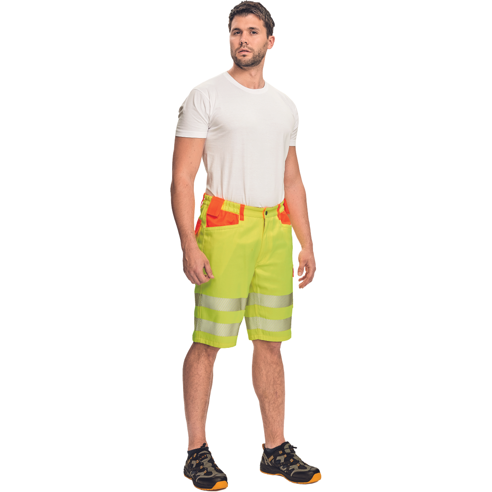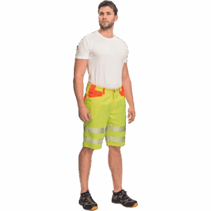 – visokokakovostne moške delovne hlače v kombinaciji dveh barv HI-VIS – segmentno potiskane odsevne črte okoli stegen – 2 velika sprednja žepa, 1 večnamenski stranski žep na nogi, 2 zadnja žepa z zavihkom – elastičen pas