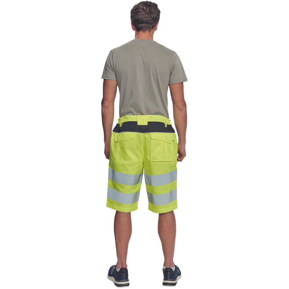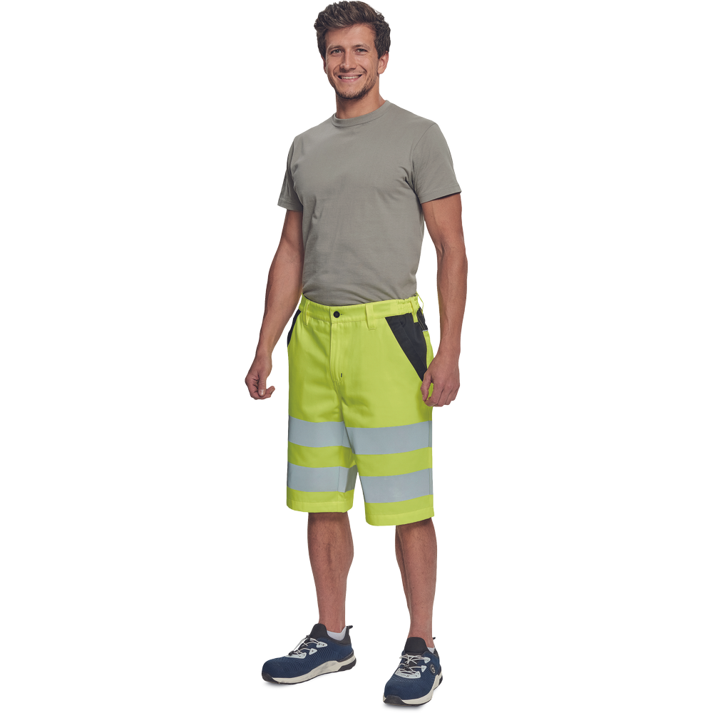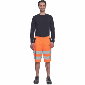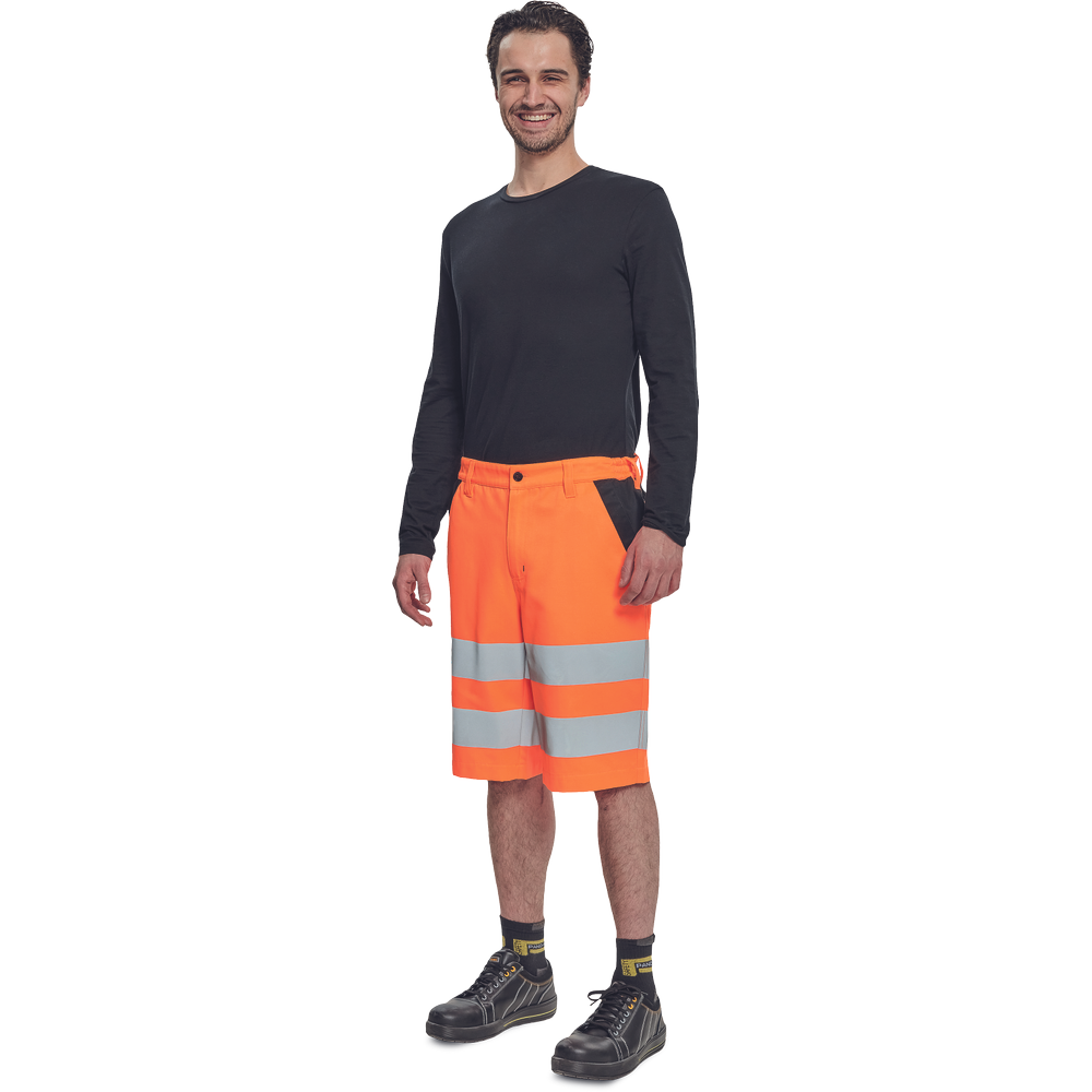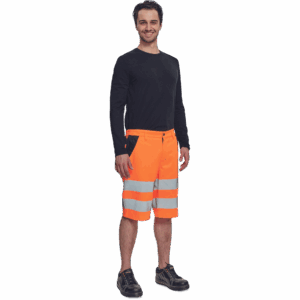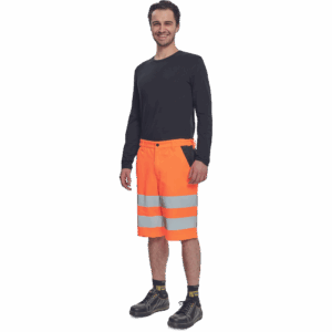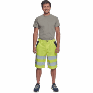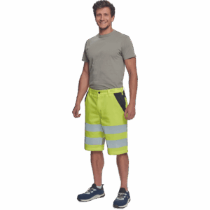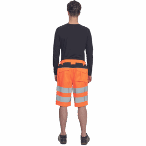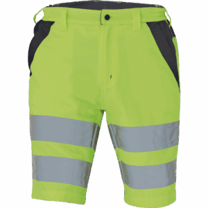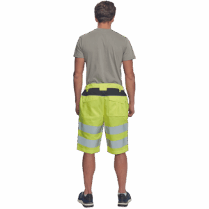 – moške delovne hlače HI-VIS z elastičnim pasom – 2 stranska žepa, 2 zadnja žepa – dve 7 cm tiskani odsevni črti na stegnih – odsevne cevi