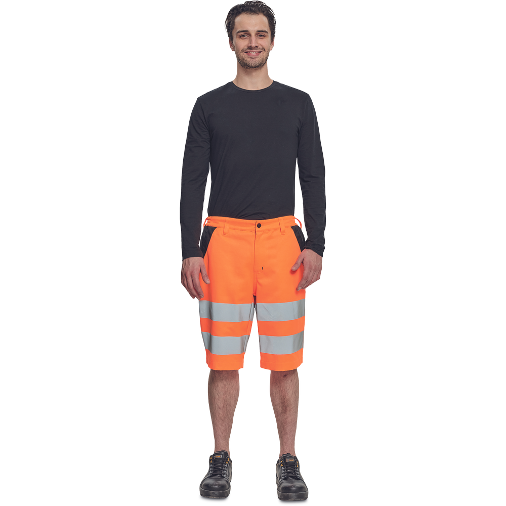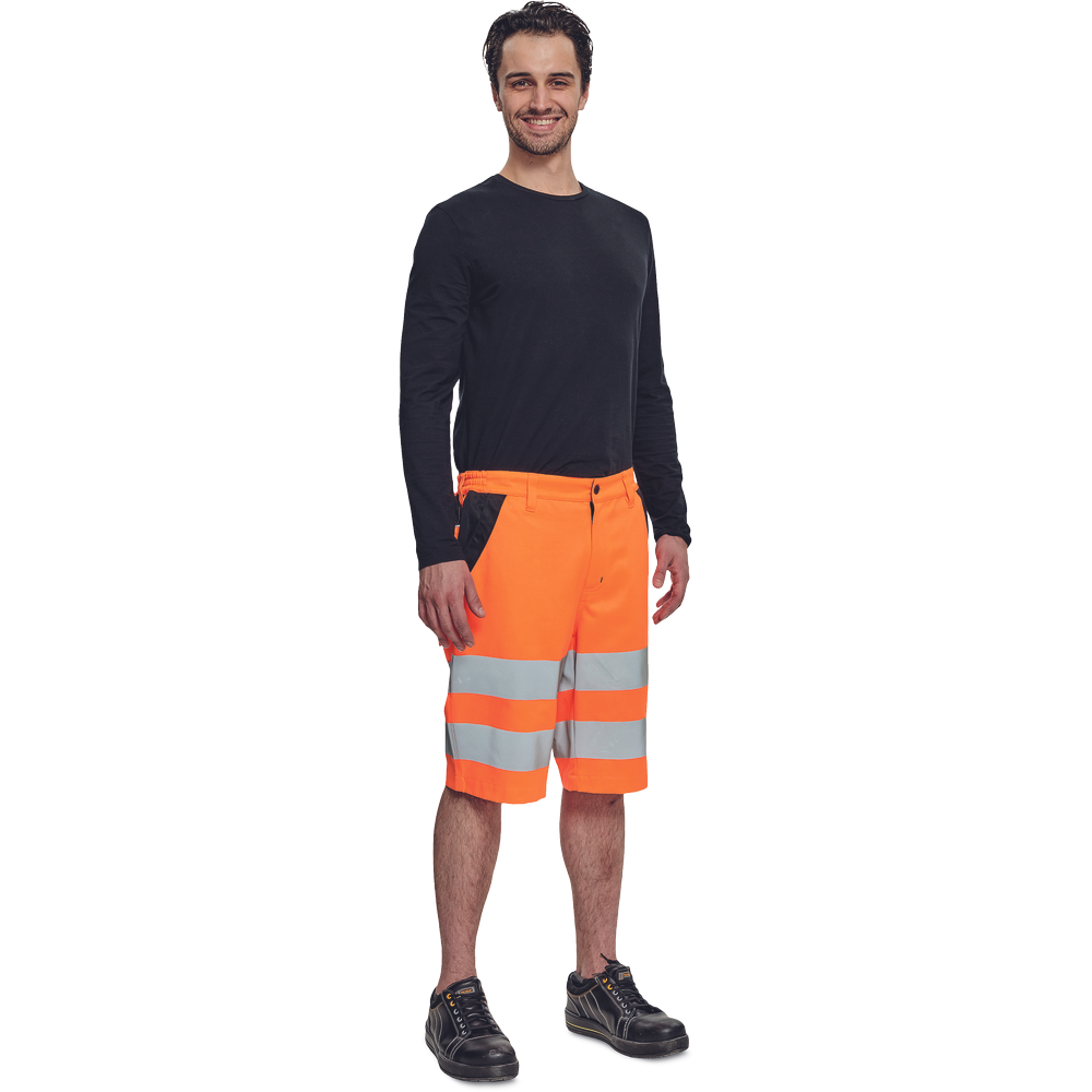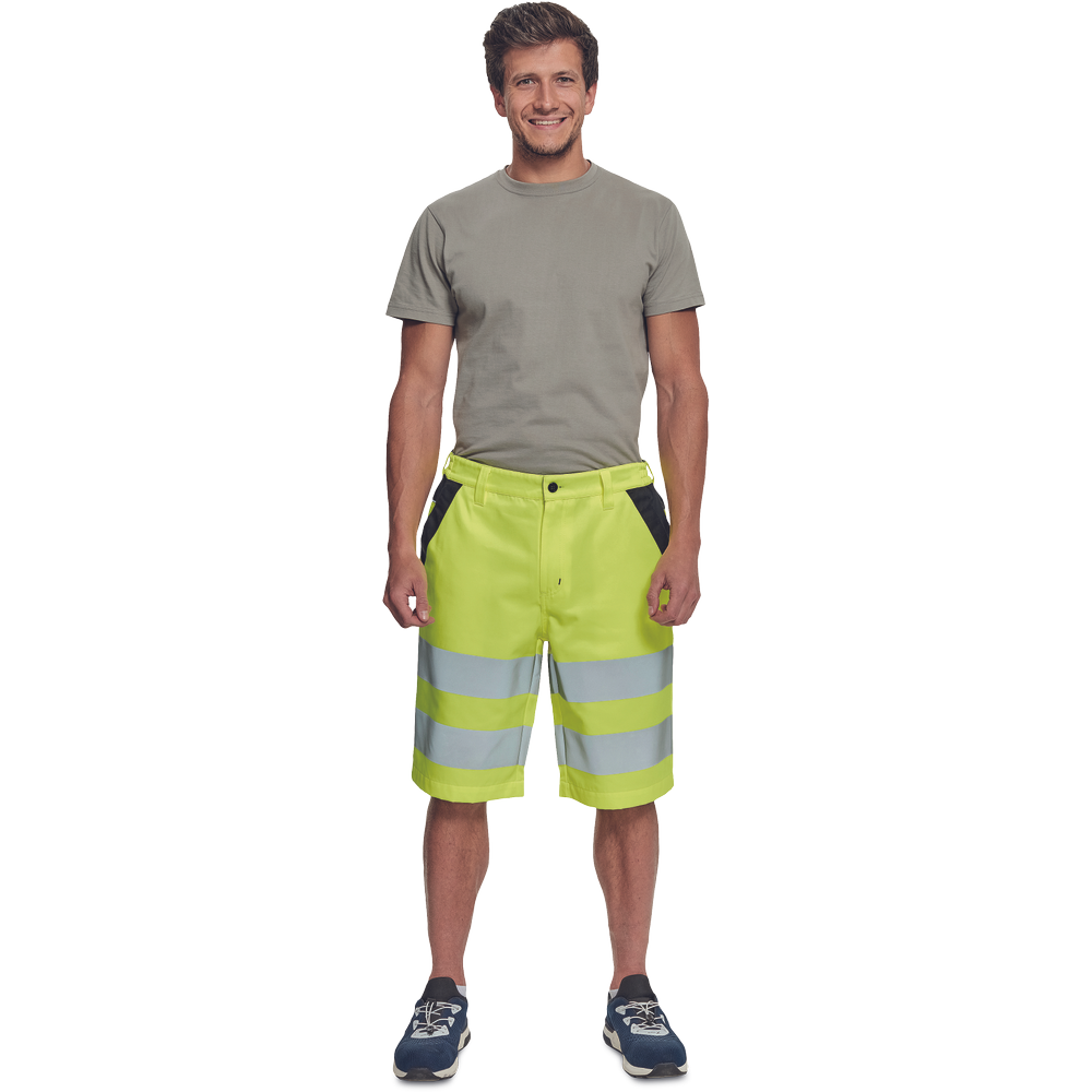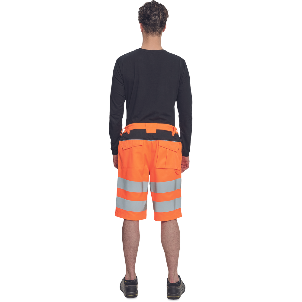 – moške delovne hlače HI-VIS z elastičnim pasom – 2 stranska žepa, 2 zadnja žepa – dve 7 cm tiskani odsevni črti na stegnih – odsevne cevi
