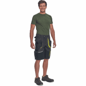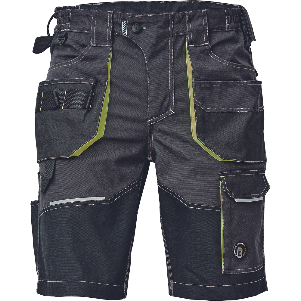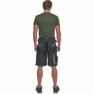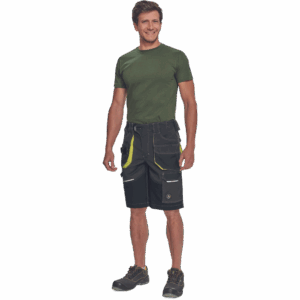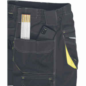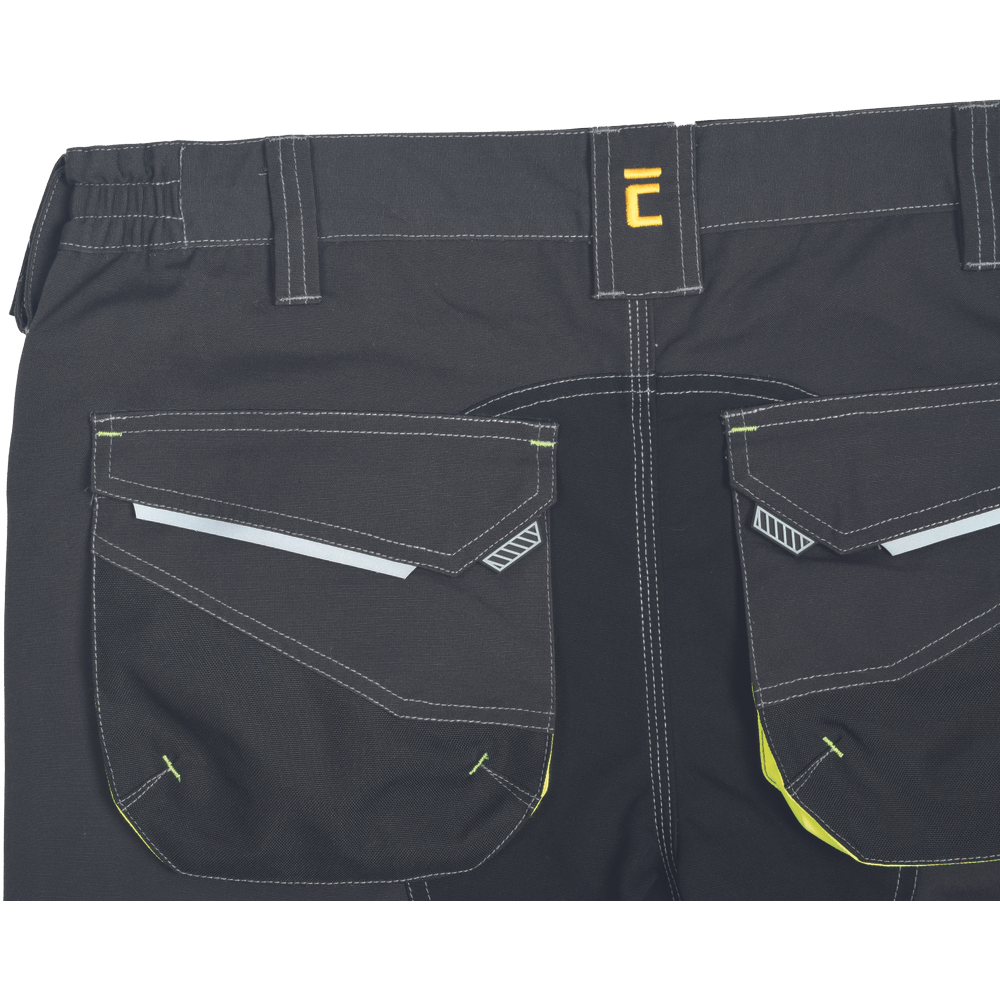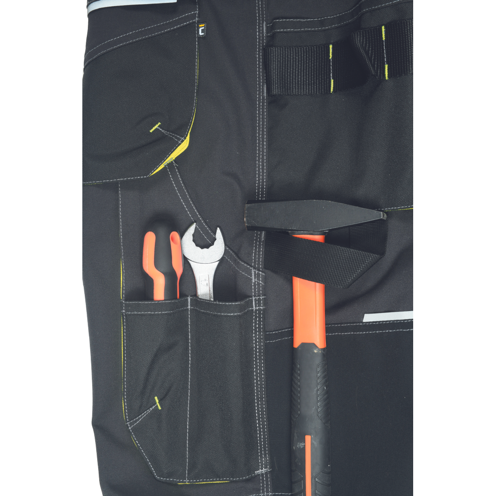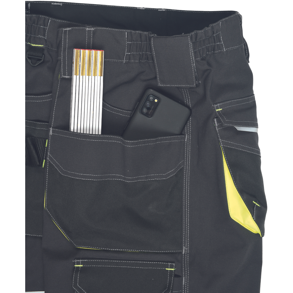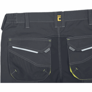 – moške delovne hlače z elastičnim pasom in večnamenskimi žepi – ojačitev spodnjih delov žepov Oxford 600D – trpežni trojni šivi na nogah in v mednožju – odsevni robovi