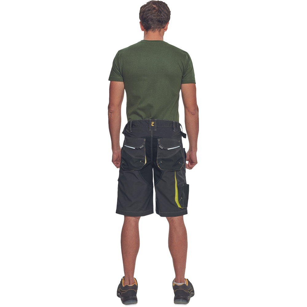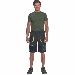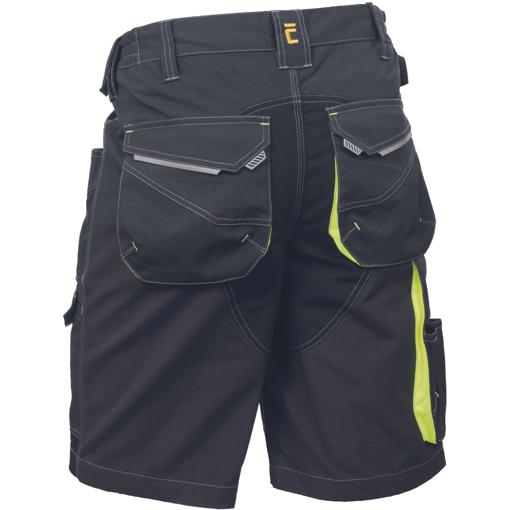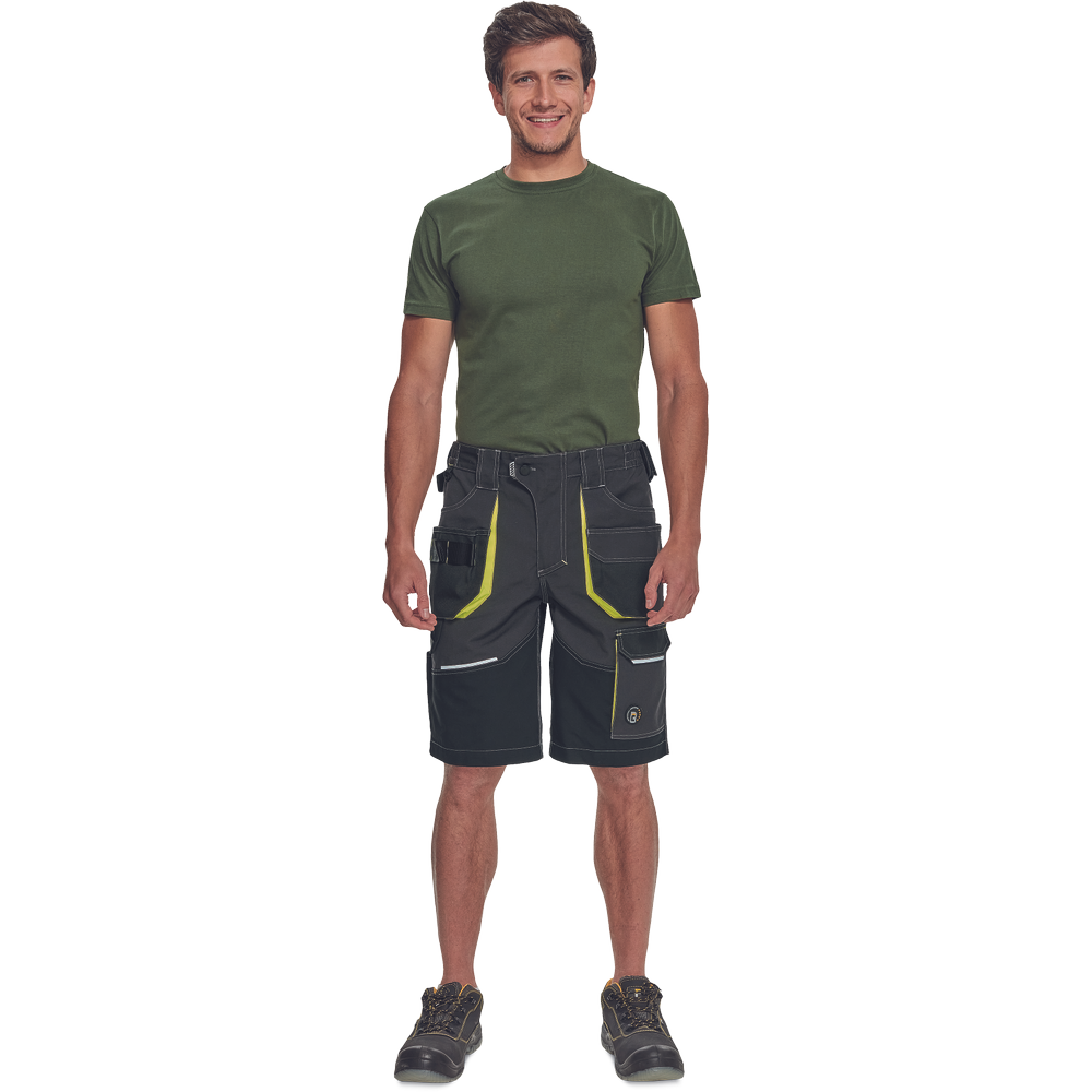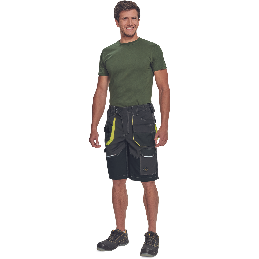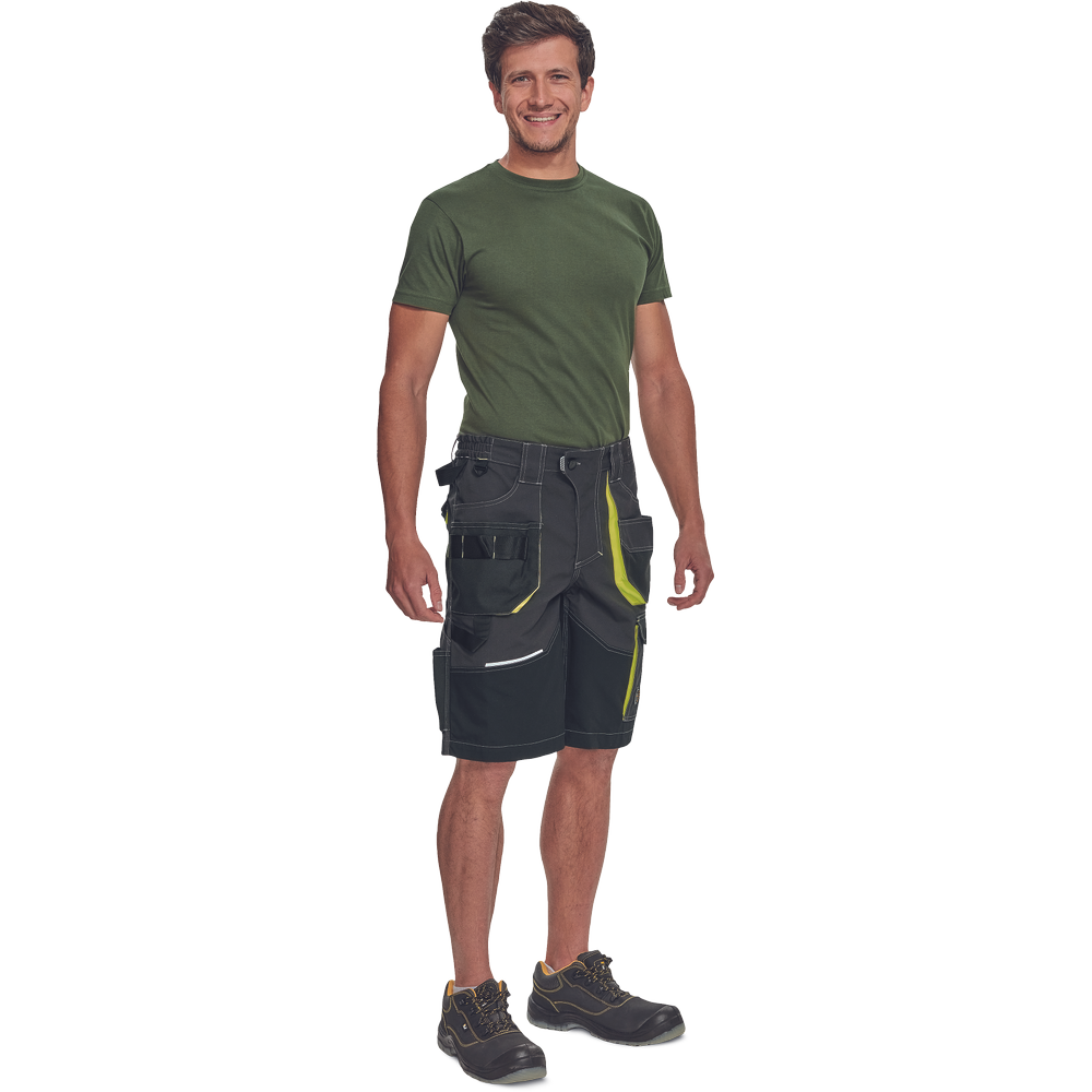 – moške delovne hlače z elastičnim pasom in večnamenskimi žepi – ojačitev spodnjih delov žepov Oxford 600D – trpežni trojni šivi na nogah in v mednožju – odsevni robovi