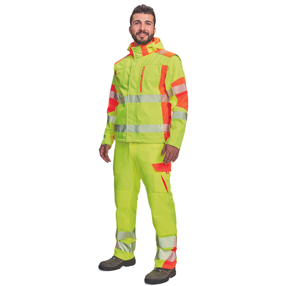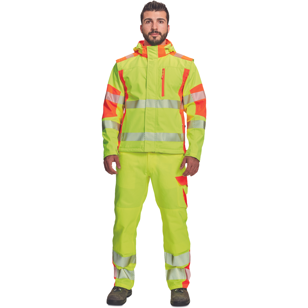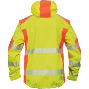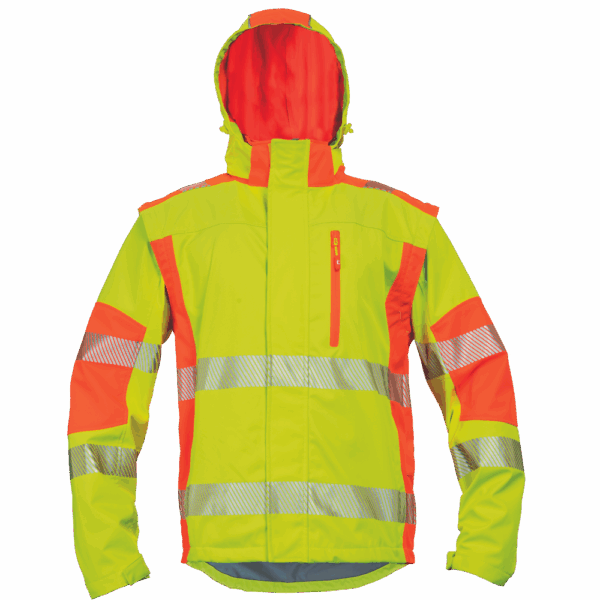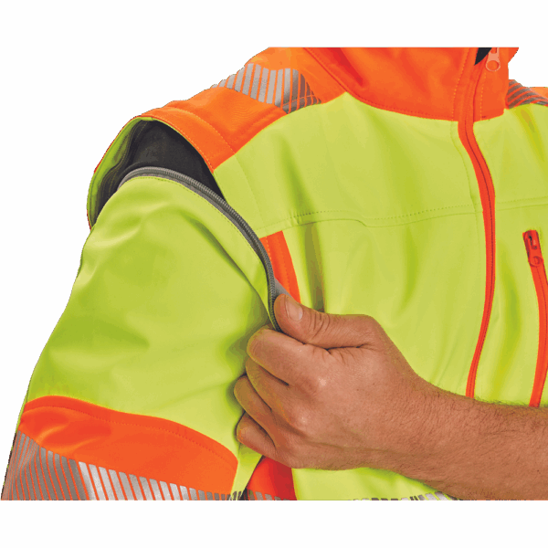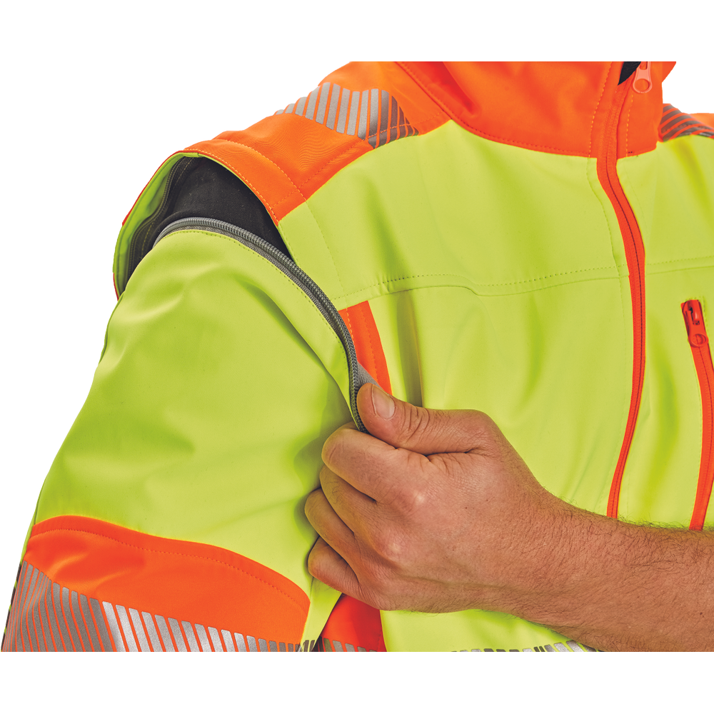 – visokokakovostna moška zračna softshell jakna s snemljivimi rokavi in kapuco – kombinacija dveh barv HI-VIS – odsevne odsevne črte okoli bokov in rokavov – vetru in vodi odporna kakovostna tkanina z membrano TPU – 2 stranska žepa na zadrgo, prsni žep na zadrgo – nastavljiv spodnji rob z vrvico – nastavljivi robovi rokavov z velcro