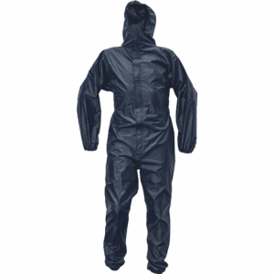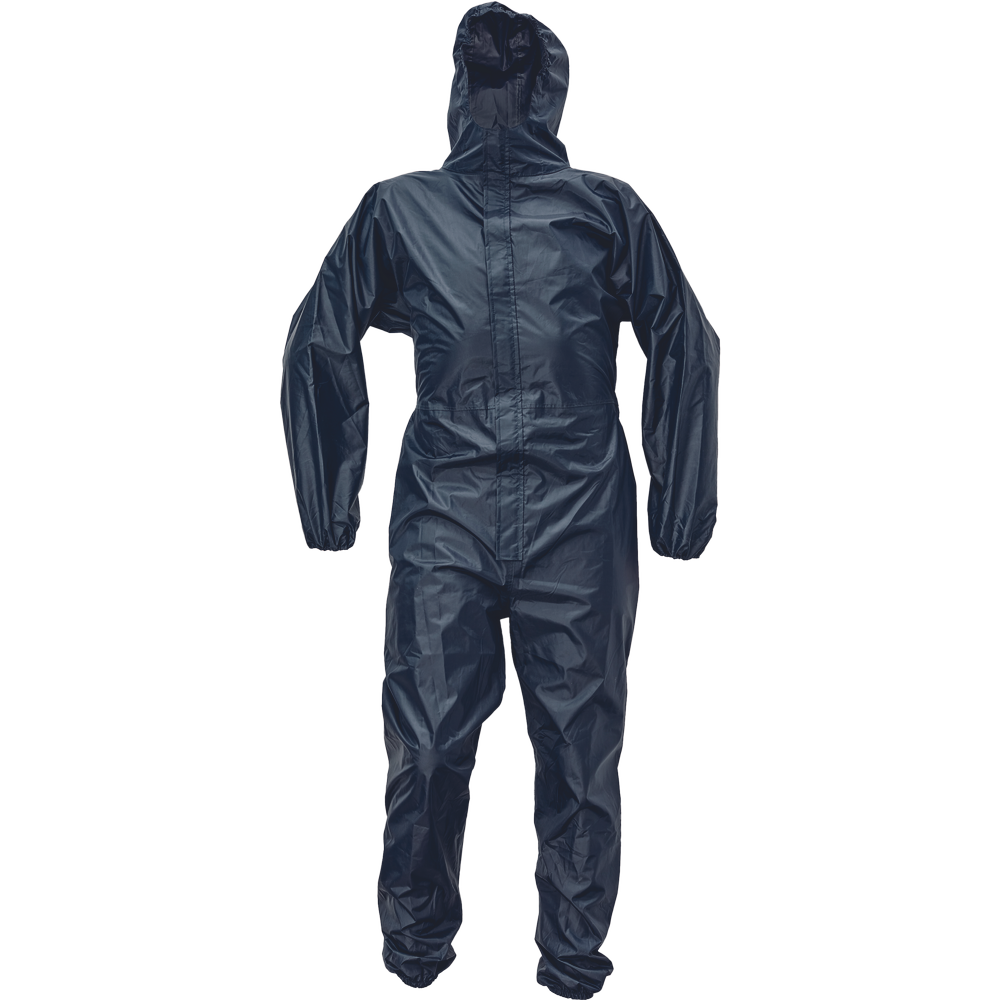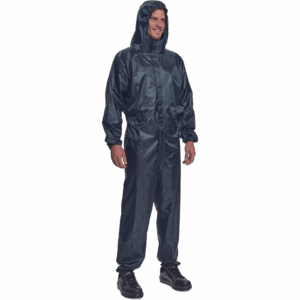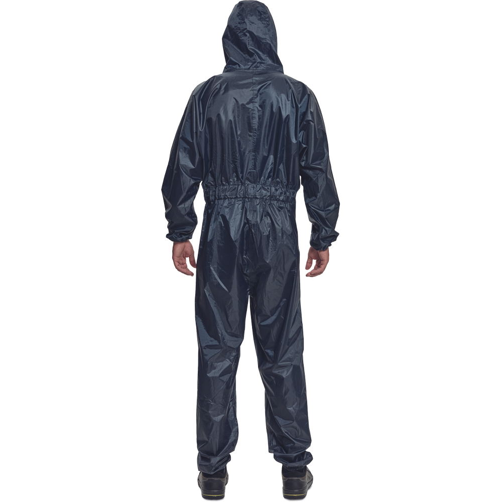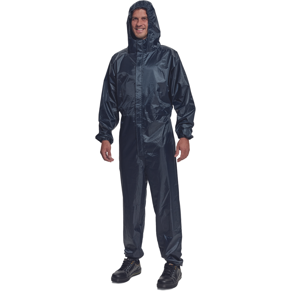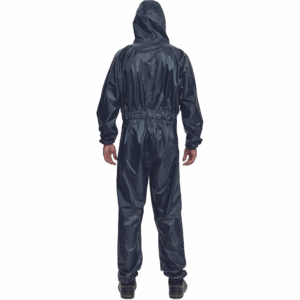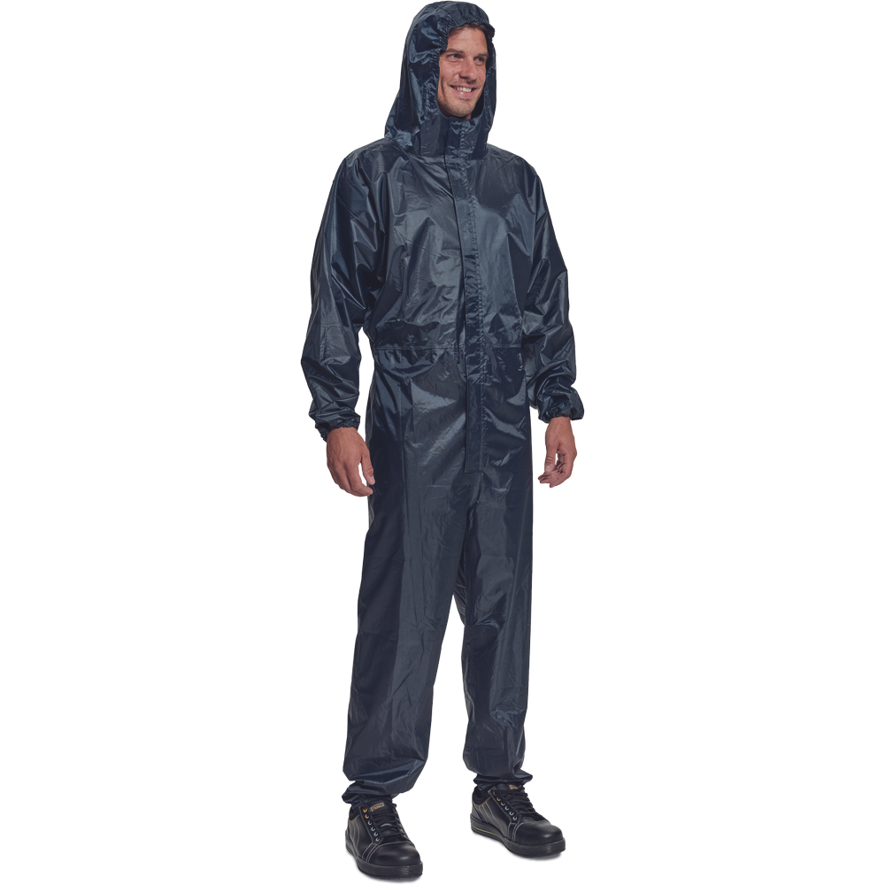 – nepremočljiv kombinezon s kapuco – sprednje zapiranje na zadrgo z velcro zavihkom – lepljeni šivi – elastičen pas, robovi rokavov, spodnji del nog in obod kapuce z gumijasto vrvico