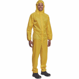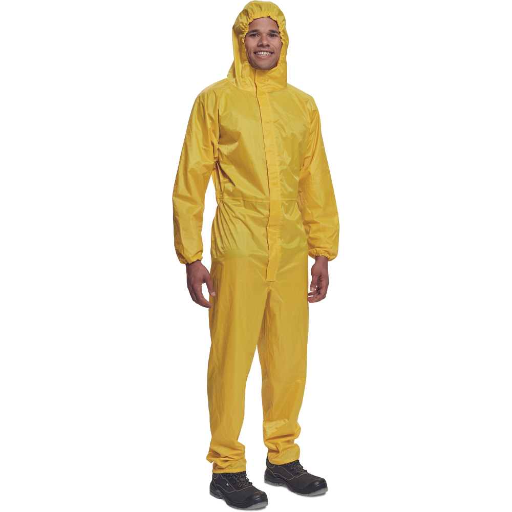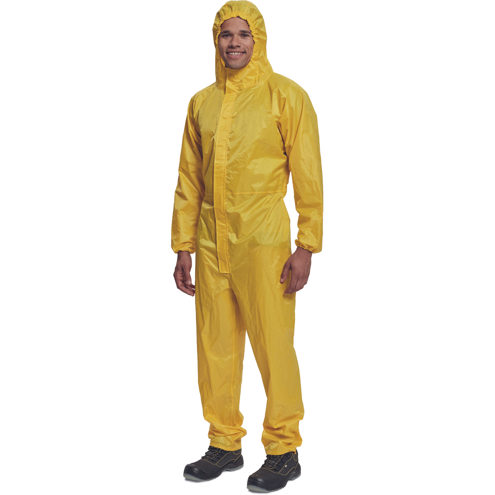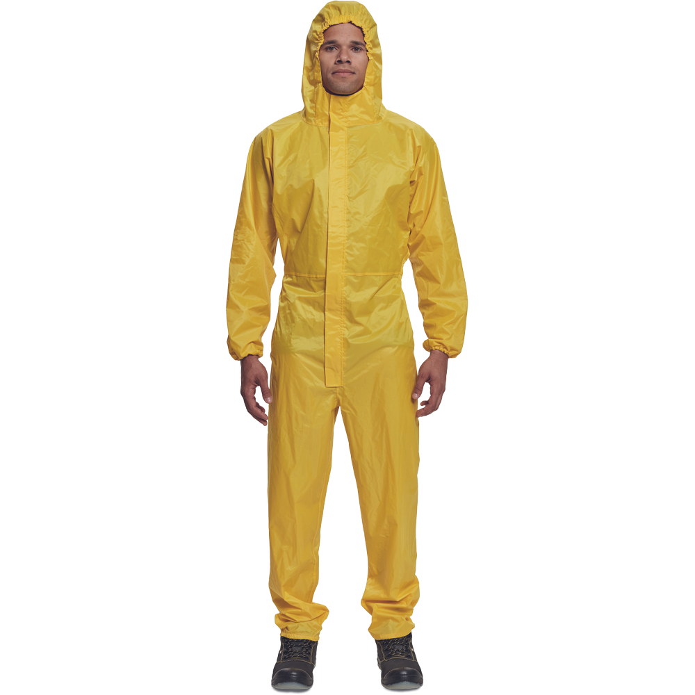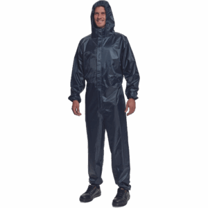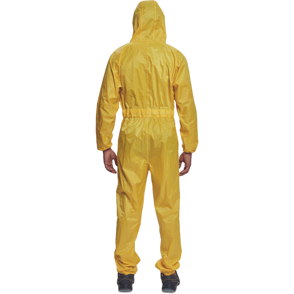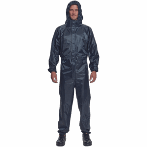 – nepremočljiv kombinezon s kapuco – sprednje zapiranje na zadrgo z velcro zavihkom – lepljeni šivi – elastičen pas, robovi rokavov, spodnji del nog in obod kapuce z gumijasto vrvico