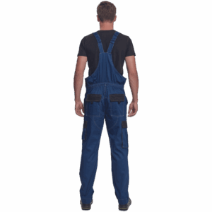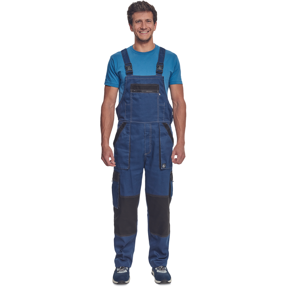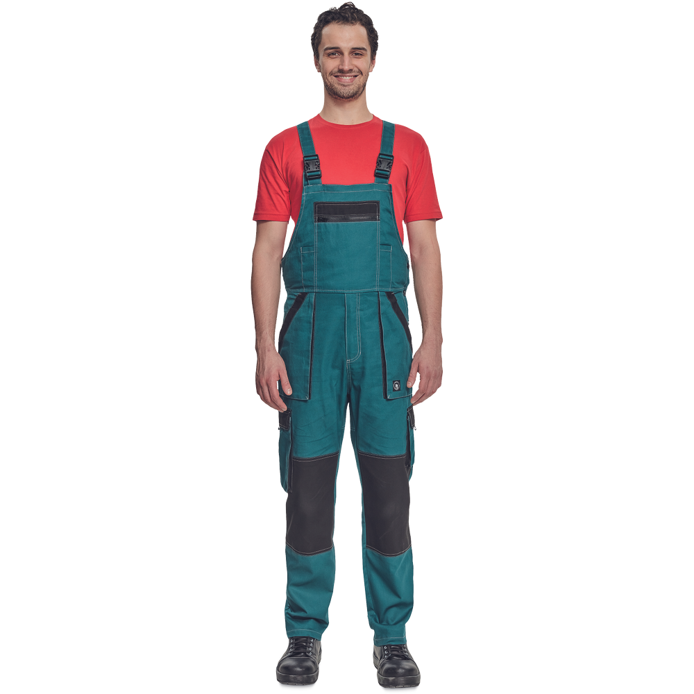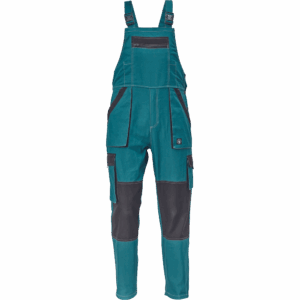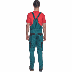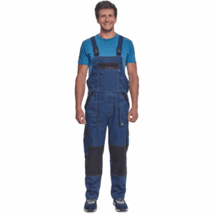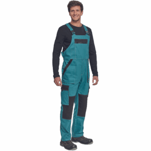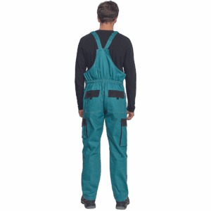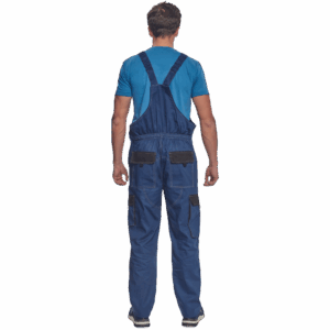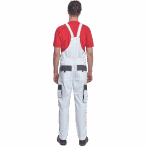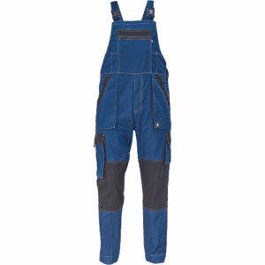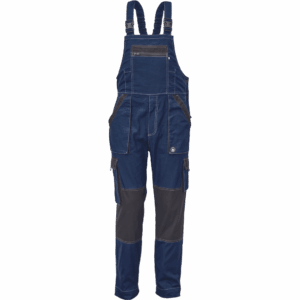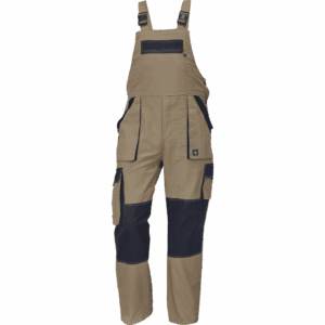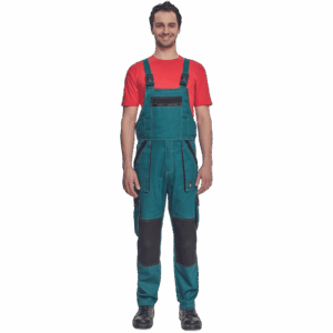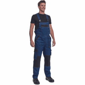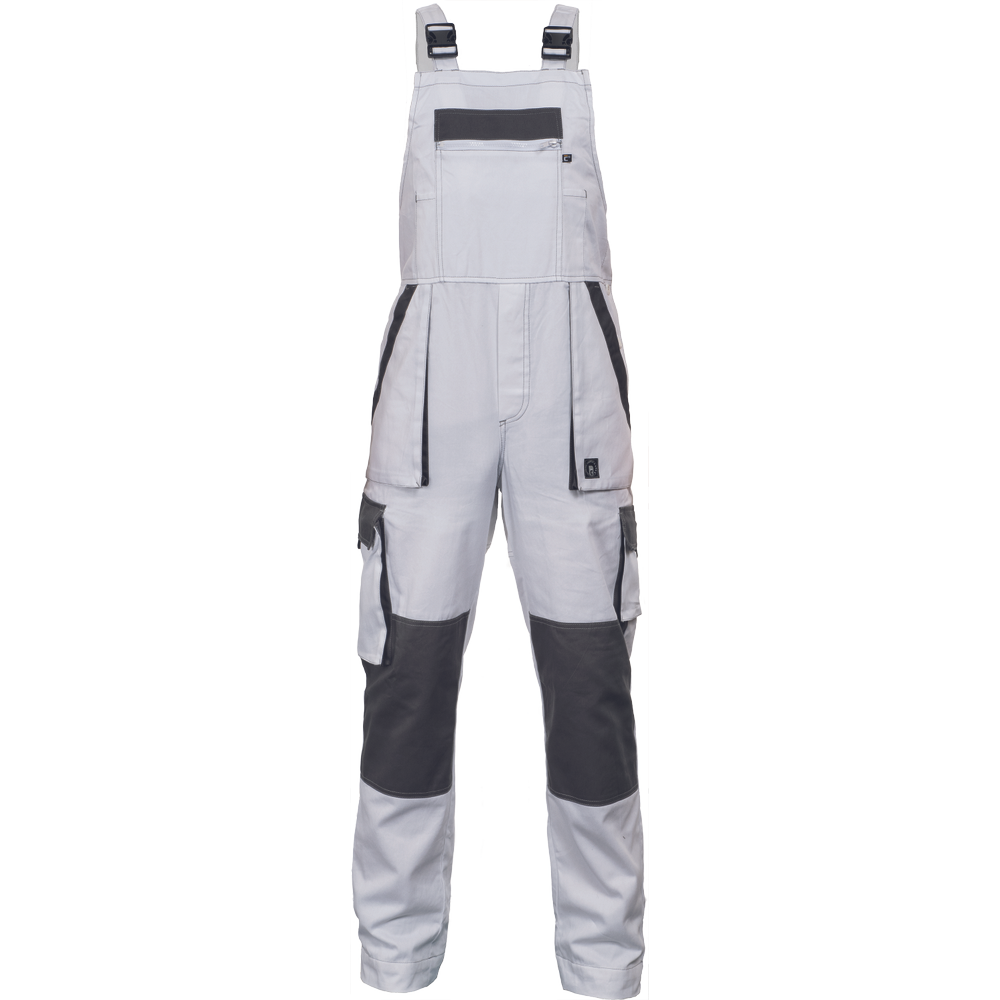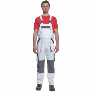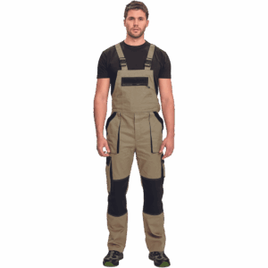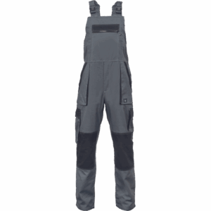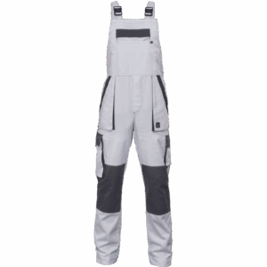 – moške lahke delovne hlače z naprsnikom z elastičnim pasom – široki naramnice s plastičnimi zaponkami – 2 stranska žepa, 2 žepa na stegnih – 1 velik prsni žep z zadrgo, 2 zadnja žepa – ojačeni deli kolen