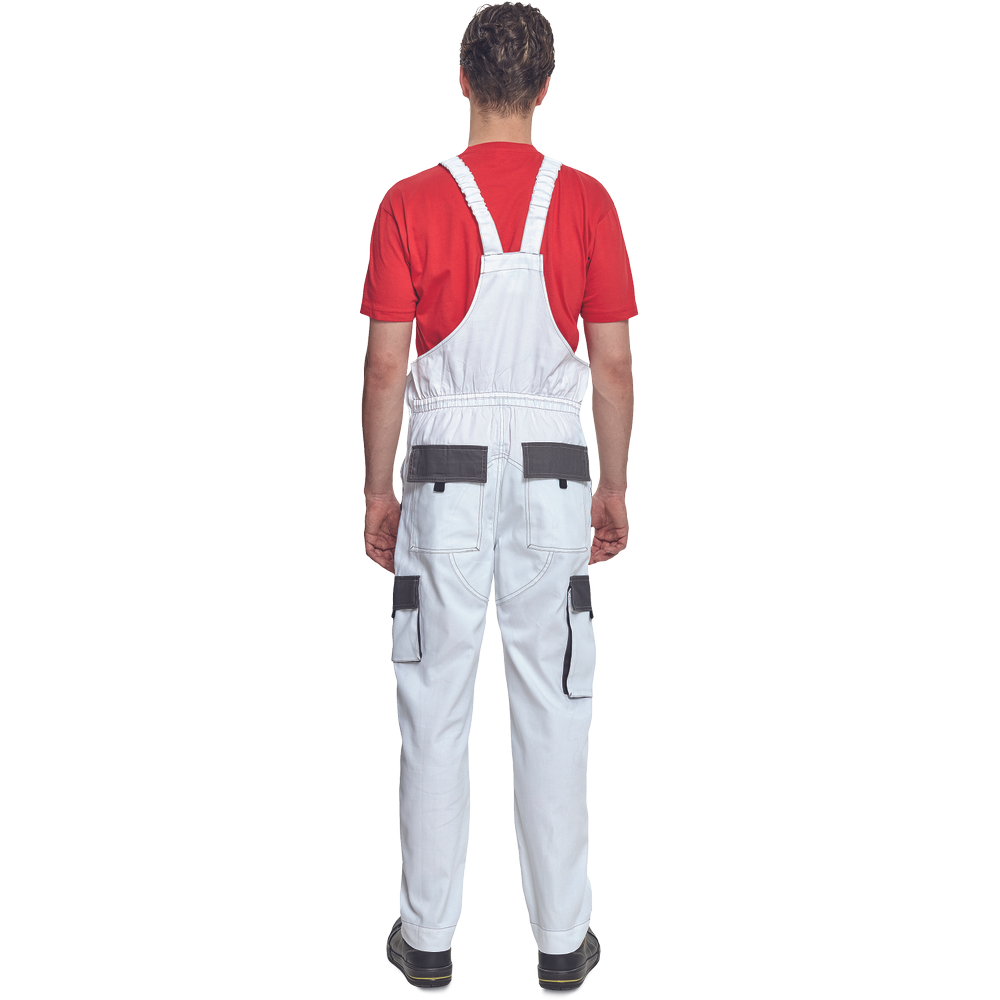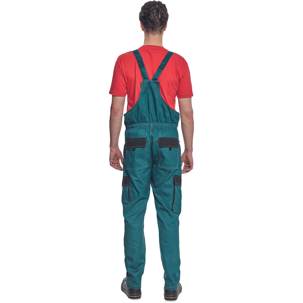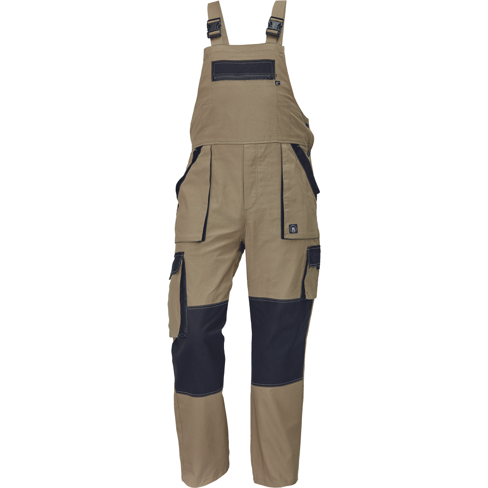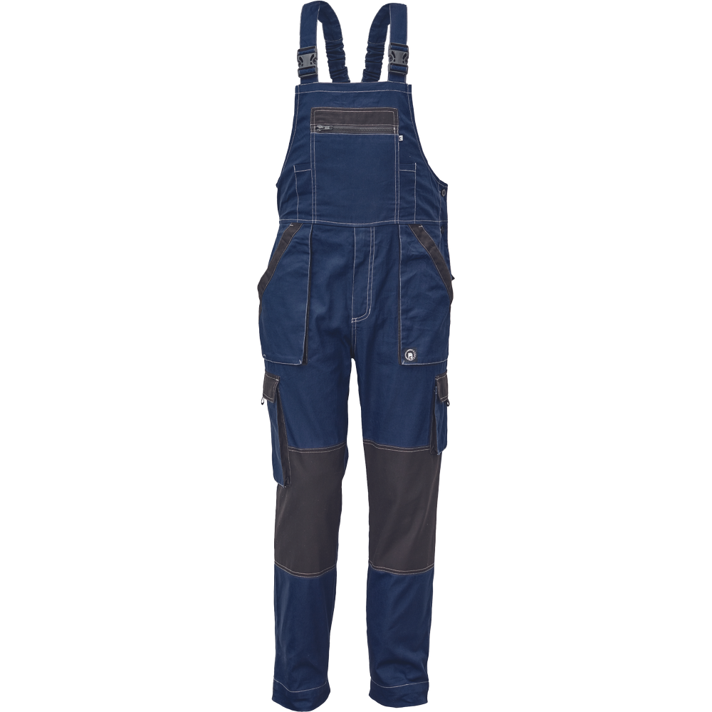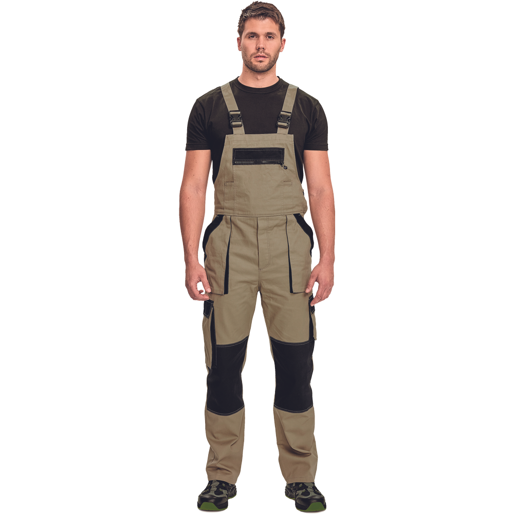 – moške lahke delovne hlače z naprsnikom z elastičnim pasom – široki naramnice s plastičnimi zaponkami – 2 stranska žepa, 2 žepa na stegnih – 1 velik prsni žep z zadrgo, 2 zadnja žepa – ojačeni deli kolen