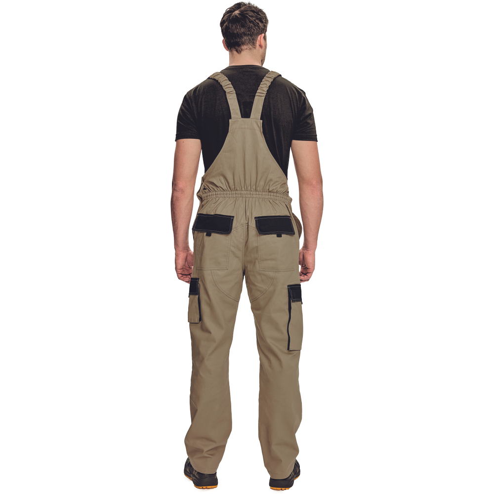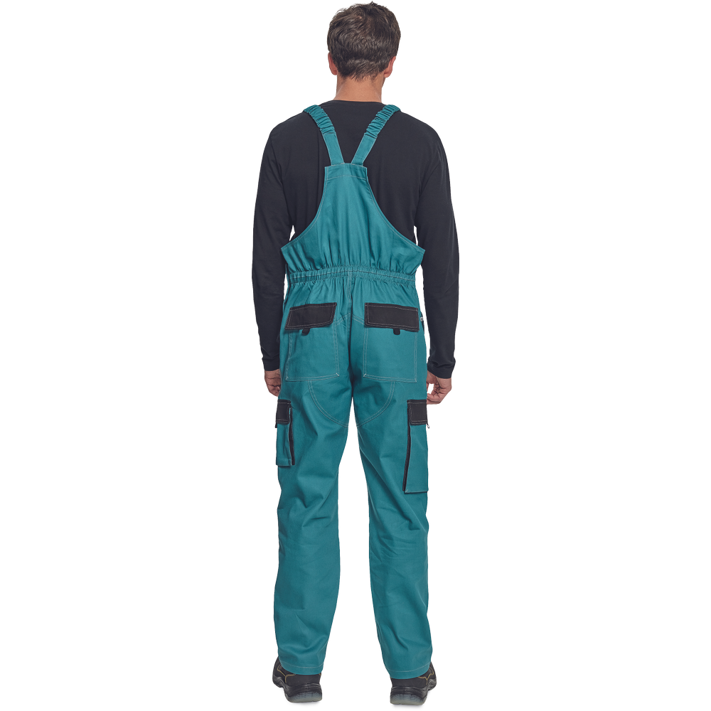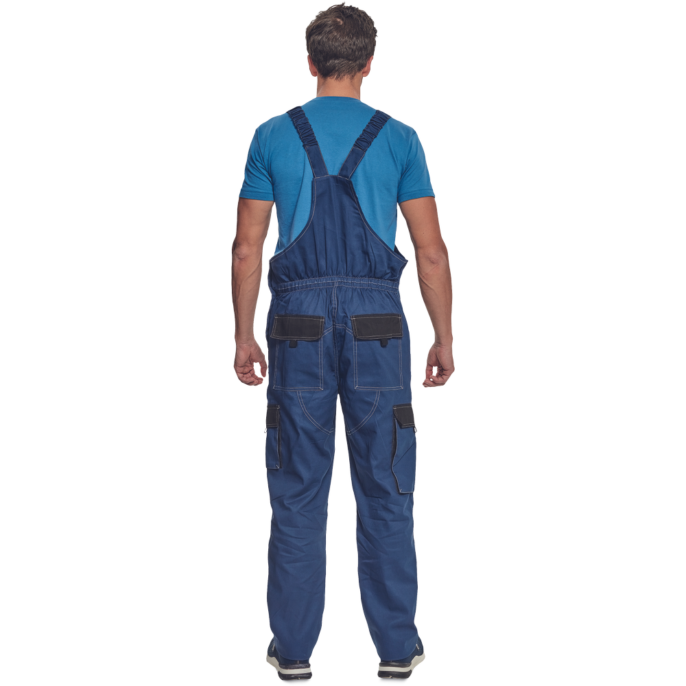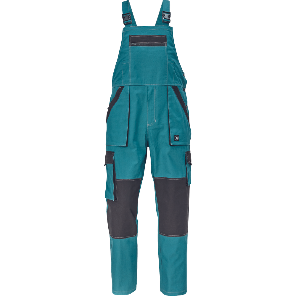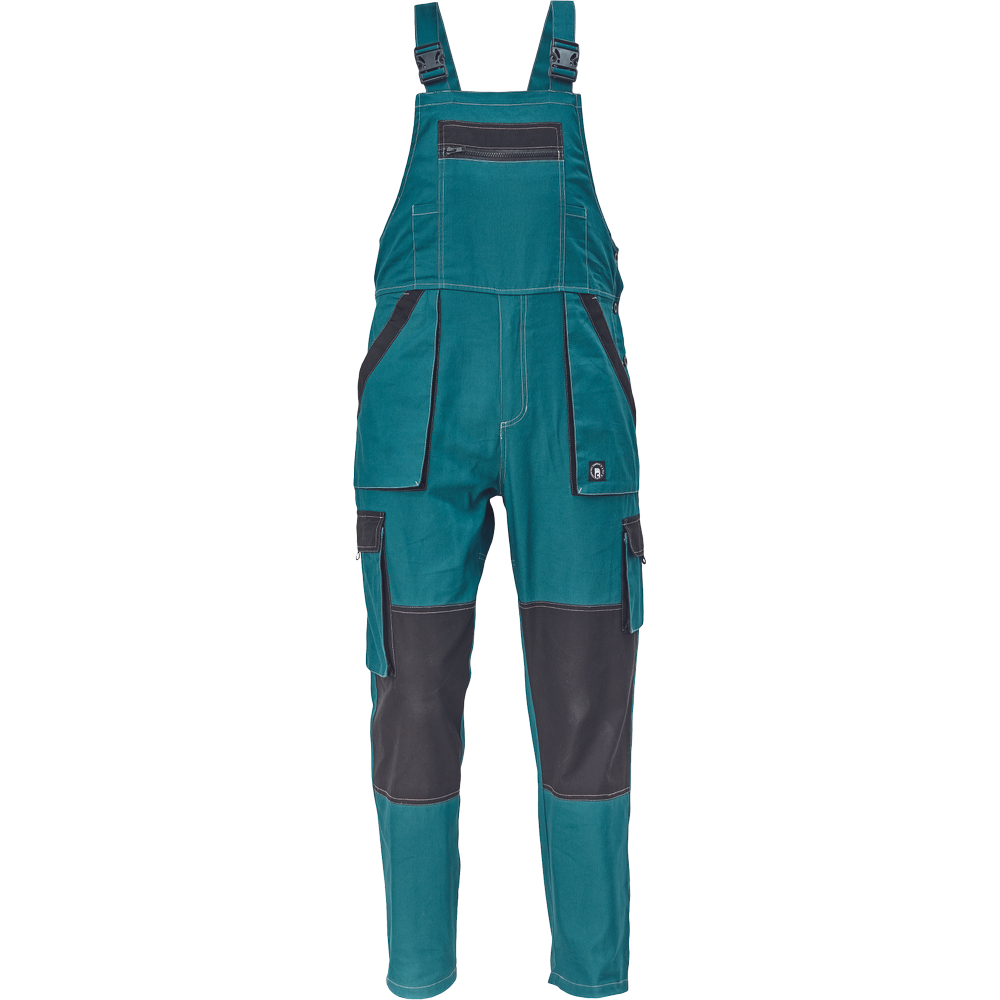 – moške lahke delovne hlače z naprsnikom z elastičnim pasom – široki naramnice s plastičnimi zaponkami – 2 stranska žepa, 2 žepa na stegnih – 1 velik prsni žep z zadrgo, 2 zadnja žepa – ojačeni deli kolen