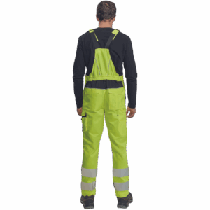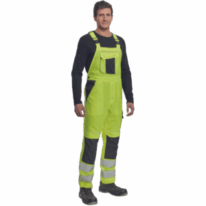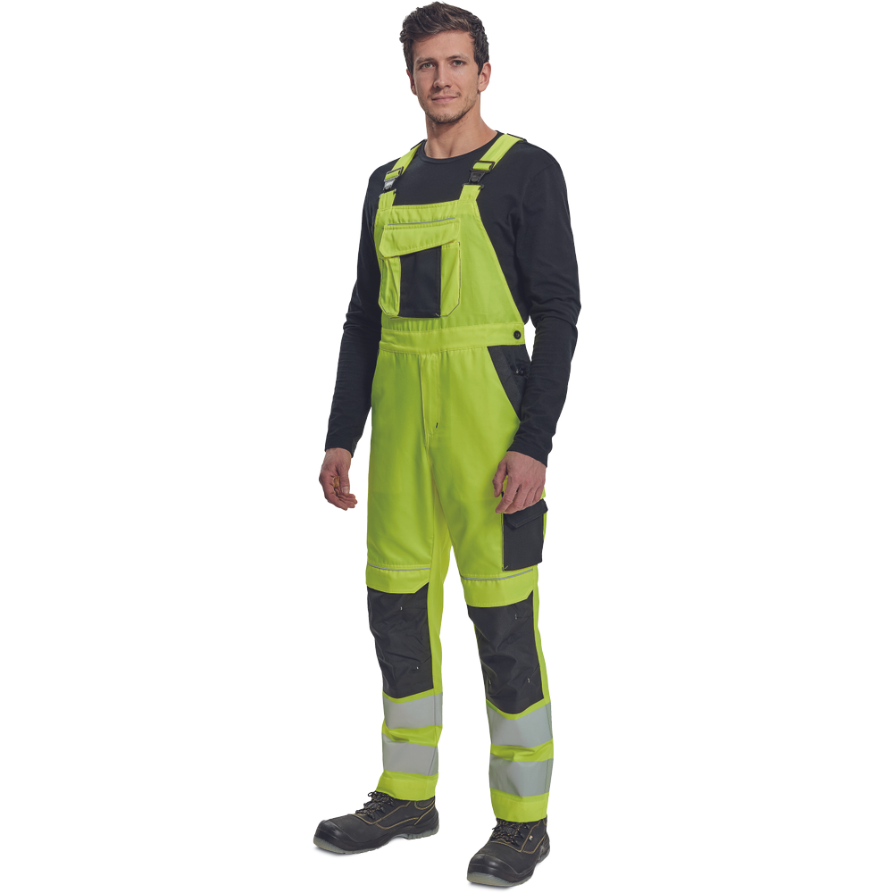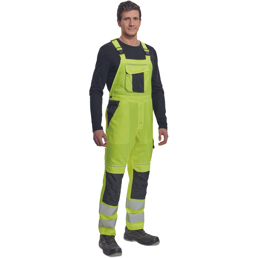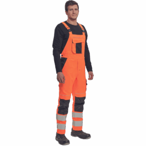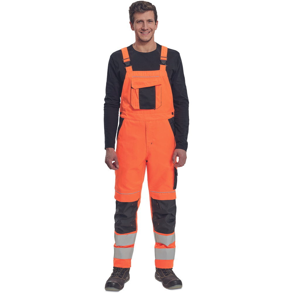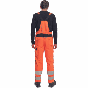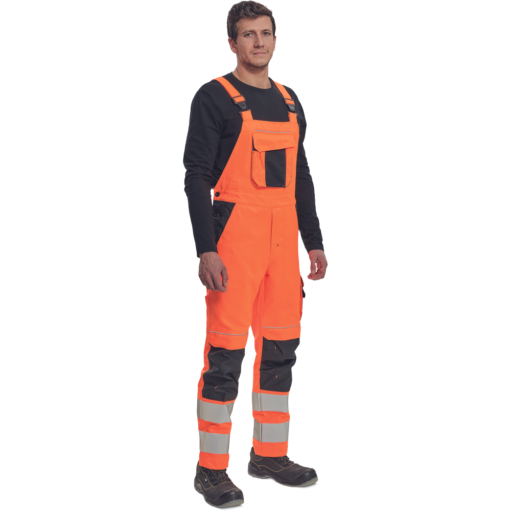 – moške delovne hlače z naprsnikom HI-VIS z elastičnim pasom – široki naramnice s plastičnimi zaponkami – 2 stranska žepa, 1 dvojni žep na levem stegnu – 1 velik prsni žep, 2 zadnja žepa, 2 mala zadnja žepa na desnem stegnu – dve 7,5 cm tiskani odsevni črti na spodnjih delih nog, odsevne cevi – ojačeni deli kolen Oxford 600D z žepi z zavihki za vstavljanje kolenskih blazinic – možnost podaljšanja dolžine nog.