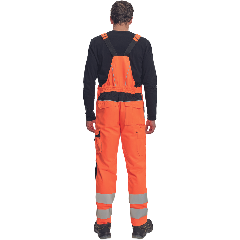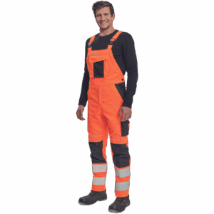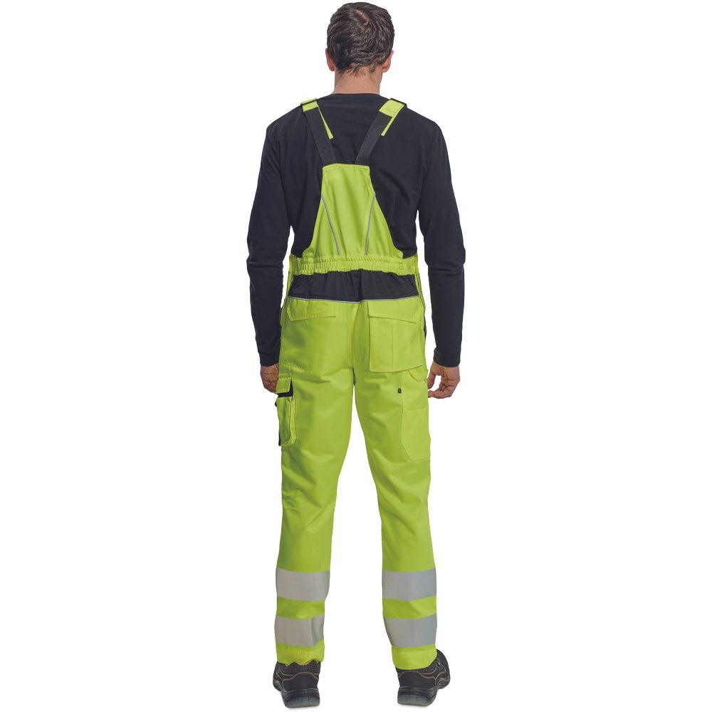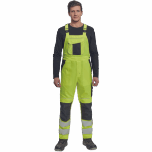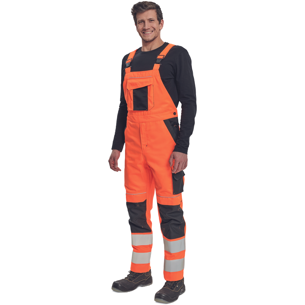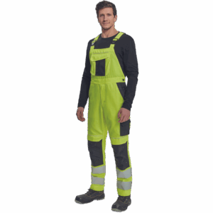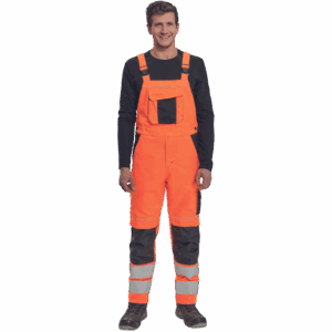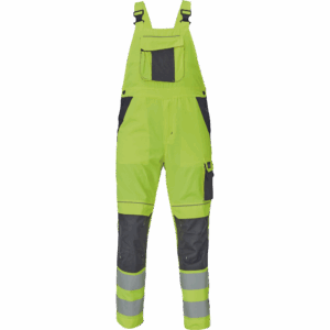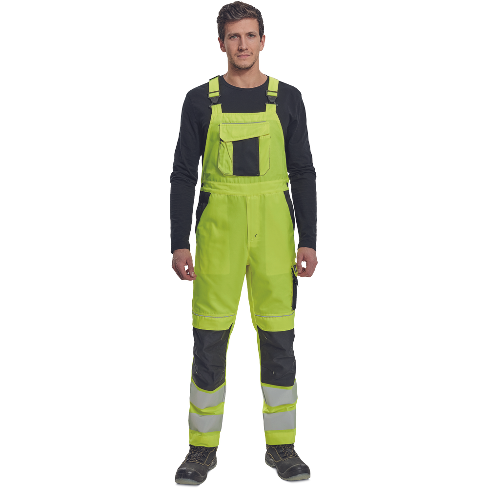 – moške delovne hlače z naprsnikom HI-VIS z elastičnim pasom – široki naramnice s plastičnimi zaponkami – 2 stranska žepa, 1 dvojni žep na levem stegnu – 1 velik prsni žep, 2 zadnja žepa, 2 mala zadnja žepa na desnem stegnu – dve 7,5 cm tiskani odsevni črti na spodnjih delih nog, odsevne cevi – ojačeni deli kolen Oxford 600D z žepi z zavihki za vstavljanje kolenskih blazinic – možnost podaljšanja dolžine nog.