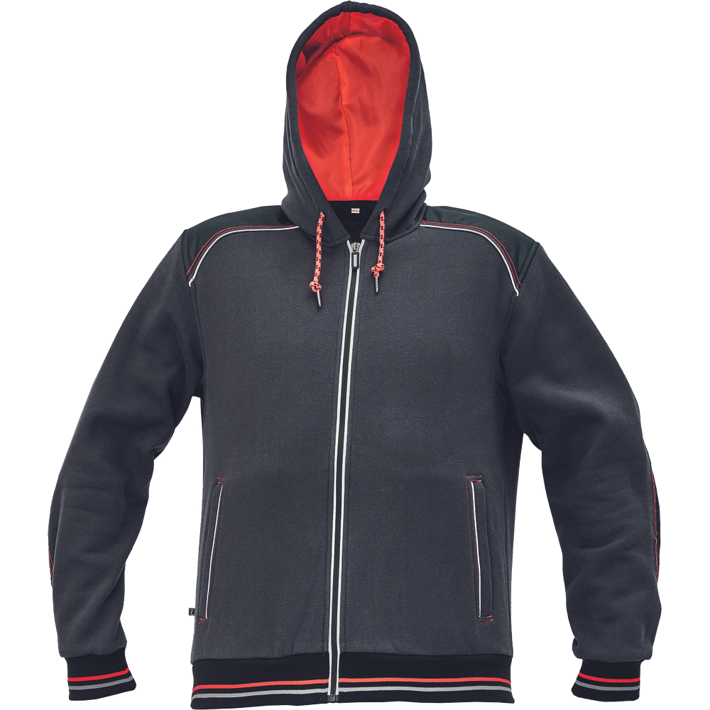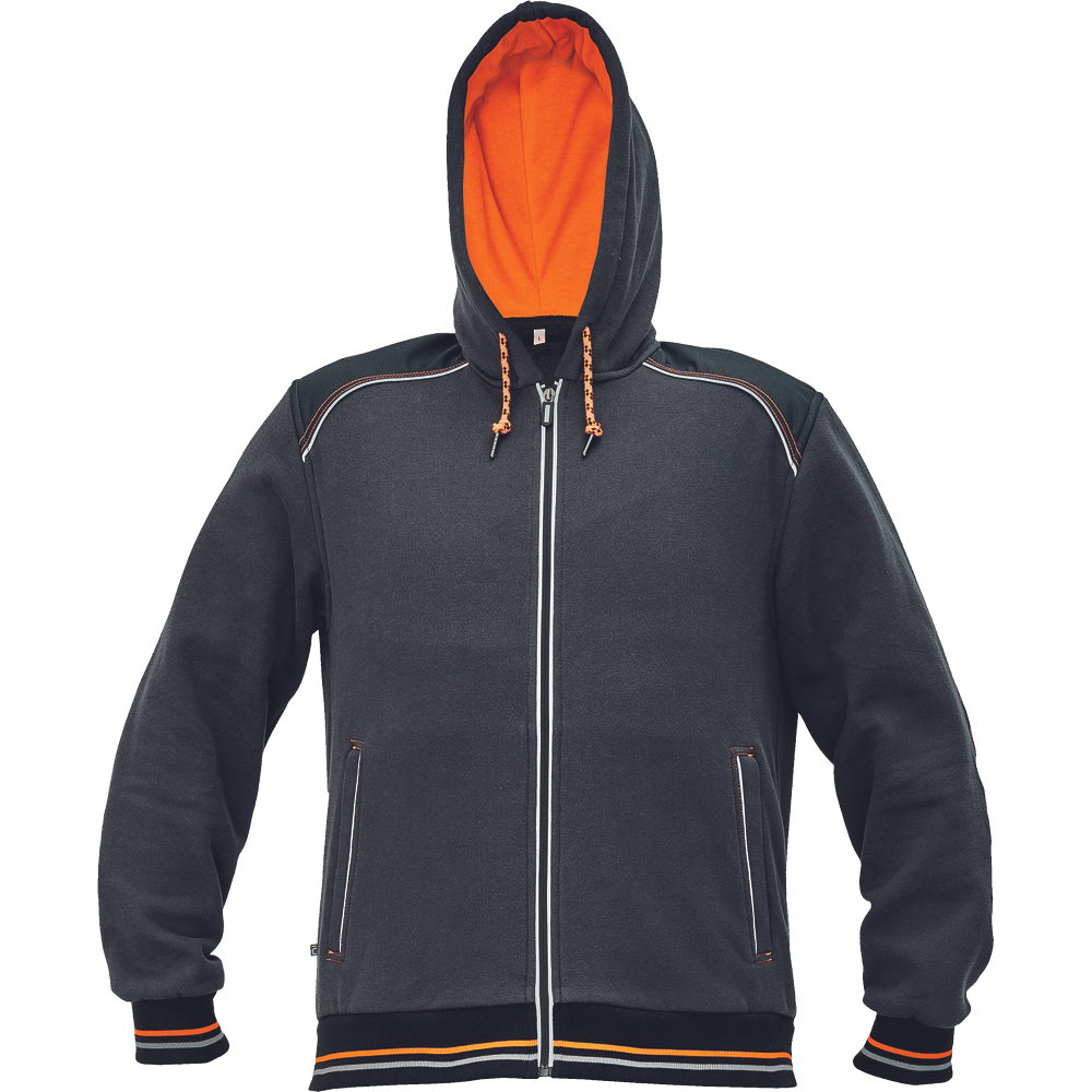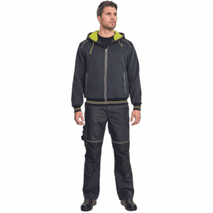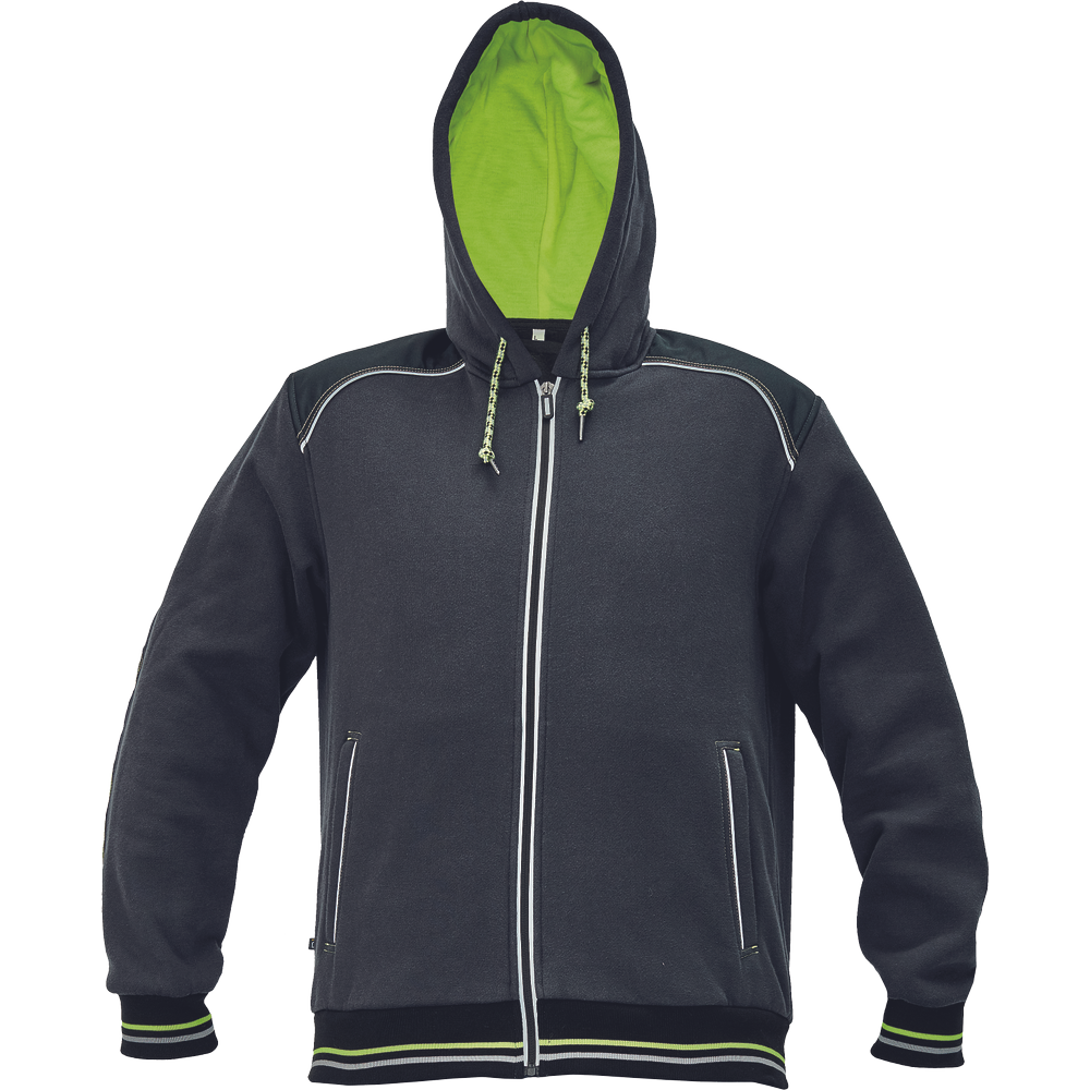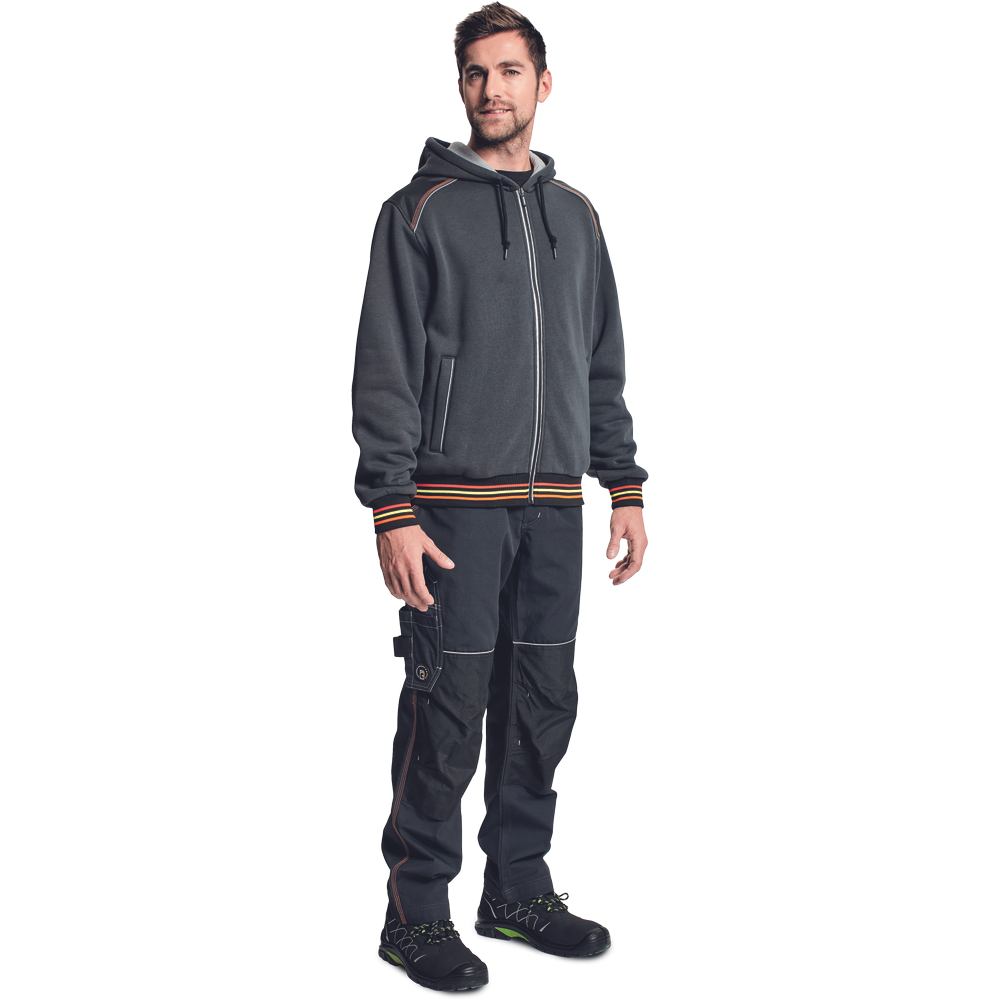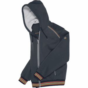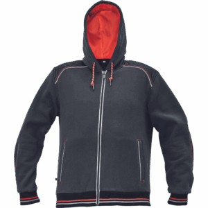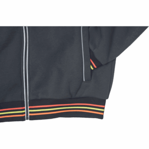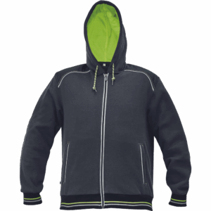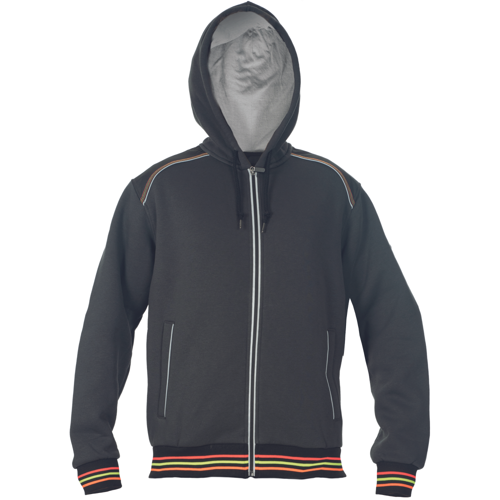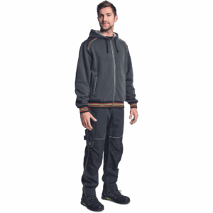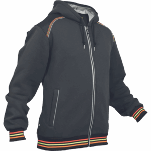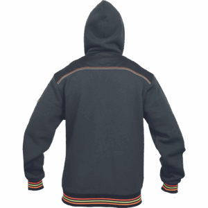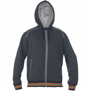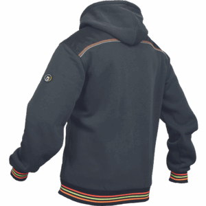 – moška kapuca z zadrgo iz mešanice bombaža in poliestra, francoski frotir, ki ni brušen – ojačana ramena in komolci – sedelni in stranski žepi podloženi z odsevnimi trakovi – dvoslojna kapuca z nastavitvijo obsega s čipko – okrasni tribarvni šivi – elastični robovi na rokavih in dnu