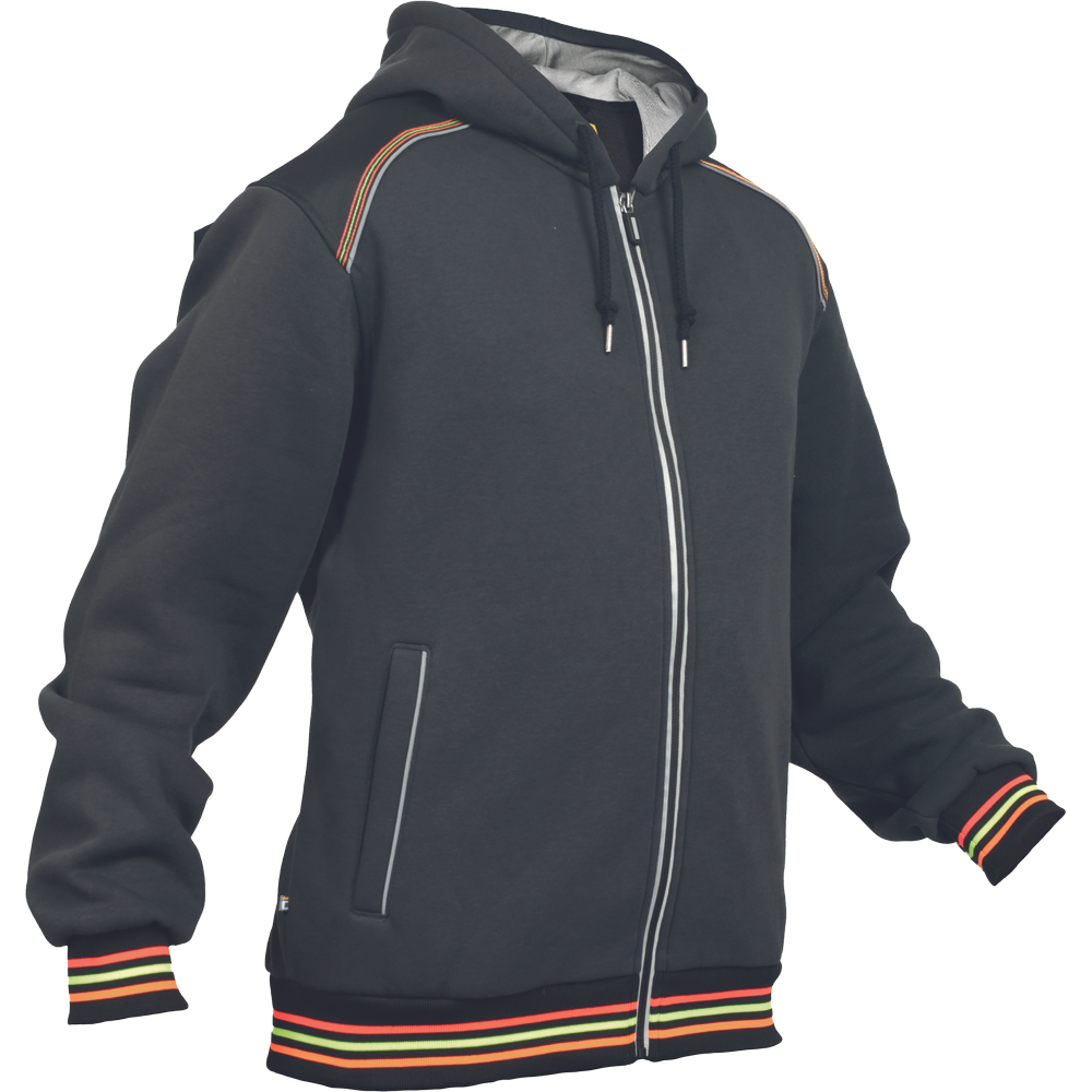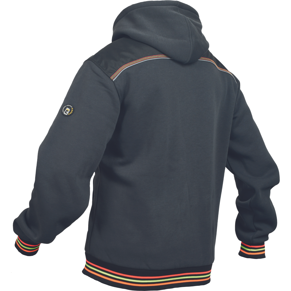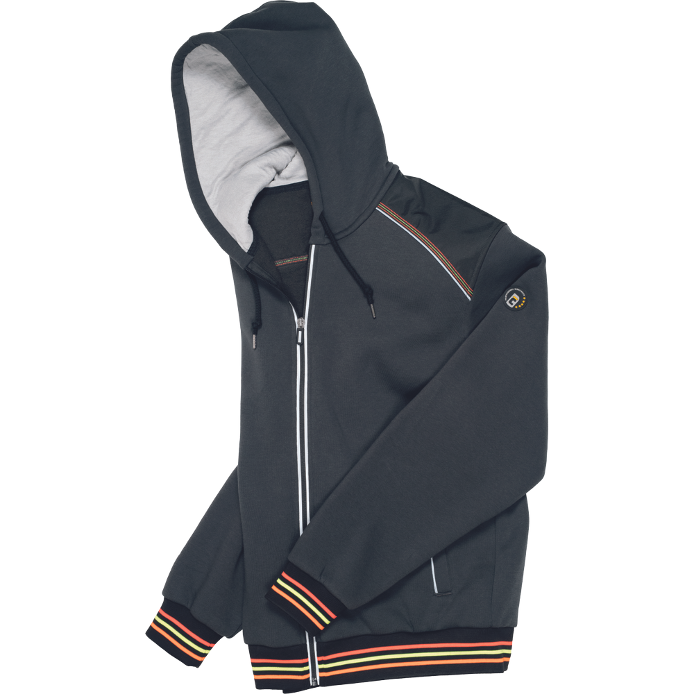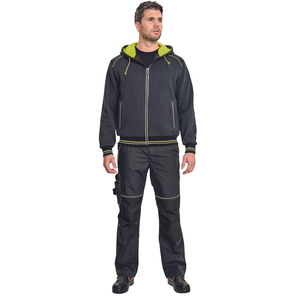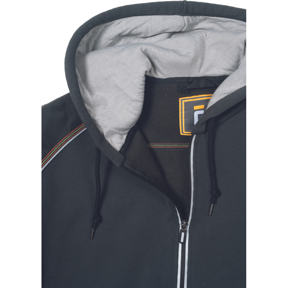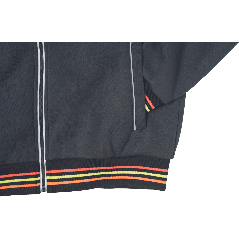 – moška kapuca z zadrgo iz mešanice bombaža in poliestra, francoski frotir, ki ni brušen – ojačana ramena in komolci – sedelni in stranski žepi podloženi z odsevnimi trakovi – dvoslojna kapuca z nastavitvijo obsega s čipko – okrasni tribarvni šivi – elastični robovi na rokavih in dnu