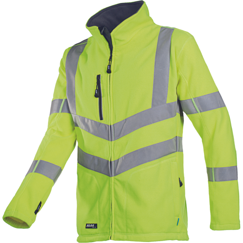 Jakna iz flisa Hi-Vis vas ščiti pred mrazom; raven ovratnik; visokokakovostna zadrga YKK z zaščito brade; 1 vstavljen prsni žep z zadrgo; 2 vstavljena žepa z zadrgo; 1 notranji žep; elastična vrvica na spodnjem robu in rokavih; trdna podloga vetrovke spredaj in zadaj